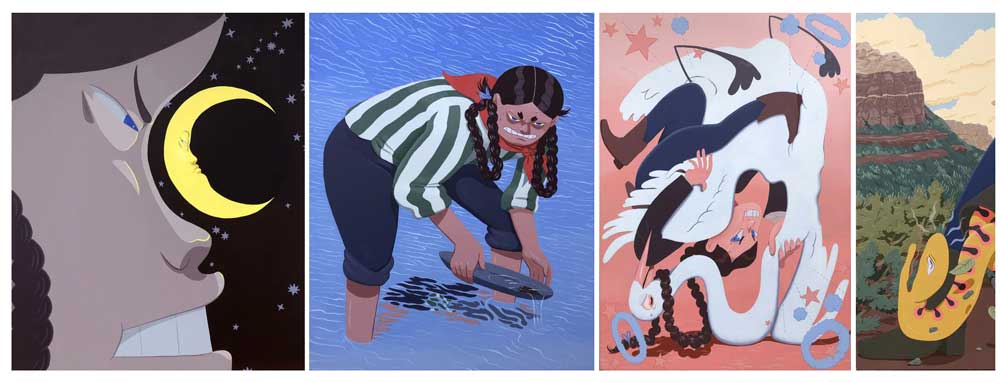 Interestingly, almost all of the images are framed by a patterned border that creates an illustrative quality and adds to the otherworldly atmosphere. For example, one painting depicts a giant two-headed snake wrapped around what looks like a two-headed hyena. Both animals are baring their teeth as if poised for attack and while they are precisely rendered in the artist’s signature style, there is a huge amount of power contained within their bodies. Meanwhile, visible brushstrokes in the blue background create a sense of movement and depth – it’s as if the creatures are tumbling through the night-sky or the depths of the ocean. In this sense, the border around the edge of the canvas serves to both contain the dynamism and elevate the image to an almost spiritual status.