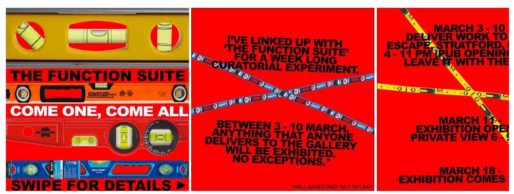 “‘The Function Suite’ is a plucky, DIY project space in Stratford connected to The Escape Bar, programmed by Nathan Baumber. The gallery is kicking off its year of shows with a curatorial experiment from artist Taro Qureshi titled ‘Come One, Come All.’ The premise is this – anything goes.* Whatever arrives at The Escape, Stratford during the allocated period- will be lovingly hung and curated into a mega group show. A truly open open call. *wall-based and 1m x 1m limit. We are flexible, however. Here’s the timings: Mar 3-10: Deliver work to The Escape, Stratford, E15 4PH, 4-11PM each day (pub opening times.) Leave it with the bar. Mar 11 – The show opens with a private view, 6-9PM. Mar 18 – Deinstall. Doesn’t matter if you’re a professional, an amateur, whether you paint on Sundays, Mondays or paydays. For more information, or for any questions, DM Taro on Instagram @tarojq. Also head there to see a picture of the space…” Watch this space for further coverage as it all evolves