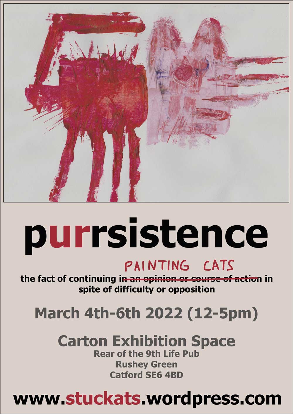 4: Purrsistance, Painting Cats, Carton Exhibition Space, Catford – 4th to 6th March at Carton Exhibition Space, Rear of the Ninth Life Pub, Rushey Green, Catford, London SE6 4BD. open Midday until 5pm on all three cat-filled days. Expect paintings of cats. Artists taking part include Donald Takeshita-Guy, Yumi Takeshita-Guy, Charles Thomson, Eamon Everall, Sean Worrall, Emma Harvey, Wolf Howard, Jasmine Surreal, Mark D, Matt King, Jaqui Yebra, Laura Erviti and…