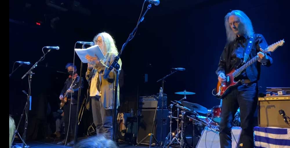 “After being moved by watching a video of Ukrainian woman singing the Ukrainian National Anthem while cleaning broken glass and debris from her bombed apartment, Patti Smith decided to do her English version of the Ukrainian National Anthem at the Lenny Kaye Birthday Bash at the Bowery”