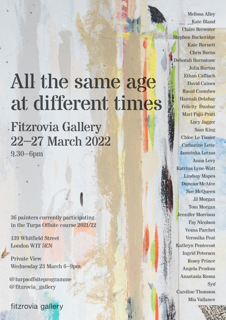 2: All the same age at different times at Fitzrovia Gallery, 22 – 27 March, 2022 – ‘All the same age at different times’ brings together 36 painters currently studying on the Turps Off Site painting programme. Previously strangers, they are brought together by their decision to join a community and share a material focus. In the spirit of Turps, this exhibition provides a window into the concerns of contemporary painters, curated in a way where unique voices and shared concerns each find a place. Artists – Melissa Alley, Kate Bland, Claire Brewster, Stephen Buckeridge, Kate Burnett, Chris Burns, Deborah Burnstone, Julia Burton, Ethan Caflisch, David Caines, Raoul Coombes, Hannah Delahay, Mari Fujii-Pratt, Lucy Jagger, Sam King, Chloe Le Tissier, Catherine Lette, Jasminka Letzas, Anna Levy, Katrina Lyne-Watt, Lindsay Mapes, Duncan McAfee, Sue McQueen, Jane Morgan, Tom Morgan, Jennifer Morrison, Fay Nicolson, Syd, Vesna Parchet, Veronika Peat, Kathryn Pentecost, Ingrid Petersen, Rosey Prince, Angela Prudom, Anastasia Russa, Caroline Thomson, Mia Vallance