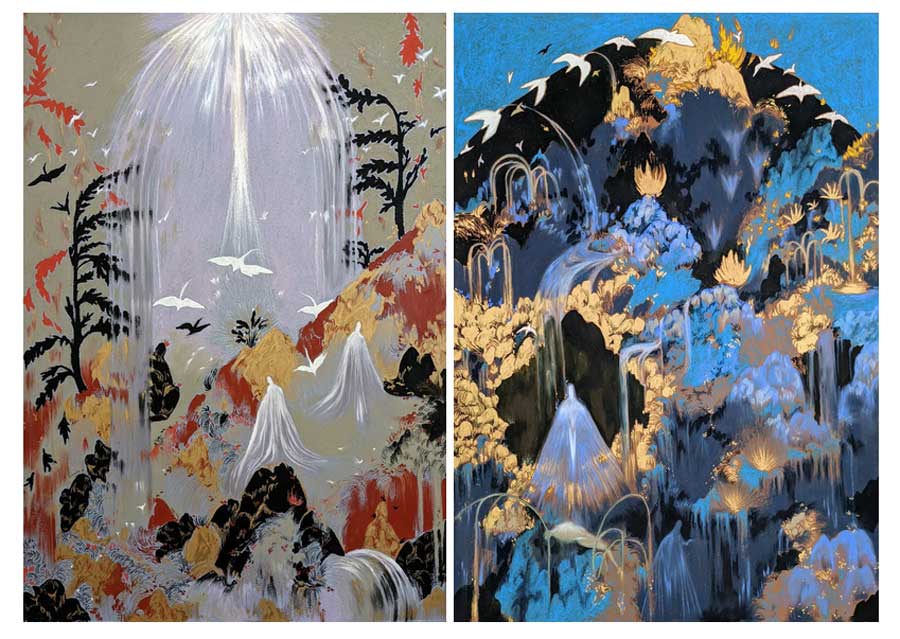 “Apparitions not only refers to the ghostly figures and birds within Suhaylah’s paintings, but the mystical environments they inhabit. Existence flourishes in the space between the spiritual and the corporeal, anchored in naturalistic scenes laden with merging trees, pools, brush and waterfalls. Her vastly changing palettes, spectral figures and leading titles conjure the cycles ever-present within her beautifully harmonious renditions of natural order.