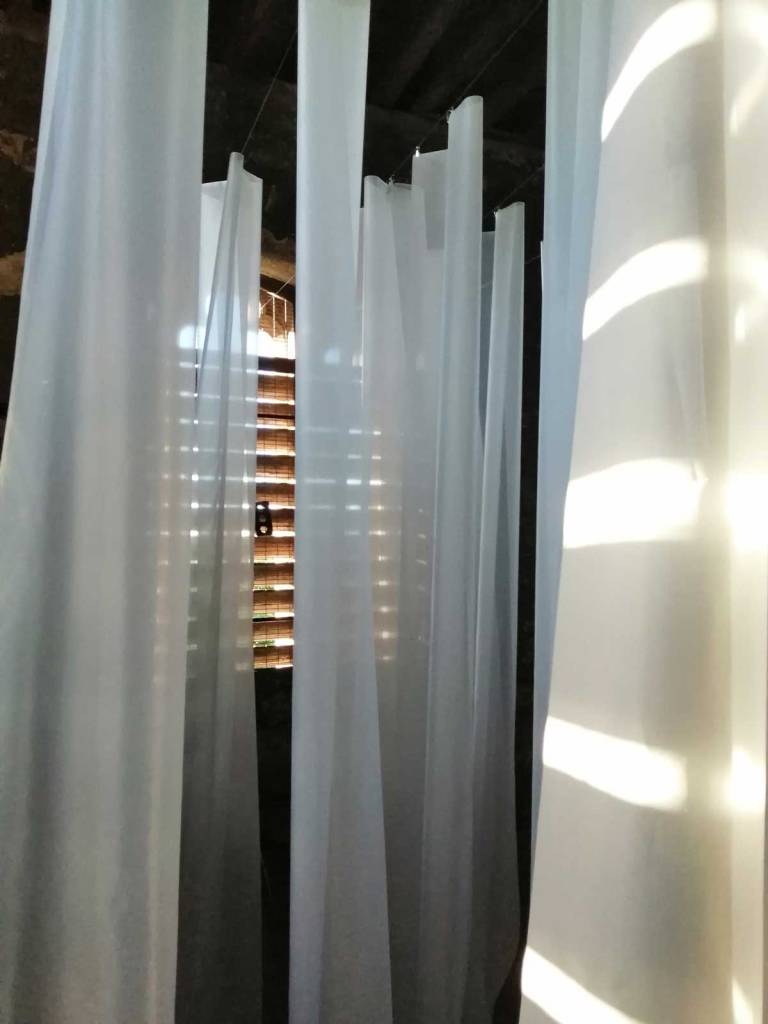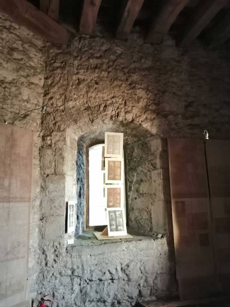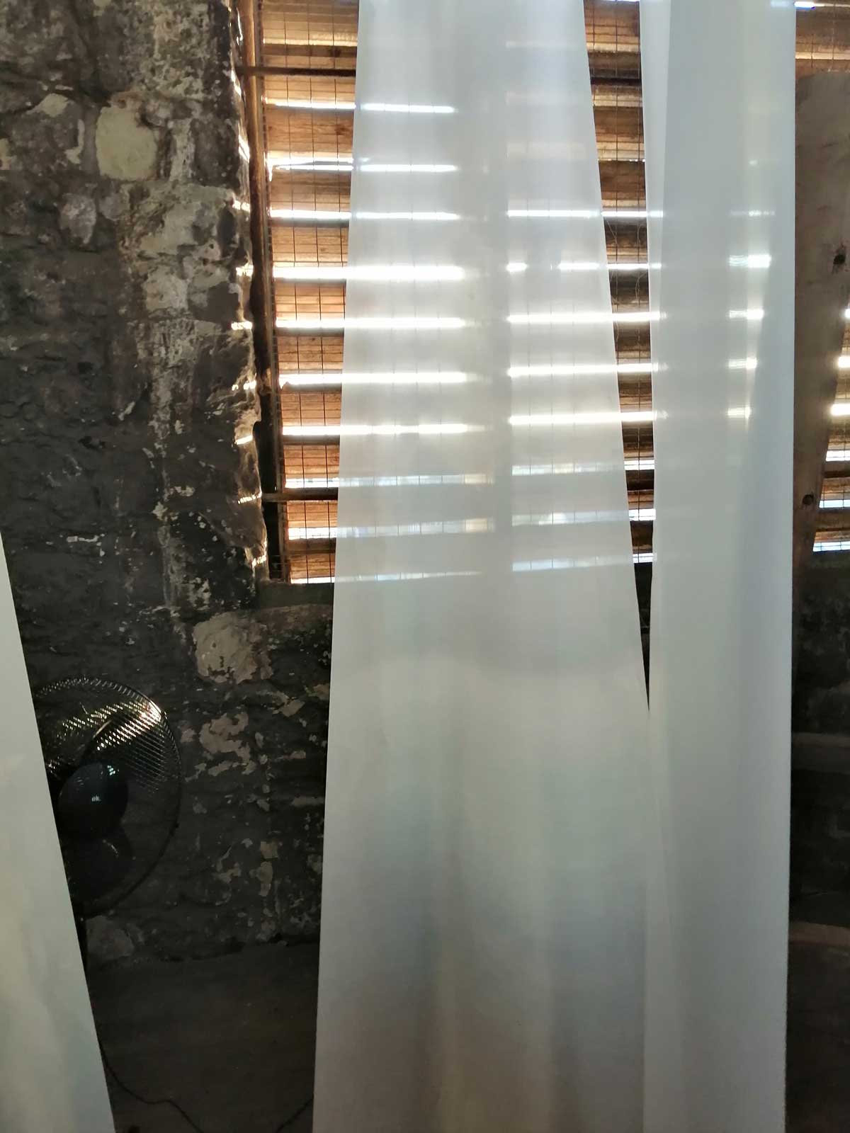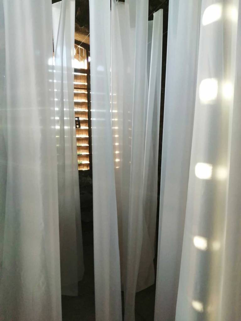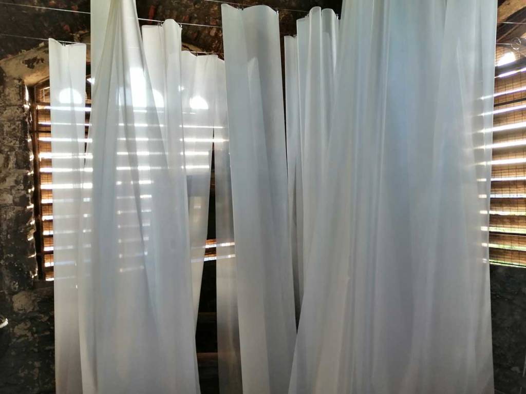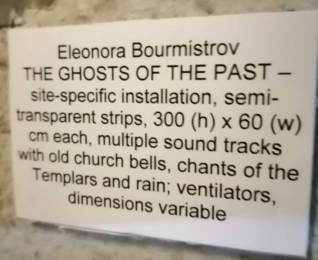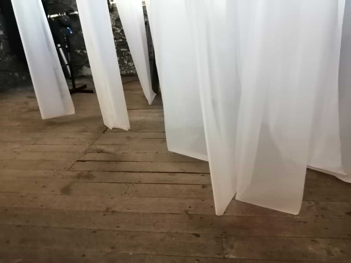 Stand out piece is at the top, an ambitous installation piece by Eleonora Bourmistrov that’s blowing in the wind. Semi-transparent large fabric strips hanging and moving with sound, a rather subtle soundtrack of bells and weather, of chants and more. The piece is called Ghosts of The Past, the title might be a little too obvious, the piece itself is beautifully intriguing. delicately inviting, the piece makes it a wonderful space to be in, a wonderful piece to listen to, to walk around, to just spend time with, a piece that tops the show at the top of the tower wonderfully. Elsewhere on the floors below Elenora Bourmistrov’s beautiful piece, there are installations, hangings, video, films, prints placed on window ledges, some beautiful pieces. The exhibition works well as one whole. one well considered well curated one whole of a group show, it is Eleonora Bourmistrov’s use of her floor in the tower that does stand out, the whole show is strong though, the artists have worked well with the space, the show is rather recommended. (sw)