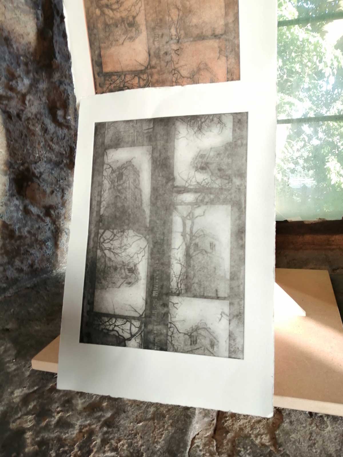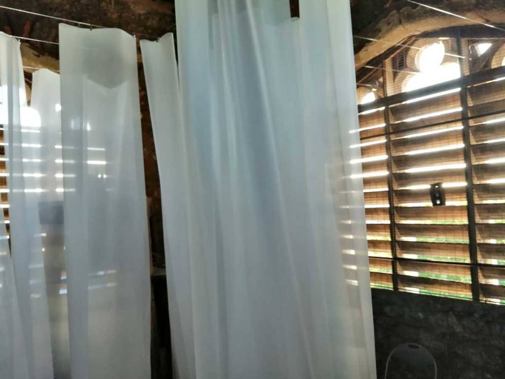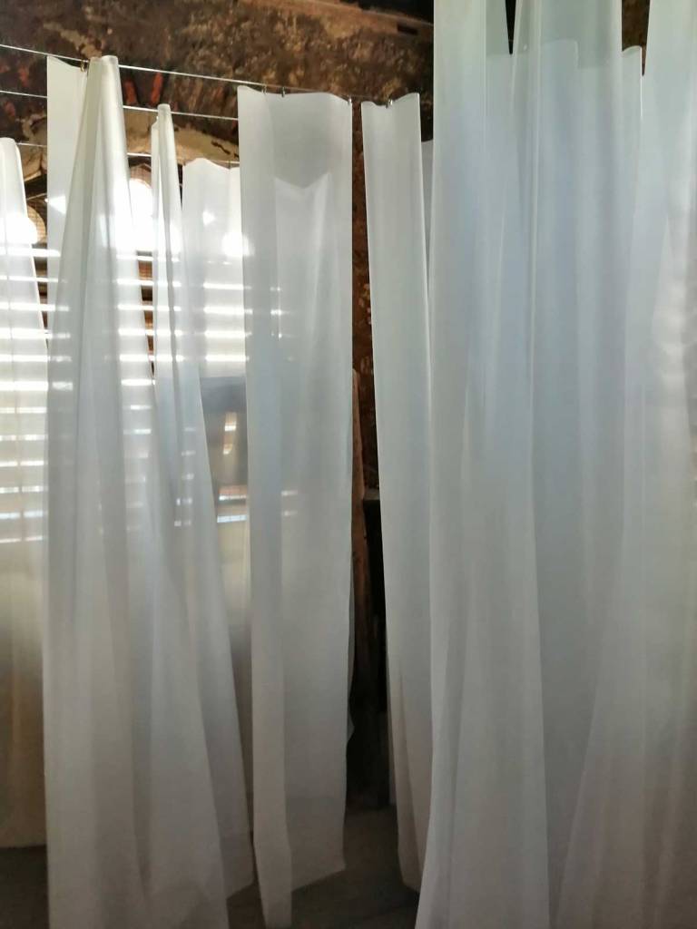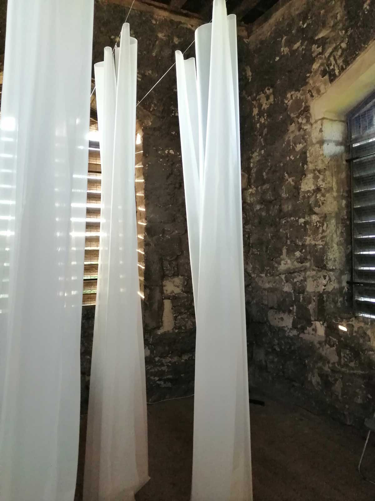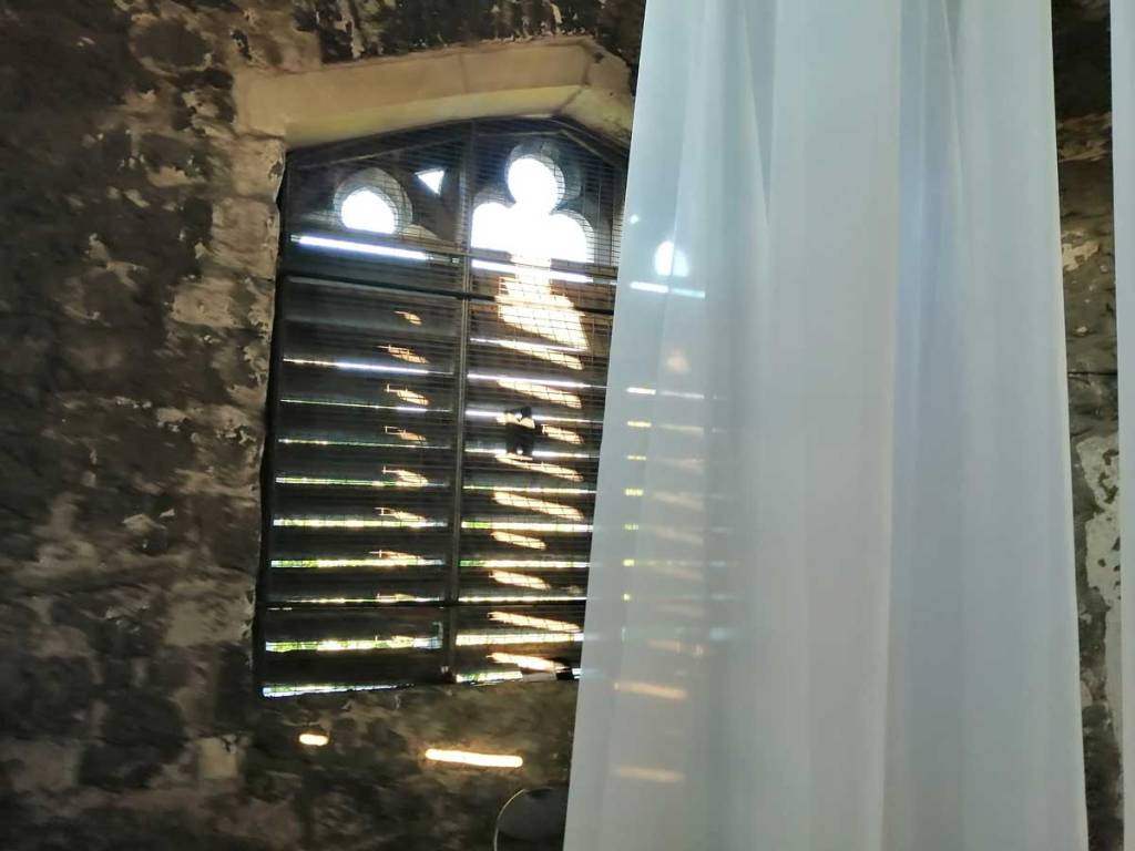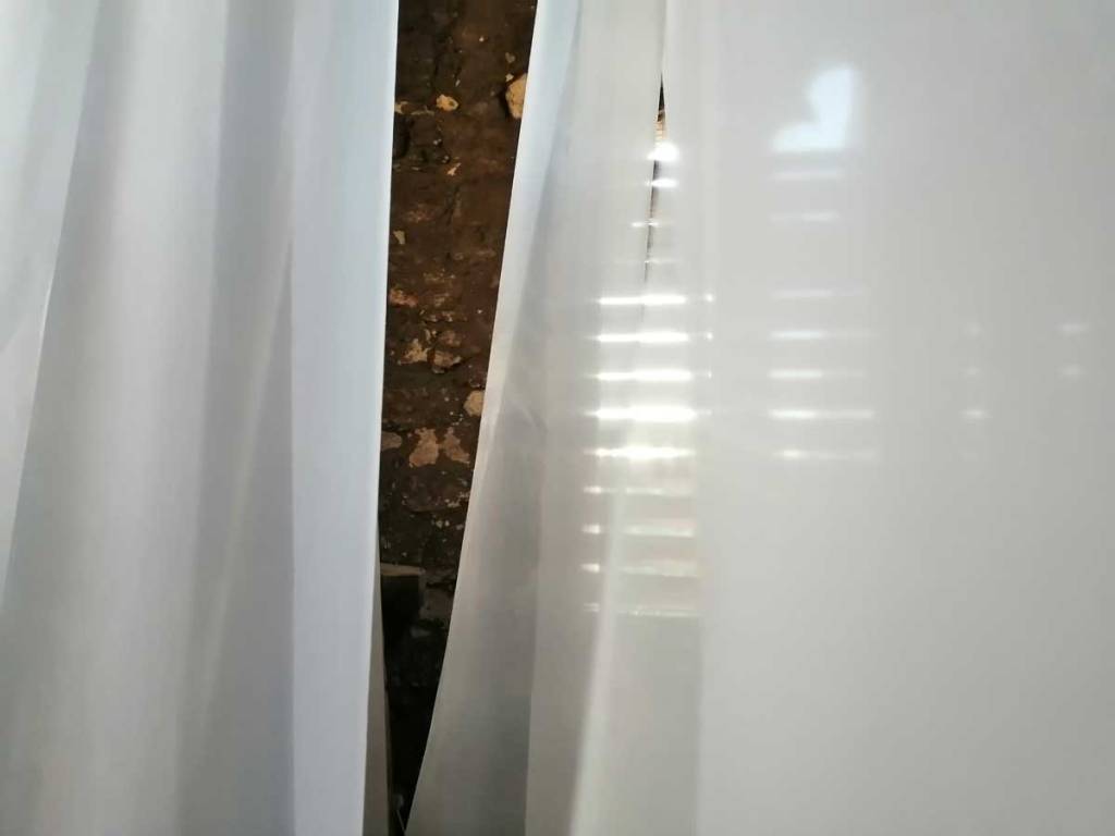 Stand out piece is at the top, an ambitous installation piece by Eleonora Bourmistrov that’s blowing in the wind. Semi-transparent large fabric strips hanging and moving with sound, a rather subtle soundtrack of bells and weather, of chants and more. The piece is called Ghosts of The Past, the title might be a little too obvious, the piece itself is beautifully intriguing. delicately inviting, the piece makes it a wonderful space to be in, a wonderful piece to listen to, to walk around, to just spend time with, a piece that tops the show at the top of the tower wonderfully. Elsewhere on the floors below Elenora Bourmistrov’s beautiful piece, there are installations, hangings, video, films, prints placed on window ledges, some beautiful pieces. The exhibition works well as one whole. one well considered well curated one whole of a group show, it is Eleonora Bourmistrov’s use of her floor in the tower that does stand out, the whole show is strong though, the artists have worked well with the space, the show is rather recommended. (sw)