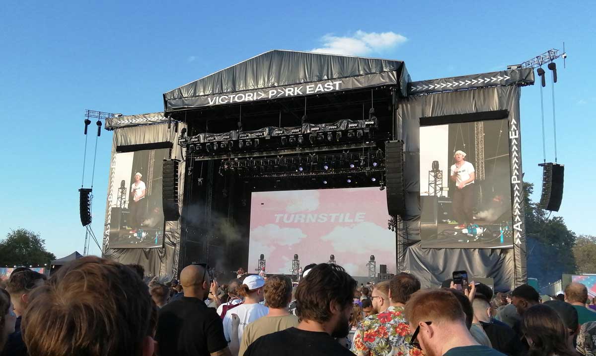 Before Idles there had been Baltimore’s Turnstile burning it up on the main stage in the late afternoon sun, they seemed harmlessly enjoyable in a big brash metallic kind of way, they sounded like a stew of American mussel, a bit of this, a bit of that, a touch of Foos, a touch of Rage Against whatever you’ve got, that big corporate American rock thing, packaged up and ready to be consumed by the kids in a harmless enough manner. They can rock it up, not sure where anyone gets the idea that they might be some kind of Hardcore punk band? Maybe ten years ago when there was pressure to succeed they might of hinted at it but right now they’re a big glossy modern hard rock band, a harmless one, a decent enough one, Brendan Yates can certainly front a band and hold an audience, they’re harmlessly good, they’re enjoyable enough in the London sunshine, they’ve got their fans singing along with them, they do their heard-it-all-before thing well enough, good luck to ’em, they’re instantly forgotten the moment Idles hit the other stage at the other end of the site and blow them and everything else away.