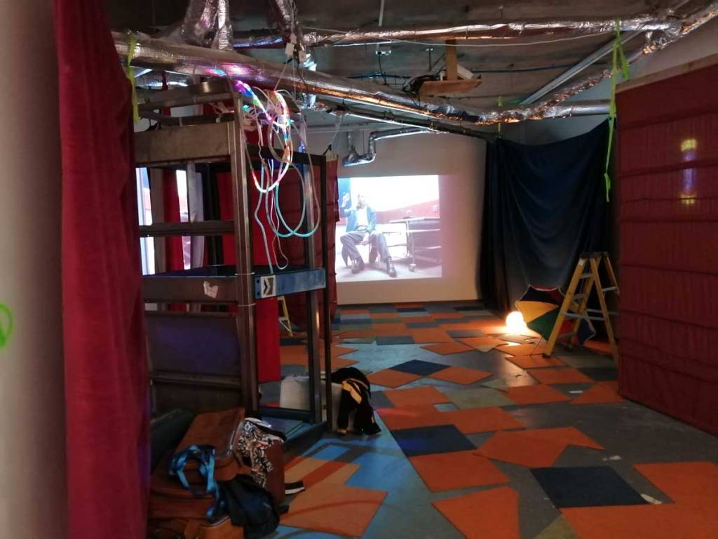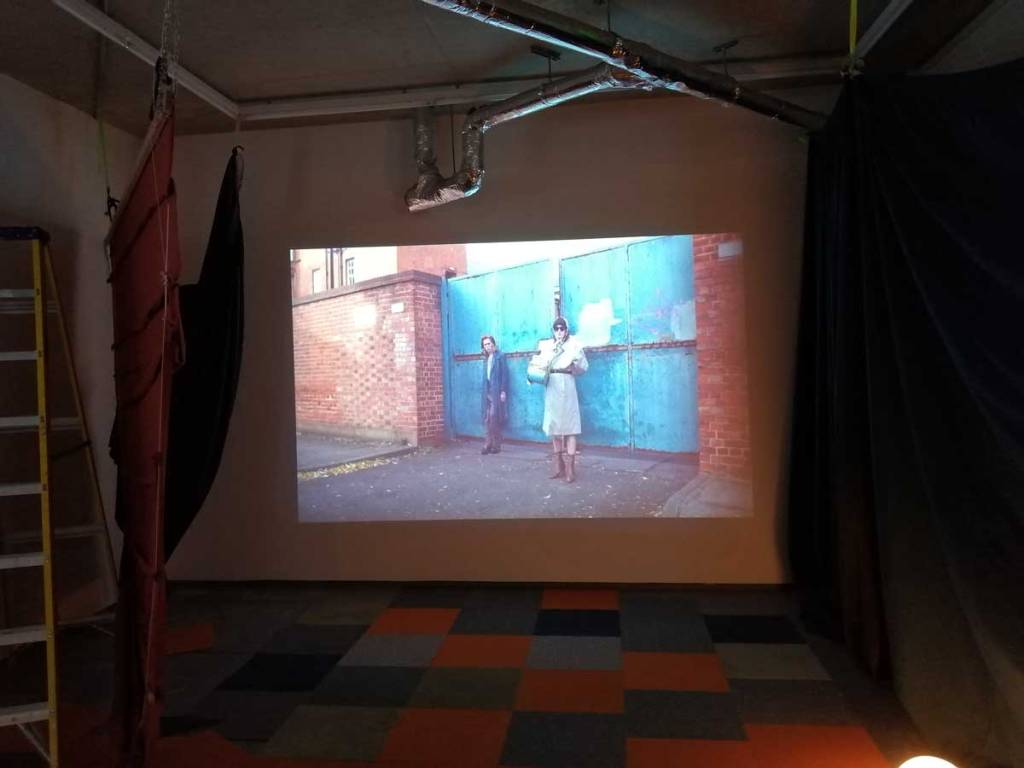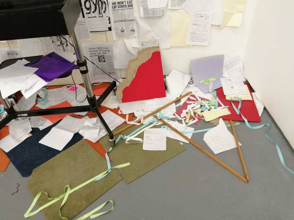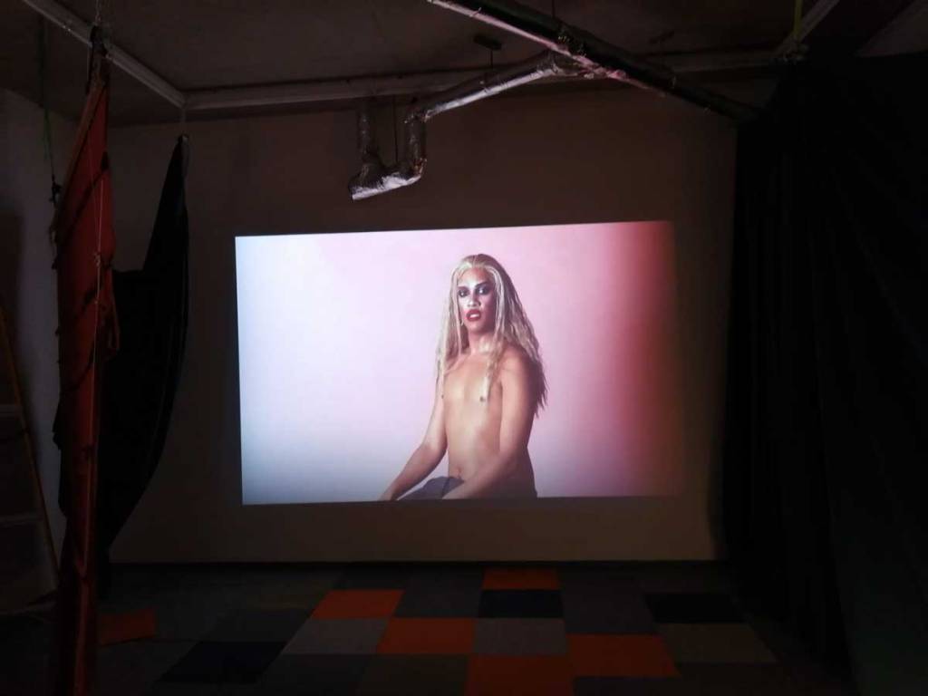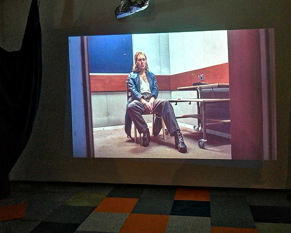 There’s a lot to take in, it is coming at you on all sides, from the dark corners, the ripped up carpet squares on the floors and watching films in an art gallery is strange at the best of times, I can happily stand for twenty minutes looking at a painting and think nothing of the act but sit me in front of a film and I’m starting to think why do I really need to be in a gallery to do this? But then the props, are they props? The props Joseph Wilson has not so much scattered as placed very carefully as to look scattered. I mean, what is going on? One of the three films, IL-Widna if I have it anywhere near correct from the pieces I’ve put together, tells of a group of queers on an island (forced on to an island?), while the film’s soundtrack firers excerpts from Margaret Thatcher and her going on in that way she did, moralising, dismissing anything or anyone she didn’t understand, talking about education, there she goes with her lecturing down about moral values. And yes, as you sit here or stand over there watching these films that are all running at the same time you can help but compare the punk rock edges and the defiance, the almost celebration to that of Derek Jarman, that same positive challenge, or maybe some of the recent things being said in that excellent Rebel Dykes documentary, but no, these are films, not documentation.