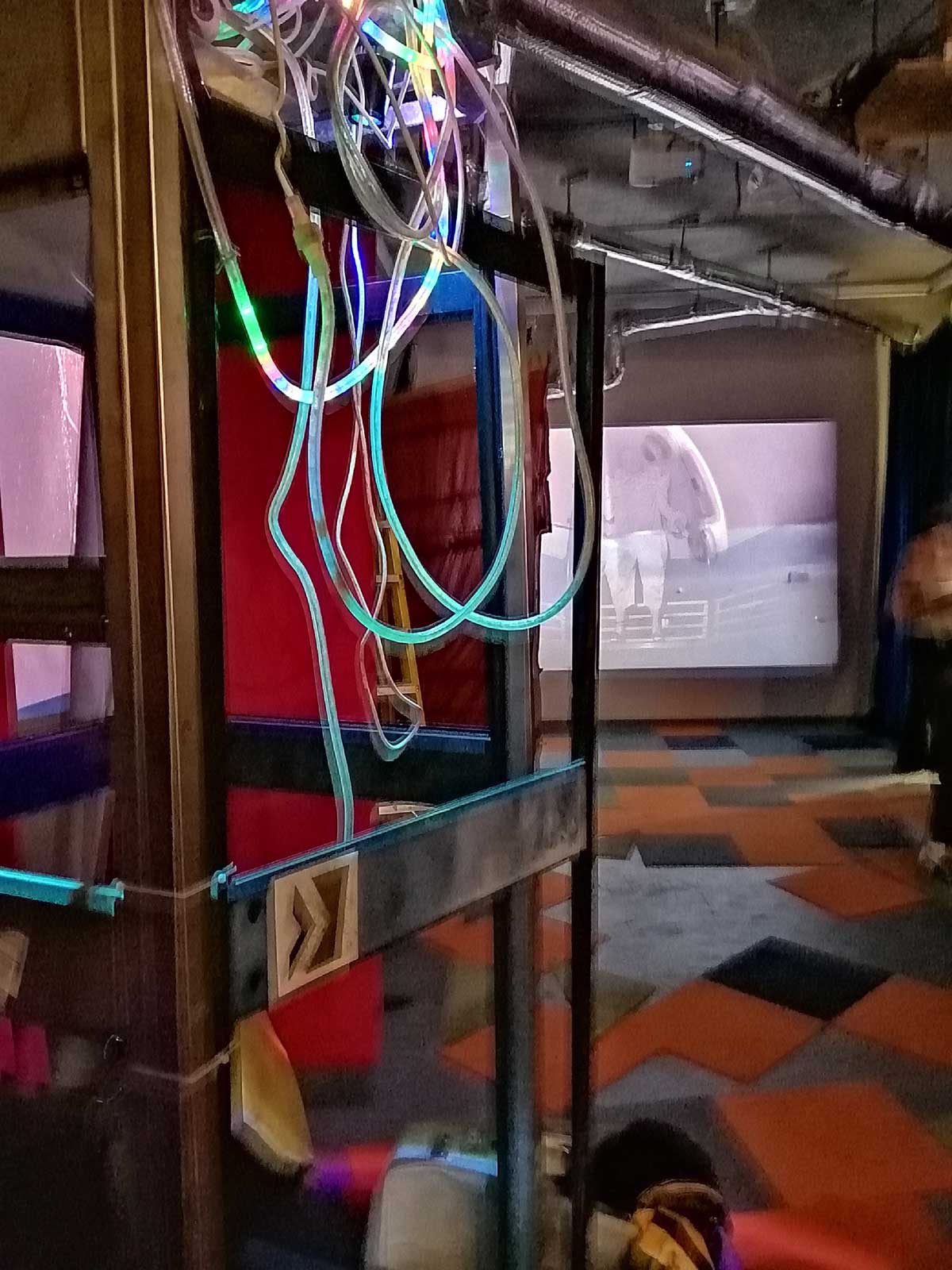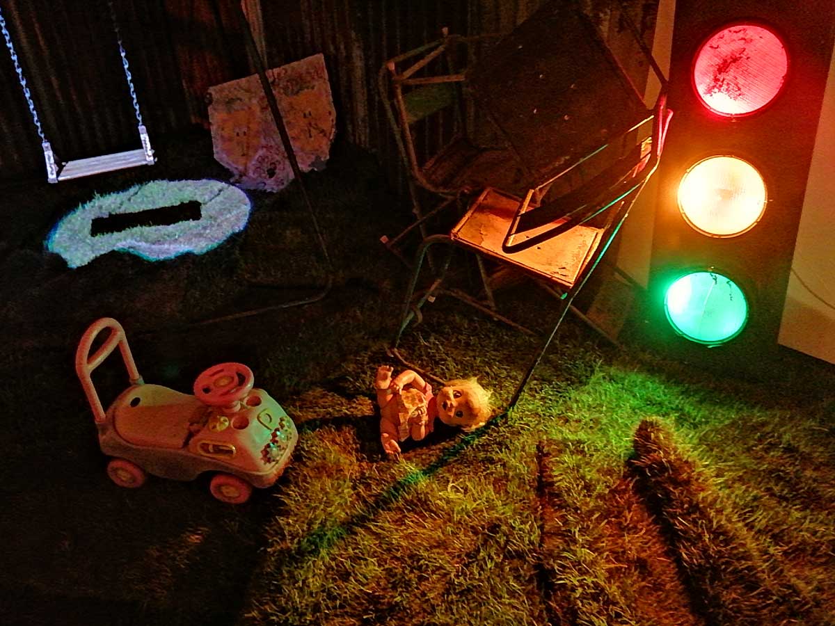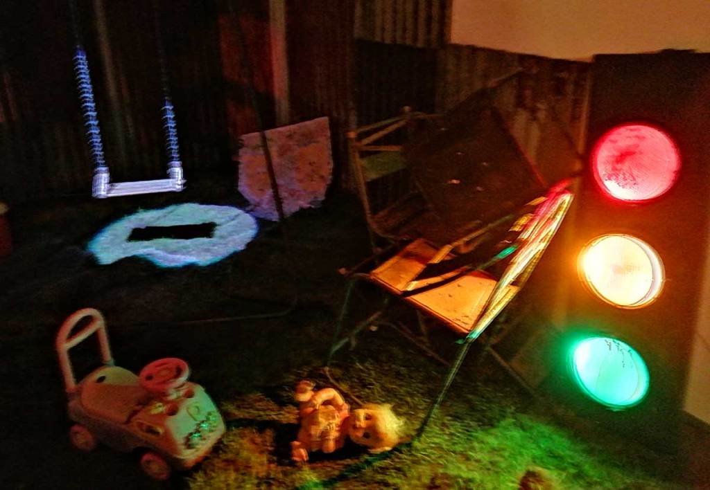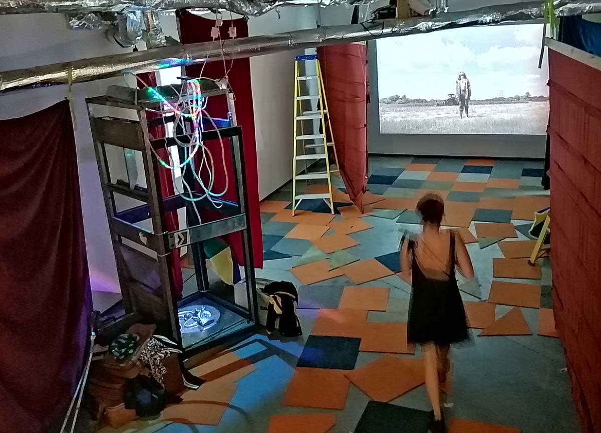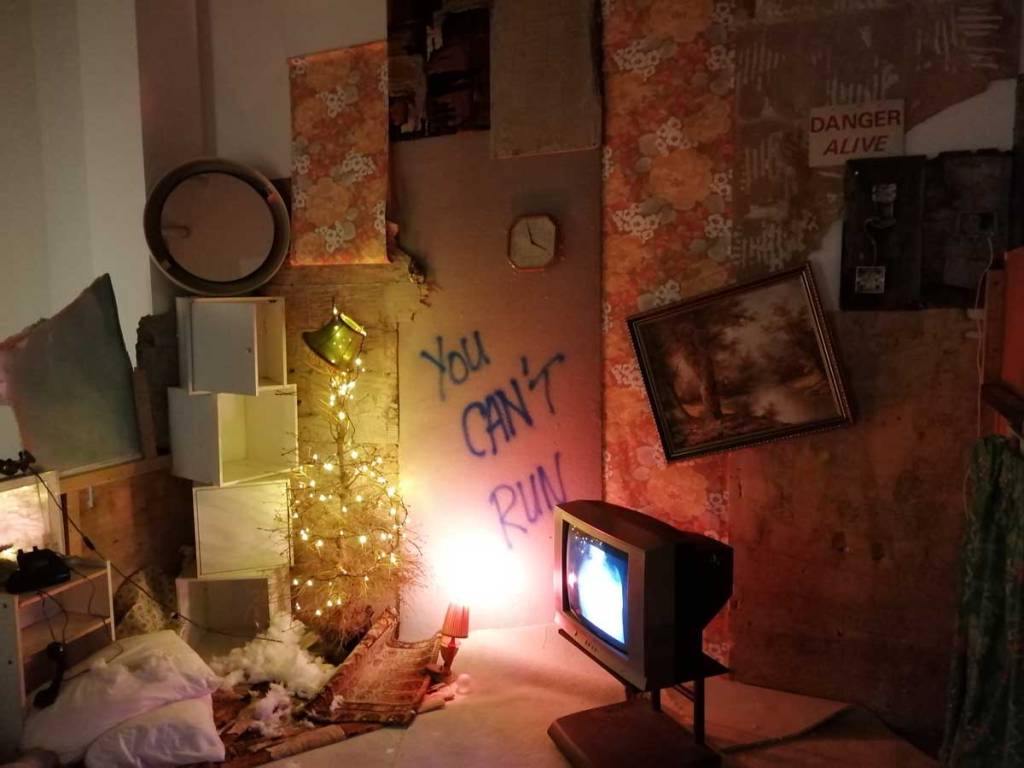 There’s a lot to take in, it is coming at you on all sides, from the dark corners, the ripped up carpet squares on the floors and watching films in an art gallery is strange at the best of times, I can happily stand for twenty minutes looking at a painting and think nothing of the act but sit me in front of a film and I’m starting to think why do I really need to be in a gallery to do this? But then the props, are they props? The props Joseph Wilson has not so much scattered as placed very carefully as to look scattered. I mean, what is going on? One of the three films, IL-Widna if I have it anywhere near correct from the pieces I’ve put together, tells of a group of queers on an island (forced on to an island?), while the film’s soundtrack firers excerpts from Margaret Thatcher and her going on in that way she did, moralising, dismissing anything or anyone she didn’t understand, talking about education, there she goes with her lecturing down about moral values. And yes, as you sit here or stand over there watching these films that are all running at the same time you can help but compare the punk rock edges and the defiance, the almost celebration to that of Derek Jarman, that same positive challenge, or maybe some of the recent things being said in that excellent Rebel Dykes documentary, but no, these are films, not documentation.