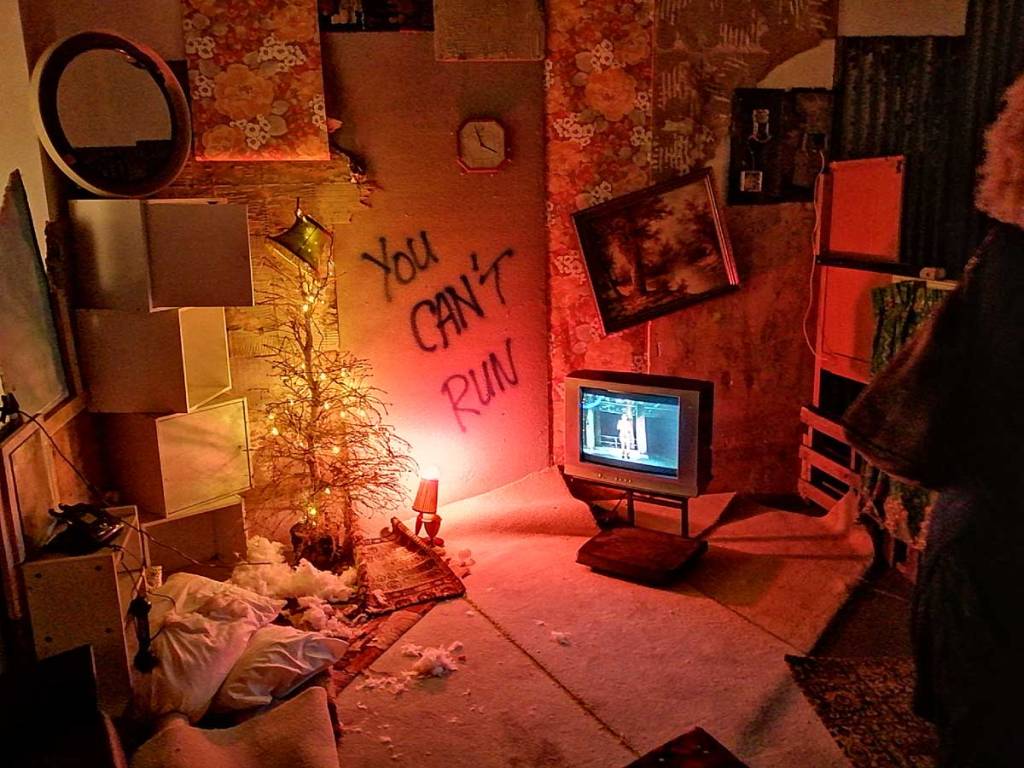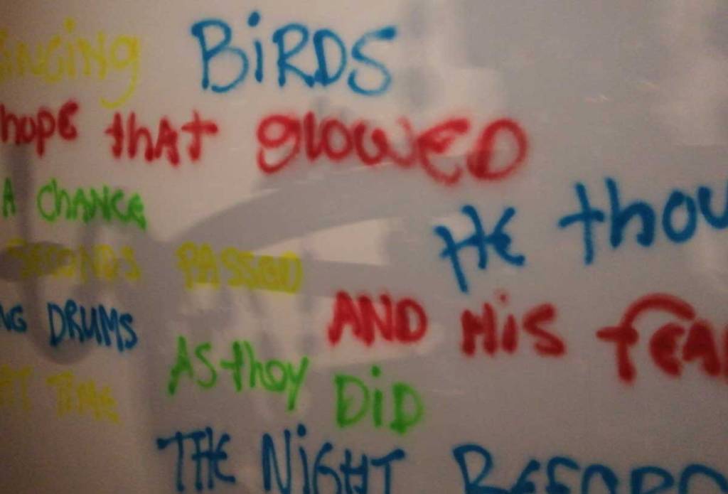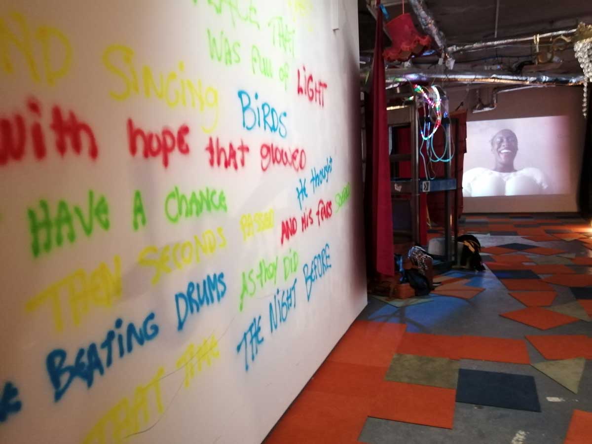 Actually, as fun as the opening night might have been, this is a wonderfully serious blurring of the lines, a blurring of the parts of the exhibition, the pieces, the whole. Everything here in the gallery exists in a space that blurs the boundaries, is it about the installation? about the moving image, the emotion of the (blurred) subject? Are we to sit on that chair and watch the film or walk around the chair treating it as an exhibition while we stroke our chins? There are elements of the films brought to life in the gallery, there are conversations that you the watcher are very much apart of, those words on the walls, on the boards, who sprayed the words? What is going on in the corner, is it part of a performance or should I politely look the other way? I’m still not quite sure where the lines were…
