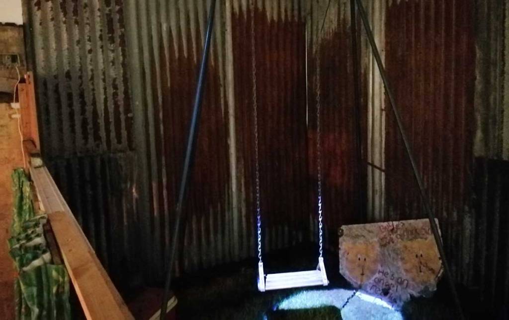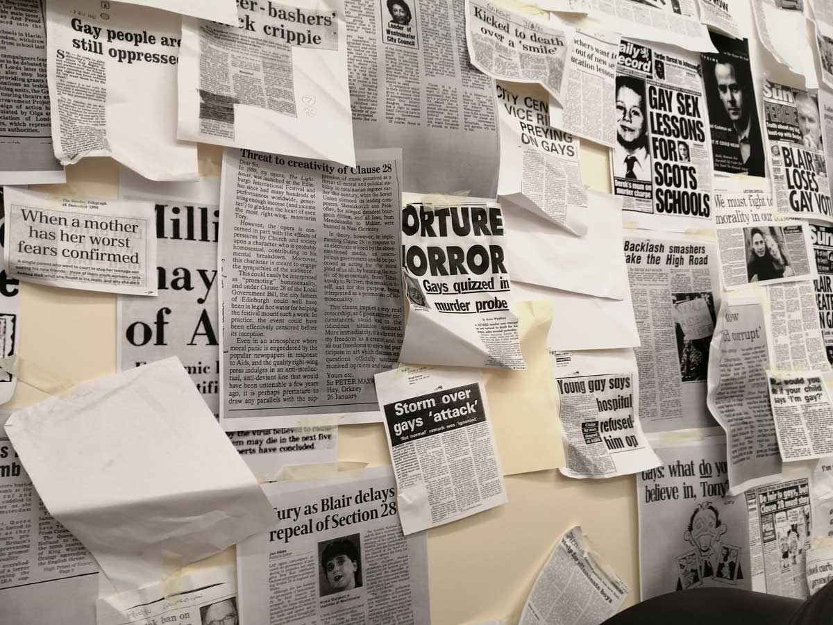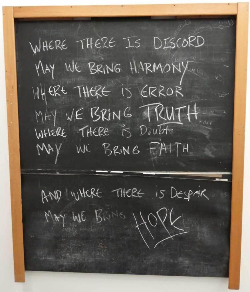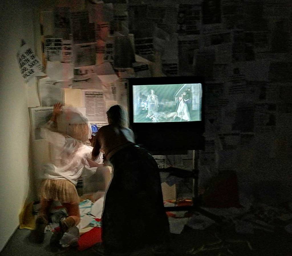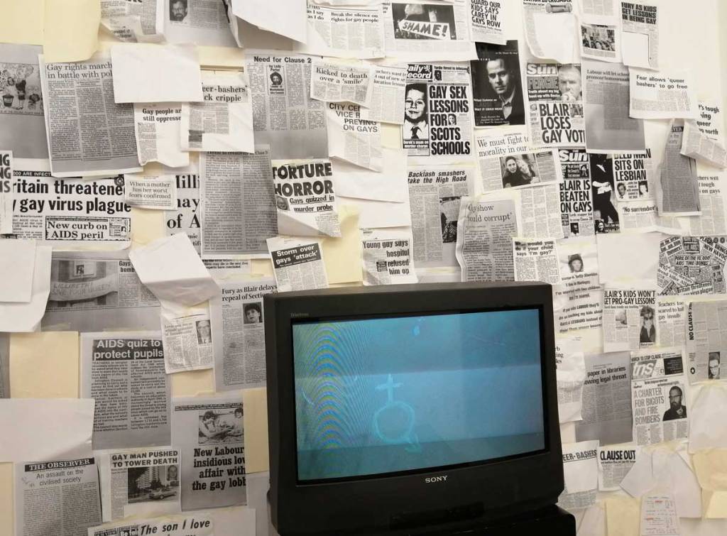 It was almost an East London throwback, two packed galleries, people all over the street outside both of them, artists falling over each other, confused collectors, people pushing camera lens in your face both at Jealous over at Shoreditch for Miss Bugs and back here in Hackney for Joseph Wilson’s rather excellent ‘Fragments Between Us’. The normally well behaved formal white walls of the ever reliable New Art Project’s basement space were alive with who knows what. The rooms of the downstairs gallery had been completely transformed, film screams everywhere – hang on, film screams is a typo, it kind of fits though, film screens (not screams) everywhere, scream dreams in a 2HB kind of way, television screens, a Christmas tree (in August), and in the most powerful room of all, the wooden benches, familiar from so many primary schools or youth clubs of the 70’s and 80’s, benches there so you can sit (slightly uncomfortably) and watch the film. There’s an old school blackboard with the Prayer of Saint Francis scrawled on it, the text from which Margaret Thatcher quoted when she first arrived in Downing Street as the then new Prime Minister back in 1979. There’s a series of newspaper reports on Section 28 and such scattered over one of the walls, and come to think of it, that TV is the sort of thing your history teacher would have wheeled out during a slightly skewed O Level history lesson back in the days of Maggi Thatcher (school was horrible back then). Section 28 as you probably know, or maybe not? Section 28 was a poisonous slice added to the Local Government Act of the time, something introduced under Thatcher, it prohibited local authorities and schools here in the UK from “promoting homosexuality” or even talking about it in any kind of constructively helpful kind of way, it was a kick in the the teeth for any slightly confused kid or indeed teacher. Thatcher’s lot really were ‘orrible.