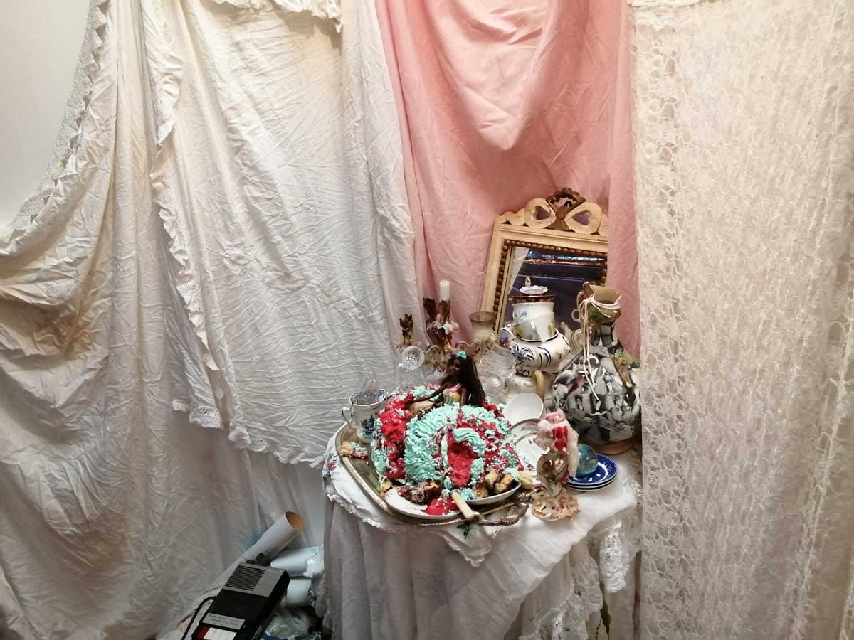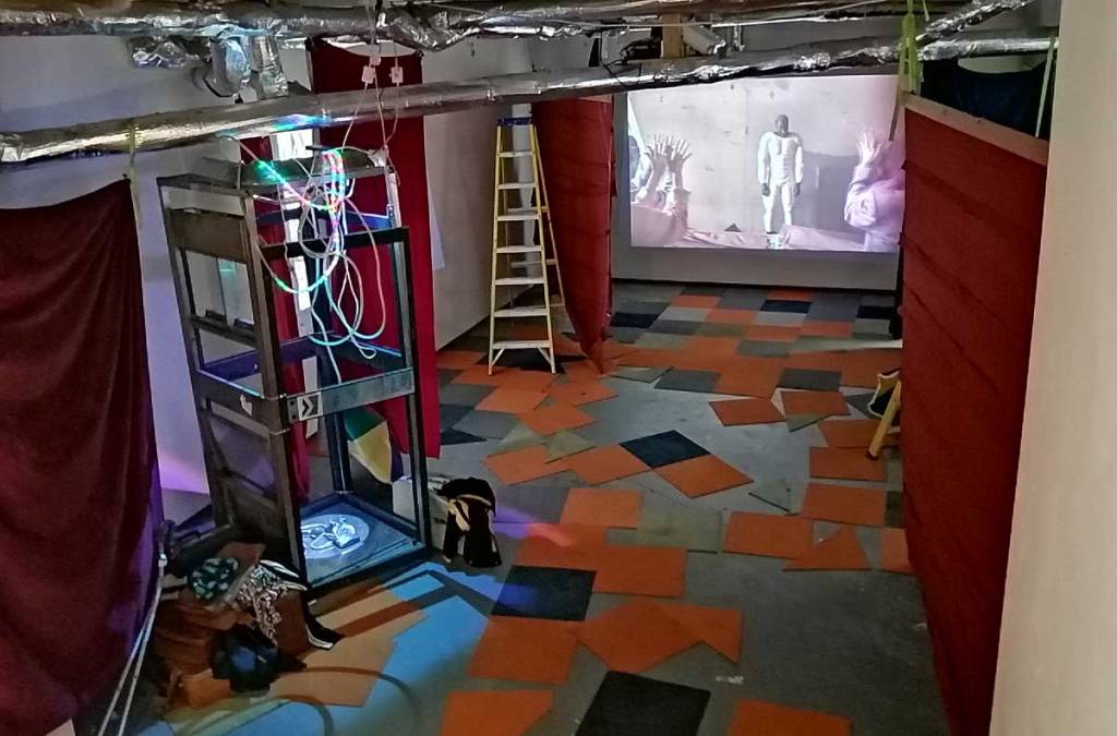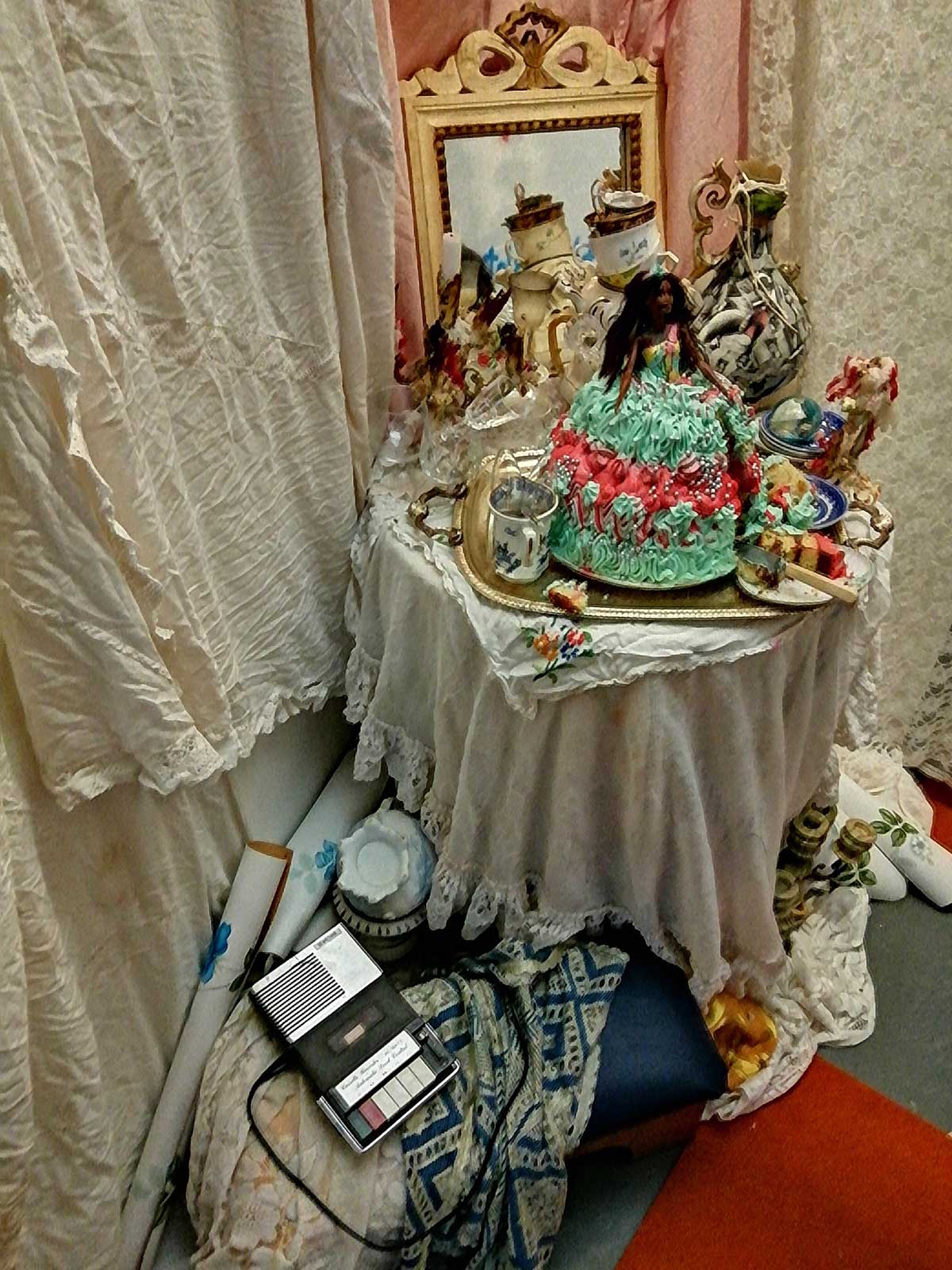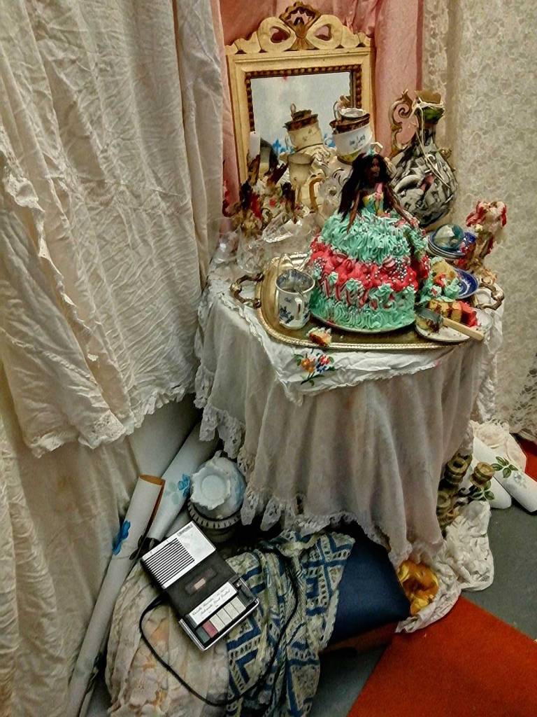 Actually when you come back and view all this without the opening night crowds, you feel the tension a lot more, the undercurrents, the questions asked, the power of the statements, is statements the right word? The defiance? There’s nothing that gentle here, none of this is that nice, not in the conventional sense of it. Down here in the basement by myself on a Wednesday afternoon is rather different to being down in the packed basement at the Thursday night opening, but then, come to think of it, did I speak to anyone down there then on the opening night? There was a lot of people just wondering around in the dark. Was that a cake? left out in rain? Or a make up table? Three different films, one of them on three big screens in one room. Bits of performance, bits of, well bits of what? Bits of something, bit that, despite it all, all the broken parts, bits of things that felt positive. Kind of fitting that it is down here in a basement, down in the darkness, down in the pits, the underground, down in the darkness where the typewriter clicks. Kind of need to do it all again, to go to the opening night again, to go sit there on a Wednesday afternoon when no one else is down there again. Powerful show, was it a show? Powerful exhibition, powerful event, strong, striking, vital, defiant. disarming maybe? Powerful set of statements. Do try to catch it, one of the art events of the year so far. (sw)