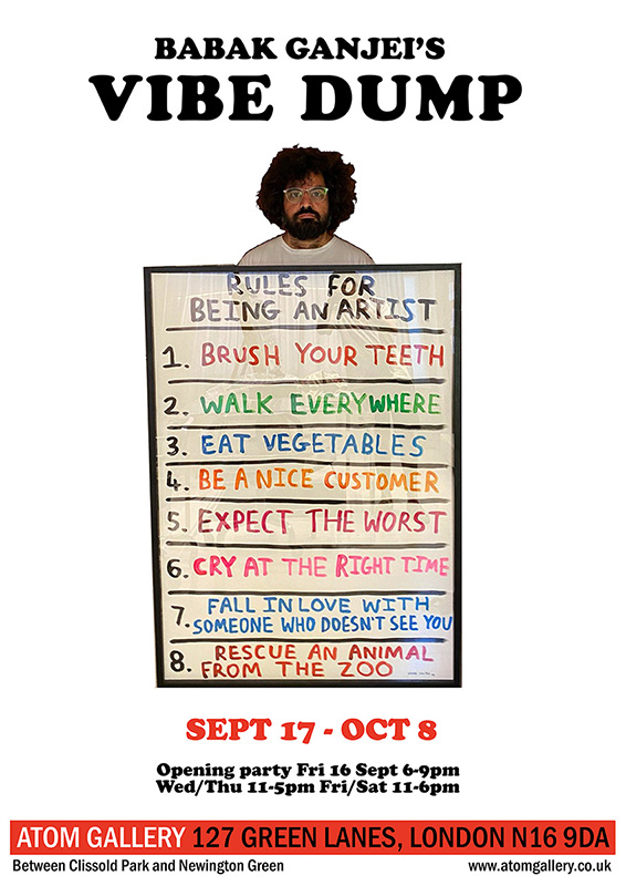 3: Babak Ganjei‘s Vibe Dump at Atom Gallery – 17th September until 8th October – “Babak’s back at Atom, with a whole new exhibition of work. No, we have no idea what to expect either!” he’s one of those artists you tend to bum into outside a post office neither of you live anywhere near, one of those text based artists but not one of those annoying ones. Most text-based artists are annoying aren’t they? Atom Gallery is an artist-run print based urban art flavoured gallery, you find it at 127 Green Lanes, London, N16 9DA. The gallery is open Thursday until Saturday, 11am until 5pm (6pm Friday and Saturday). Go explore Babak’s Instagram for a bit more flavour, or for that matter, Atom’s Insta feed (I hate calling it Insta, that’s what the kids do, I would not like you to think I was one of the kids, that is not alright, don’t get fooled again)