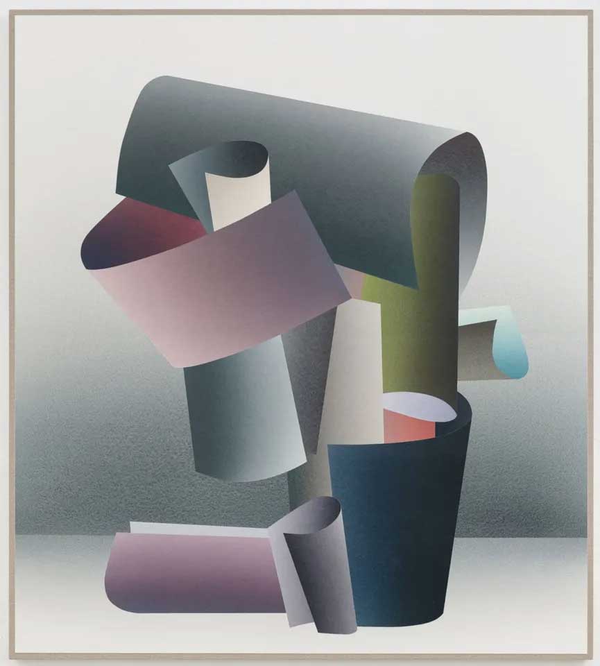 “Each painting in Chou’s Origami series begins with a piece of paper. Layered with subtle gradations of colour and cut into shapes the paper evolves, very slowly, into a new form. Soft becomes strong, a flat surface becomes like a sculpture within a painting that appears so flawless it can’t truly be handmade can it?