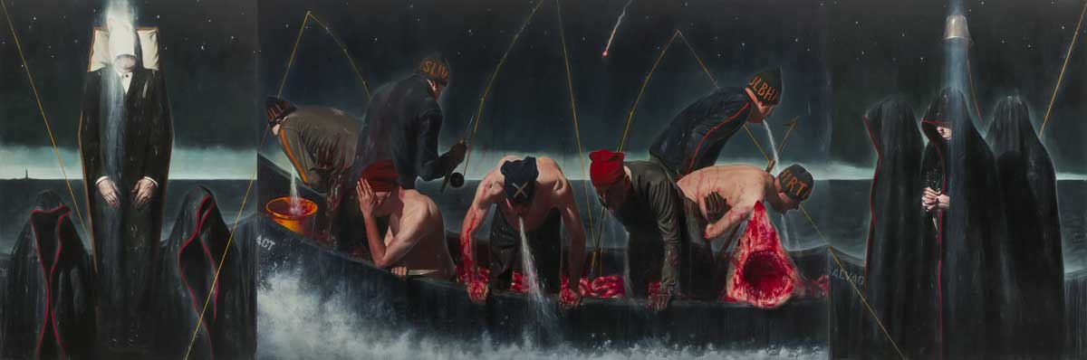 Large-scale paintings such as The Argonauts depict ideas of conquest, featuring scenes of brutality and a sky dramatically lit by the trails of falling missiles. Widening out across all three panels of the triptych, the painting resembles a stage set, in which each group of characters engage in symbolic actions with references to both the Argonautic voyage and the Oresteia. The narrative, however, is disrupted by shifts in the alignment of the scene where the panels meet, splicing apart the continuity of time and space as though referring to a cinematic jump cut. These glitches point us towards the dreamlike qualities of Currie’s paintings, in which the ambiguity of their storytelling leaves room for the viewer to read their own interpretation of the opposing acts of creation and destruction. The painting Black Boat refers to the poem by Scottish Gaelic poet Sorley MacLean of the same name. In this triptych, the middle panel depicts a scene of distress, in which a crew of modern-day fishermen suffer alongside their haul on rough waters. The flanking panels portray solemn shrouded female figures, recalling the Fates (from Greek mythology), who appear to signal the loss of life on the sea. The curve of the hull of the boat here is repeated in all three panels of the triptych, creating a rolling waveform that amplifies a sense of nausea; meanwhile, the rhythm of the painting is firmly anchored by the jagged path of fishing lines, their structural vectors suggesting a constellation by which to navigate. The works in Black Boat appear themselves to have been subjected to the ravages of the coastal Hebridean environment through the intricate and highly controlled manipulation of their painterly surfaces. A bloom often emerges as though the paintings have been patinated by the elements or illuminated by the spectral glow of phosphorescence. The resulting sensation of the passage of time echoes the hardships of a landscape Currie describes as “steeped in tragedy.” He says, “This contrast between beauty and tragedy is there all the time.”