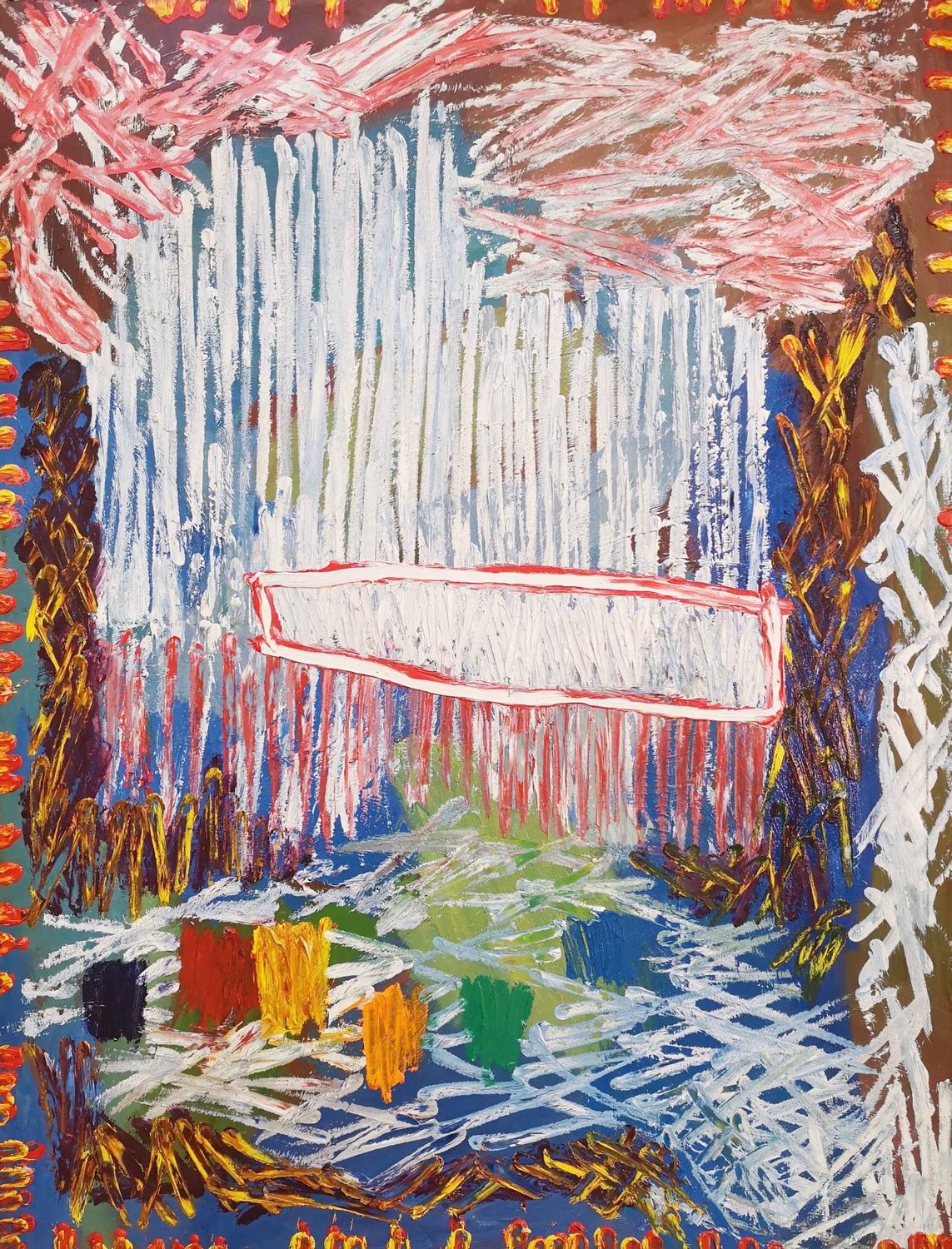 We can consider these paintings as psychic-scapes that speak to Ra’s experience of transitioning. Canvases that resonate with Susan Stryker’s description of transitioning as a becoming directed toward an unknown destination. Ra’s becoming is not restricted to the binary codes of patriarchal culture but oscillates between representation and abstraction. Mutable and fluid, Ra’s practice places recognisable images into a world of autobiographical myths and visual poems.