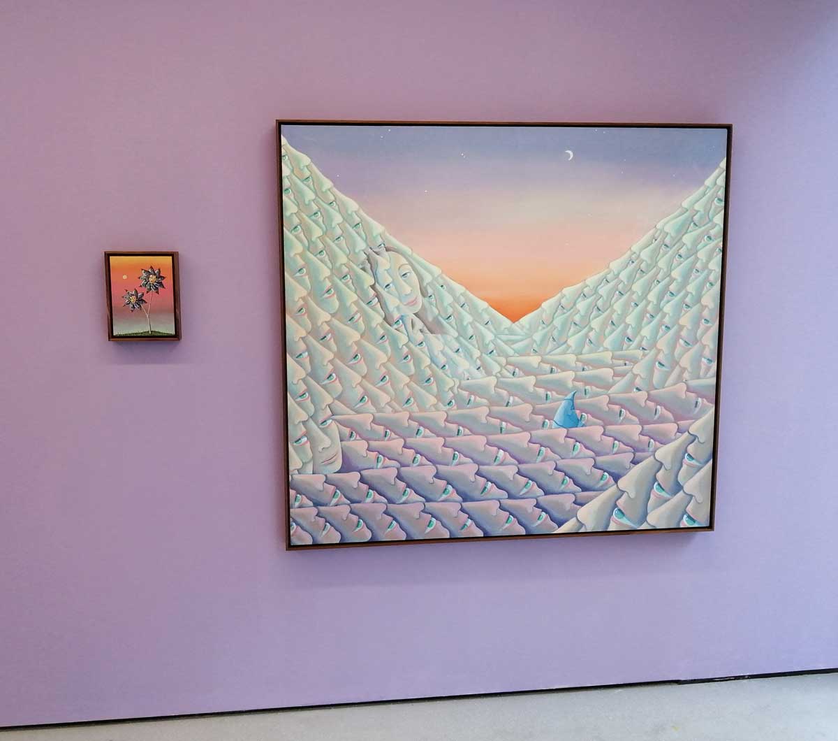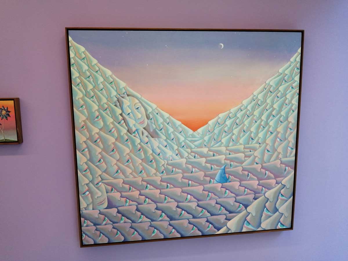 I have to be honest here, Marlene Steyn’s art isn’t really to my taste, her subject matter, her challenge isn’t really something that challenges me as a viewer or an artist, her “ambiguous twilight” and her almost hippified moons and trees and that palette and well, it just isn’t my cup of tea. And here’s the thing, do we just ignore it and move on or do you want us to inform you? Exhibitions at Lychee One do seem to mostly be well kept secrets, they don’t really do Facebook or Twitter, they don’t really do mailing lists, Instagram or nothing seems to be where they’re at and we all know the problems with Instagram and their annoying algorithms. So do we say, not for us and quietly move on or do we say something? What is our function here? Marlene Steyn paints strangely slick psychedelic trees, slightly surreal, spiritual, I want to say hippy shit but that’s too insulting and I think this show deserves a little respect than that offers. Hey look, Marlene Steyn has a show on at Hackney’s Lychee One Gallery for a month or so, you might argue the show is a good follow up to the recent James Owens show in the same space. Marlene Steyn has a show, I went, had a look, it isn’t really my thing, if it looks like it might be yours then here it is…