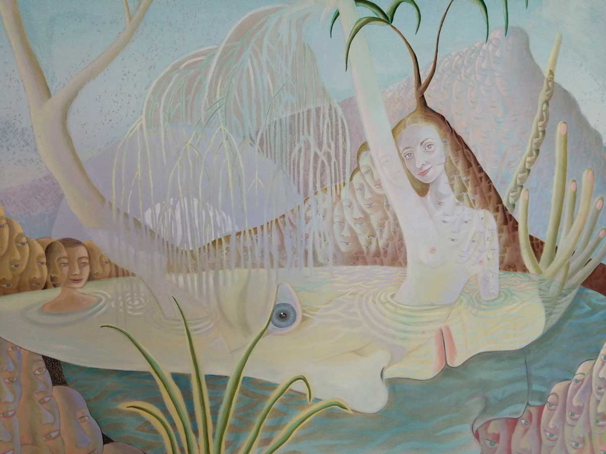 Throughout You-Me-Verse, female figures are interwoven with their environments, becoming part of the landscapes. Faces appear and reappear as iteratively repeated motifs. The repetition is not mechanical or precise; features and expressions change slightly from face to face, suggesting the phases and multiplicities of identity that can be found even within a single individual.