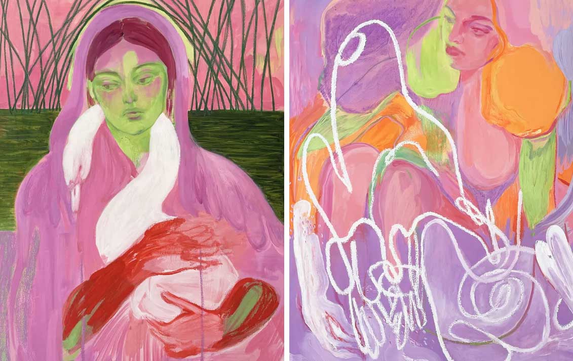 “Dreamy female forms appear amid vivid, swirling landscapes, their limbs entwined with the translucent, ghostlike silhouettes of swans. British artist Amy Beager draws on the language of fairy tale and myth to create darkly romantic scenes that blur the boundaries between abstraction and figuration, fantasy and reality. Swan Maidens, her first solo exhibition with Kristin Hjellegjerde Gallery, centres around the story of a woman – half human, half swan – torn between the mortal and immortal worlds. At once haunting and beautiful, the paintings envision different interpretations of the folklore reflecting on ideas around power, seduction, desire, entrapment, freedom and loss.