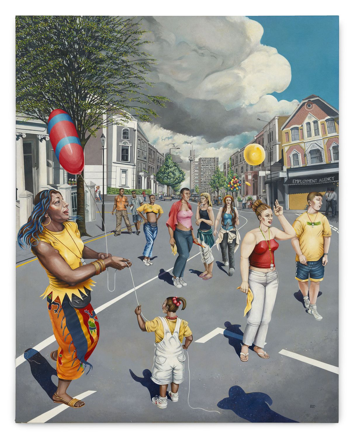 Faithful depictions of Ladbroke Grove’s bustling community and architectural landmarks are juxtaposed with fantastical images of male and female commuters stripped of their clothing. Coon’s distinctive style is characterised by crisp-edged lines, bright colours and hyperrealism redolent of Paul Cadmus and Tamara de Lempicka.