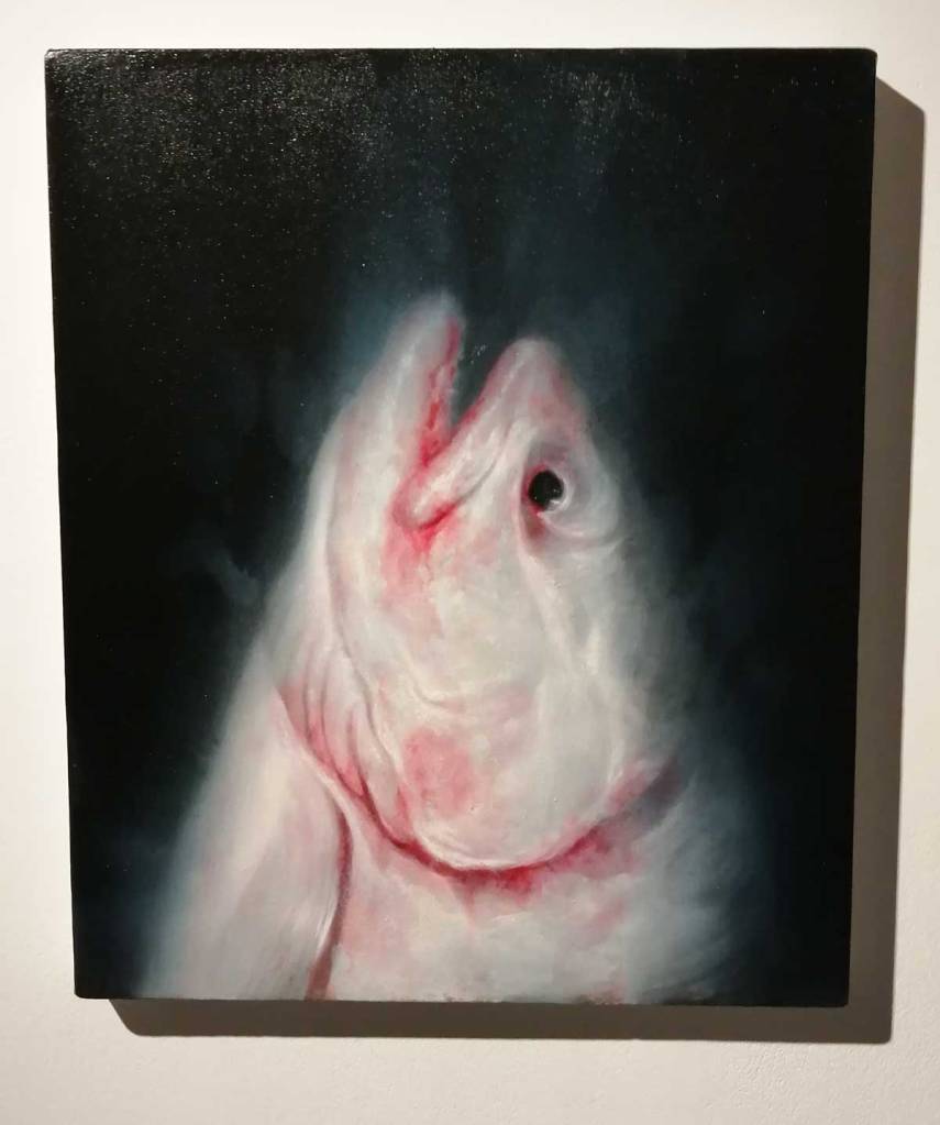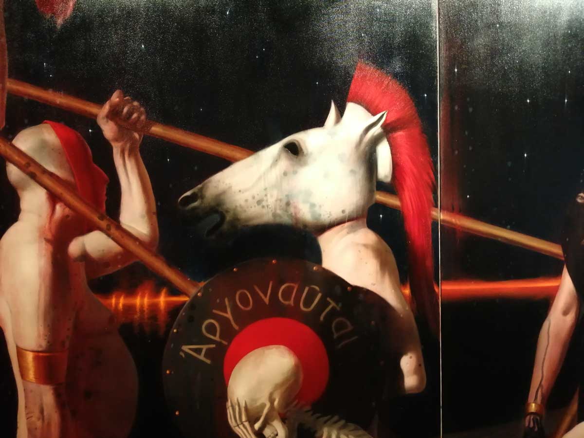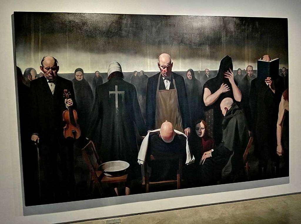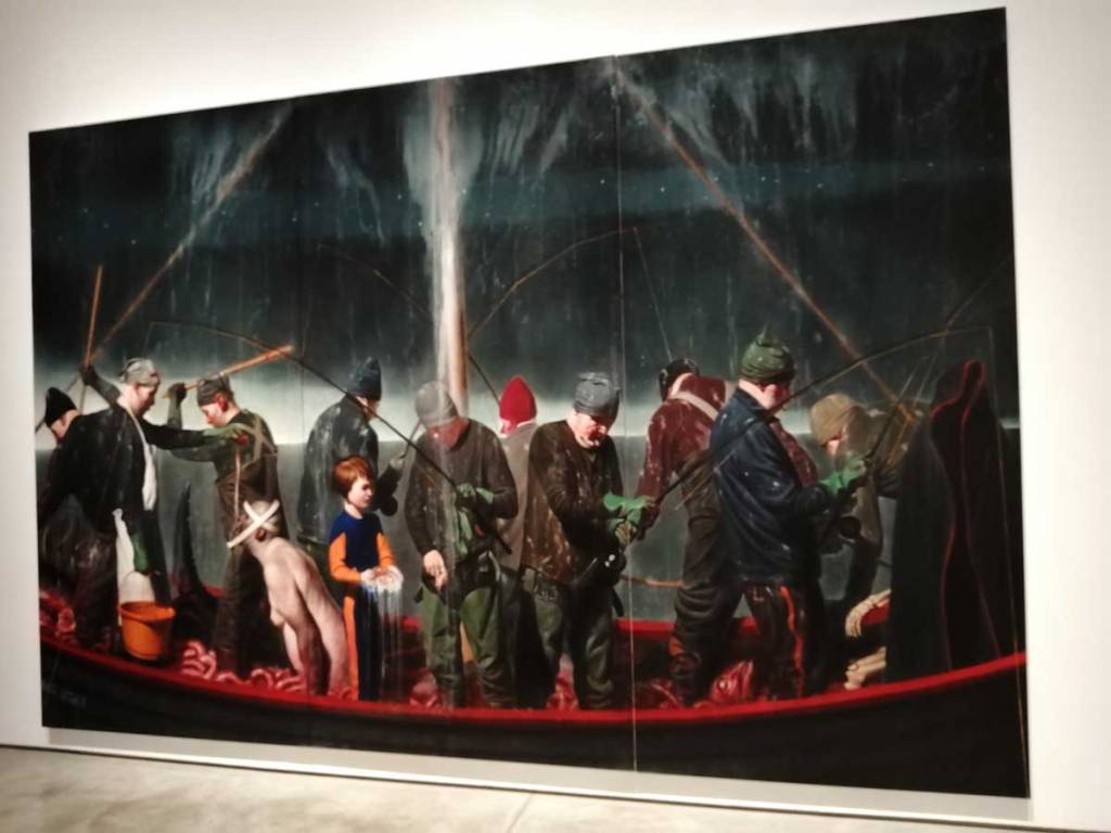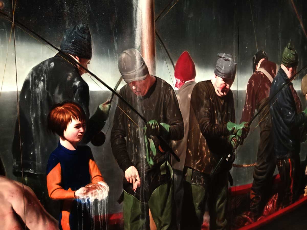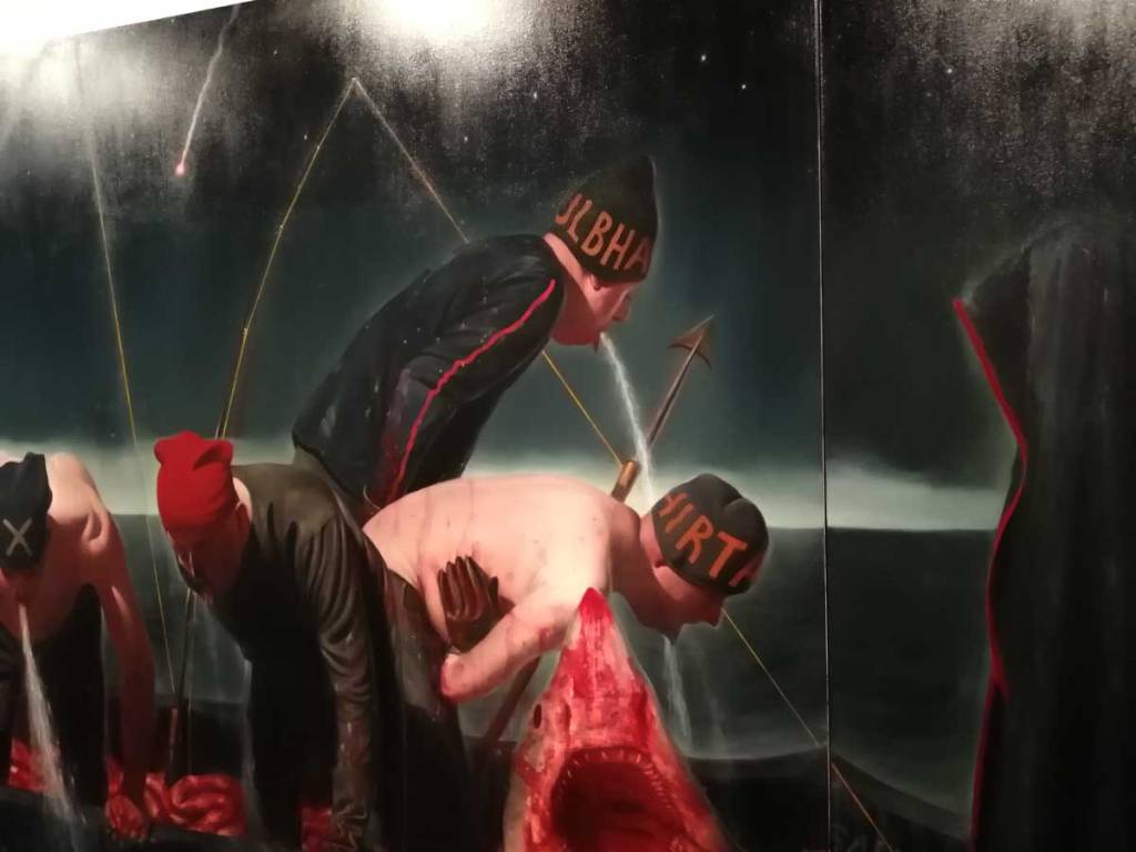 Back down in the main room, we’re told the painting Black Boat, the title of this show as one of the great big pieces, refers to the poem by Scottish Gaelic poet Sorley MacLean of the same name, and yes I am going to cop out and quote the gallery’s own exhibition statement here; “In this triptych, the middle panel depicts a scene of distress, in which a crew of modern-day fishermen suffer alongside their haul on rough waters. The flanking panels portray solemn shrouded female figures, recalling the Fates (from Greek mythology), who appear to signal the loss of life on the sea. The curve of the hull of the boat here is repeated in all three panels of the triptych, creating a rolling waveform that amplifies a sense of nausea; meanwhile, the rhythm of the painting is firmly anchored by the jagged path of fishing lines…” and well yes, it is like going to the cinema, it is like trying to decode it all, these pieces do demand you read them rather than just look at them, that you watch them rather than just look at them. Is it a timeless way of doing things? Is it an art lost on us now? Ken Currie, born in 1960, a Glasgow Boy, a painter right here, right now, surely not though? Who paints like this now? Who goes to the trouble of it all now when you could just get your studio assistant to pickle a shark or get your team to spray it on a wall (and bring out the print later), who the hell does this?! This is brilliant, this is exciting, this is breathtaking.