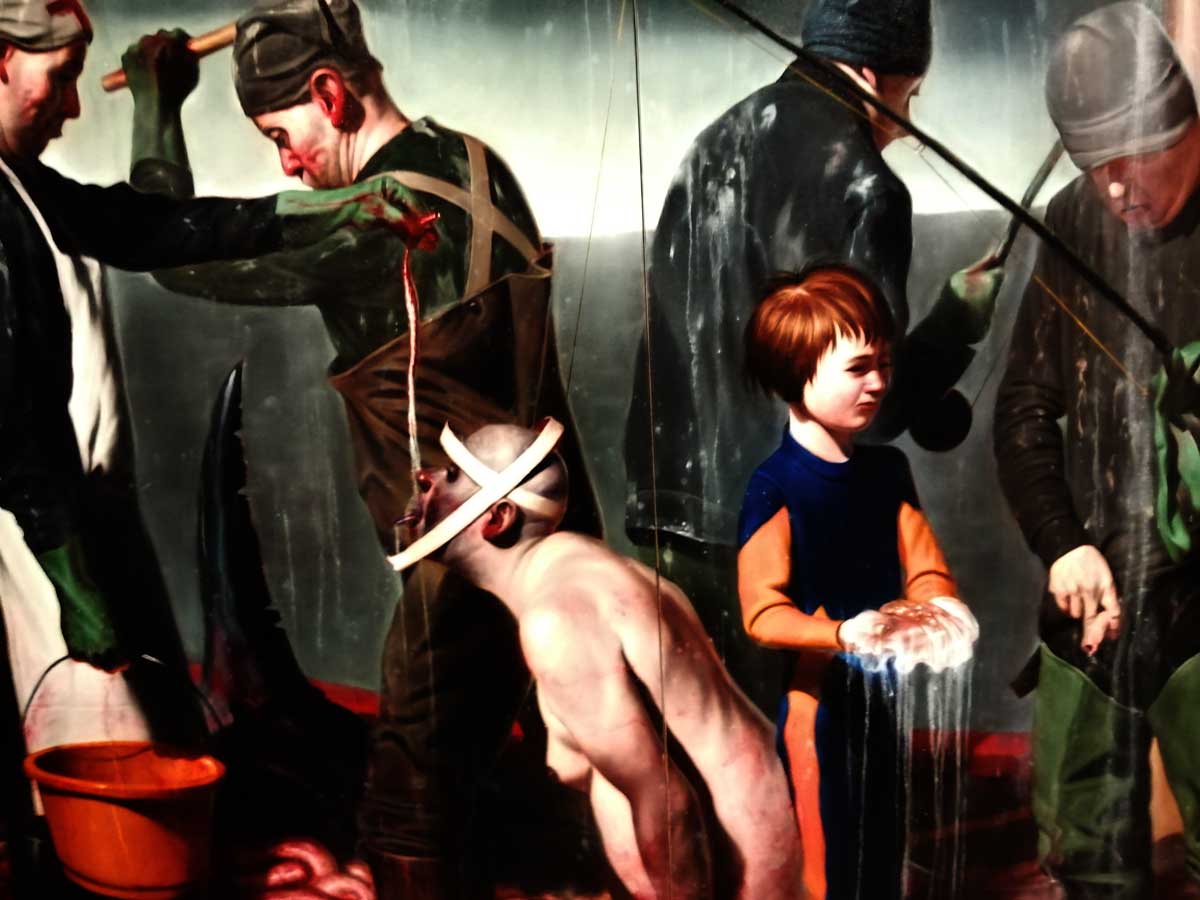 Unsettling? I’m not sure if that is the over riding emotion, but then am I making the mistake of looking at it all from the point of view of a painter? Should I park that outside (can I?) and read it as everyone else would? is that possible? “Ken Currie is renowned for his unsettling portrayal of the human figure”. is it unsettling? Ii is awe inspiring. Is the ambition, the scale, the sheer boldness the thing here? Or is it the richness of colour, those reds, those reds! But then you do look. you do start to (try to) read the faces, the relationships, the reality, the unreality, the being alone and at sea, the grandiose demands made, that he makes.