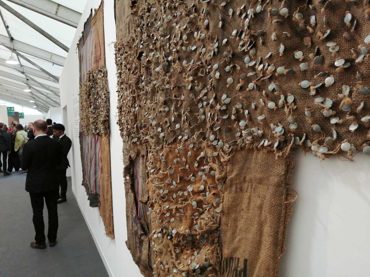 And, like we’ve already said, is there more actual painting this year, it feels like there’s more actual painting? Is there less bulshit? Is that it? is there far less bulshit in here, and was there really only one annoying New York gallery intern this year? There’s usually at least four or five. Textile based art is reasonably well represented again, there’s some healthy hangings, again mostly rather conservative though, nothing too radical, Ibrahim Mahama‘s Jute Sacks, courtesy of White Cube are worthy of mention, a piece (or a couple of pieces) called Twice As Tall.