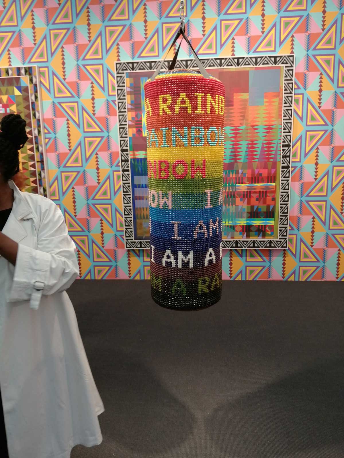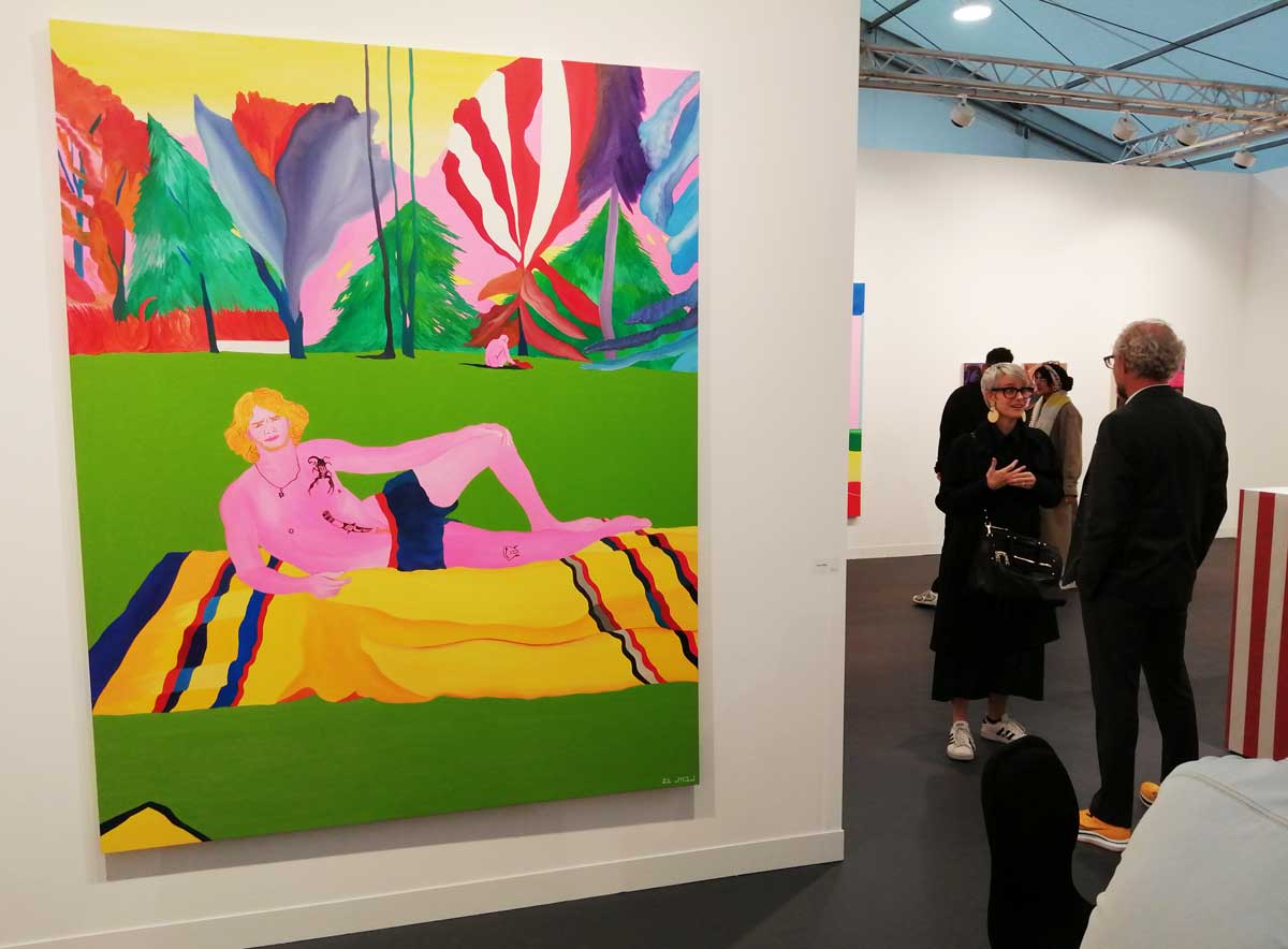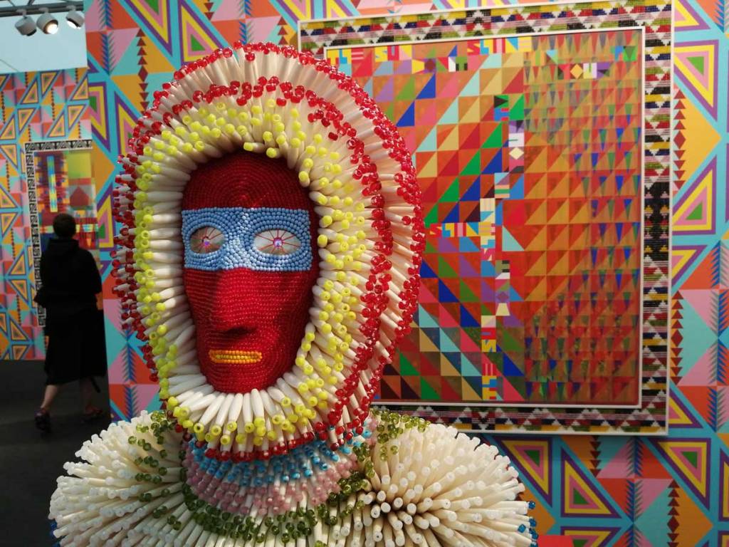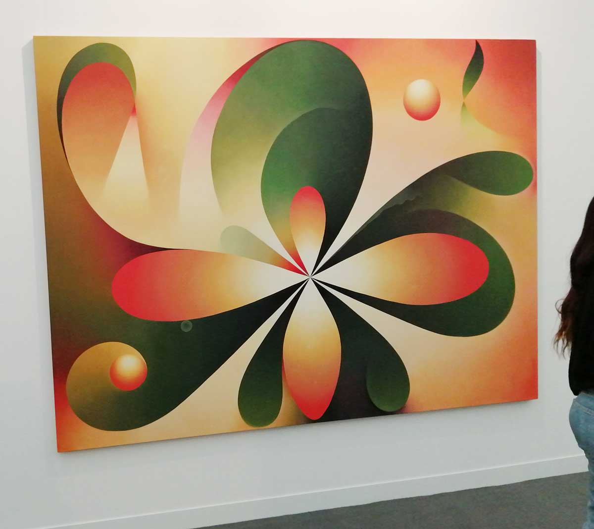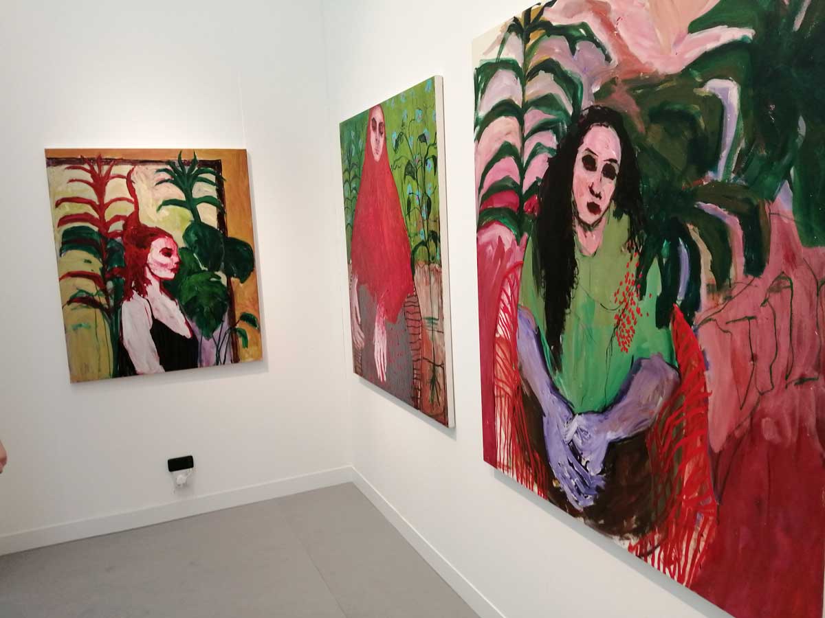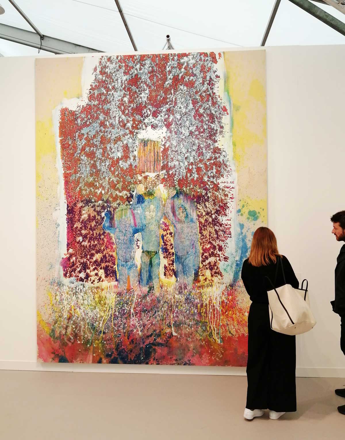 It had been a little slow until Jeffrey Gibson, we knew Gibson’s brightness was coming, we had caught glimpses in the advance publicity we had mostly tried to avoid. There had been good things before that, how could there not be with a beast this big? How could there not be with so many galleries, over 280 galleries from 42 countries (one country short!), of course there’s lots of good art in here. There’s a group of paintings presented by Addis Fine Art, a gallery of both Addis Ababa and London, a group of paintings by Selome Muleta – “one of the most exciting young female artists to emerge from the Ethiopian visual arts scene in recent years, Selome merges portraiture with still life in a meditative exploration of womanhood and interiority” – her paintings are full of so much, they quietly stand out, if you give then the chance in the noise of it all, they quietly pull you in, the faces, the colour, the way the paint is used in such a powerfully positive way, the cats, actually Selome’s paintings really stand out.