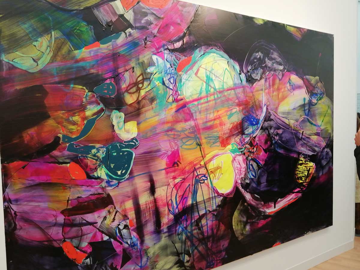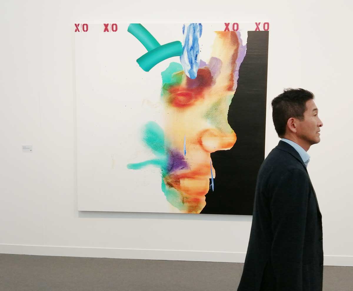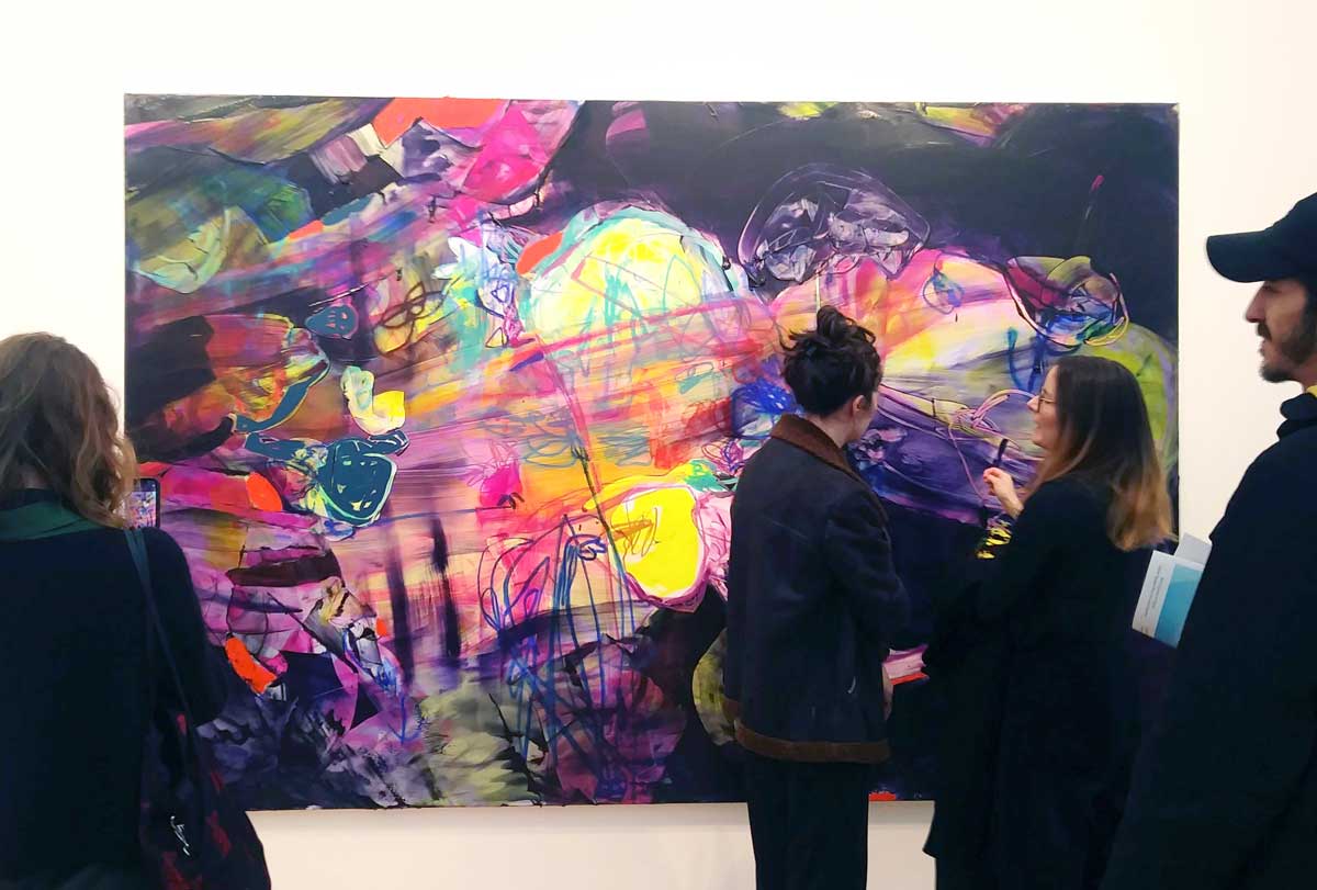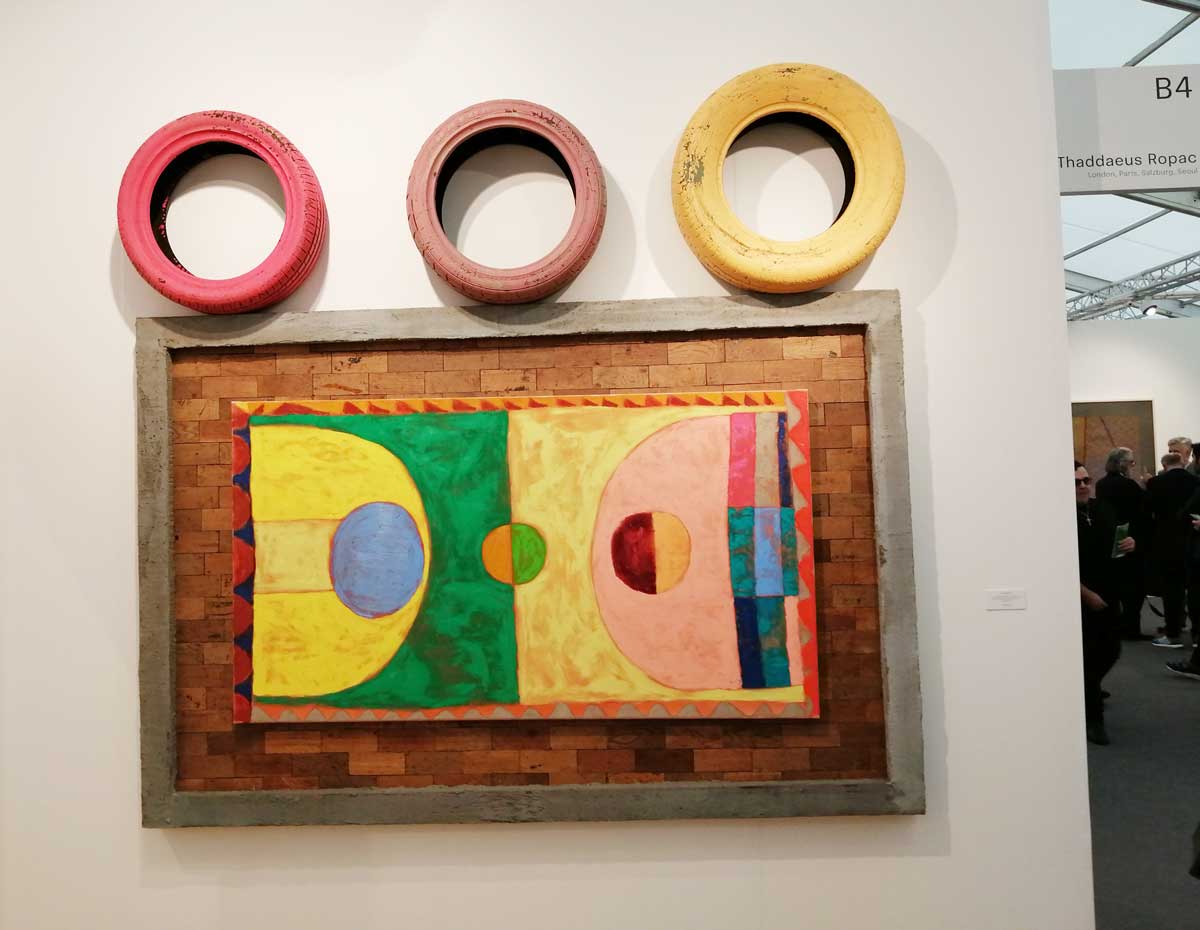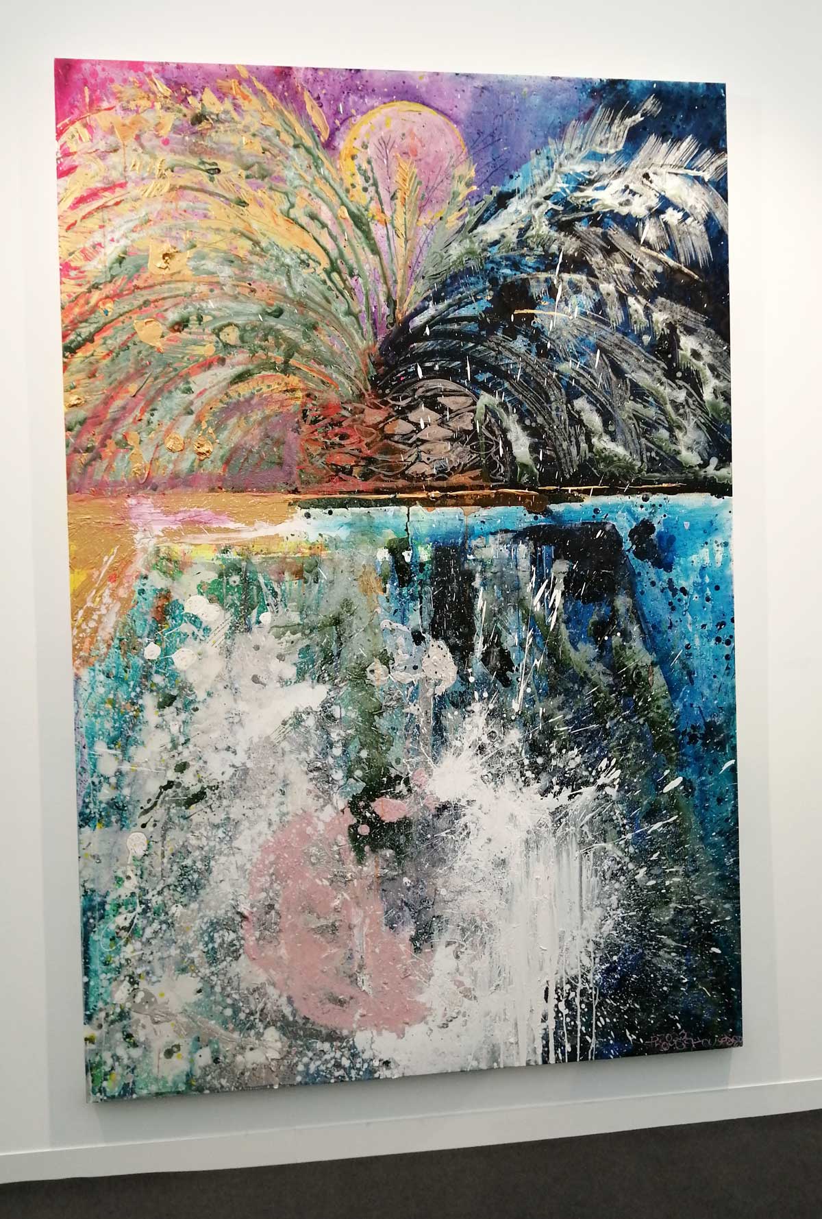 It had been a little slow until Jeffrey Gibson, we knew Gibson’s brightness was coming, we had caught glimpses in the advance publicity we had mostly tried to avoid. There had been good things before that, how could there not be with a beast this big? How could there not be with so many galleries, over 280 galleries from 42 countries (one country short!), of course there’s lots of good art in here. There’s a group of paintings presented by Addis Fine Art, a gallery of both Addis Ababa and London, a group of paintings by Selome Muleta – “one of the most exciting young female artists to emerge from the Ethiopian visual arts scene in recent years, Selome merges portraiture with still life in a meditative exploration of womanhood and interiority” – her paintings are full of so much, they quietly stand out, if you give then the chance in the noise of it all, they quietly pull you in, the faces, the colour, the way the paint is used in such a powerfully positive way, the cats, actually Selome’s paintings really stand out.