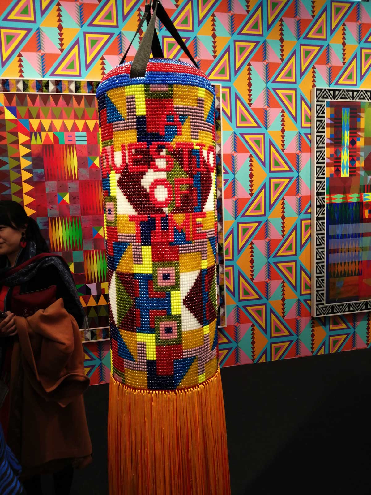 There was the sugar rush of Stephen Friedman Gallery, having already made a couple of very strong Frieze week statements over in their West End galleries with Anne Rothenstein and especially Caroline Coon, Stephen Friedman hit you with a massive rush of colour, an instant hit of excitement with the triumph of their booth featuring Jeffrey Gibson’s rather exciting “Indigenous Futurism” (not my description but we’ll go with it, it fits almost perfectly, we’ll have it), with his bright bright colour, his strong statement and yes, his Native American patterns, with his dizzying geometric designs in bright purples and radiant greens and glowing yellows, his “yes” and his beans and his beads and his punch bags, and love it, brilliant! One of the highlights, probably the highlight, genuinely exciting. Gibson is a Brooklyn-based artist, an American Mississippi Choctaw/Cherokee painter, and sculptor (see , we can use Wiki like the best of ’em), and his takeover of the big Stephen Friedman booth is, in a different way to Deborah Roberts last year, is the thing that finally, after a couple hours of searching for that “thing”, it is the thing that finally ignites Frieze 2022.