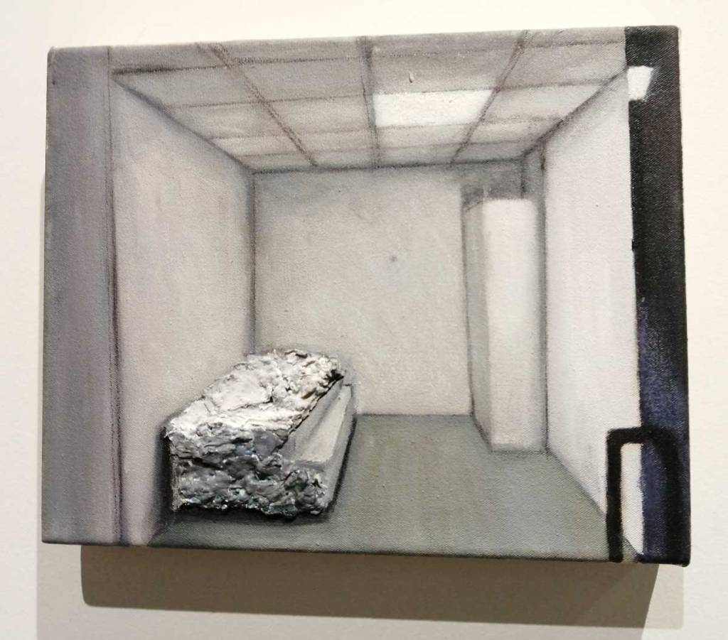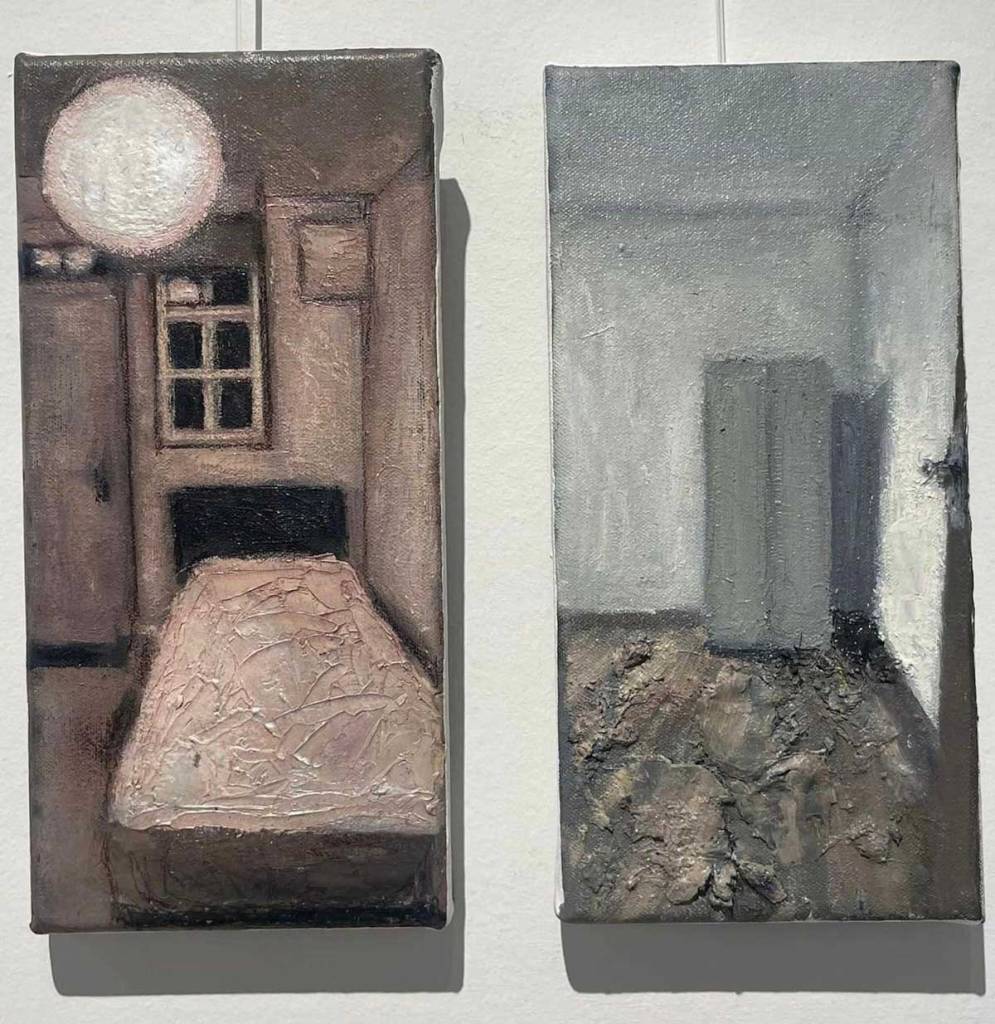 D Contemporary say the gallery is delighted to present Lost Sleep, a solo show by Lee Maelzer, here’s the aforementioned statement – Lee Maelzer is a painter, known for her cinematic depictions of abandoned places, unheimlich interiors and dystopian landscapes. An urban explorer, they are normally based on her own photographs. This body of work, however, stems from images found on Facebook Marketplace for rooms to let in London. Appalled by the prices and quality of what is on offer, she was spurred to begin making what has become an ongoing series that explores the pressing subject of poor housing and the threat of homelessness that hangs over the heads of so many. The bed, in so many historical artworks a place of repose, sensuality and succour, instead becomes uninviting, lumpen, repellent.