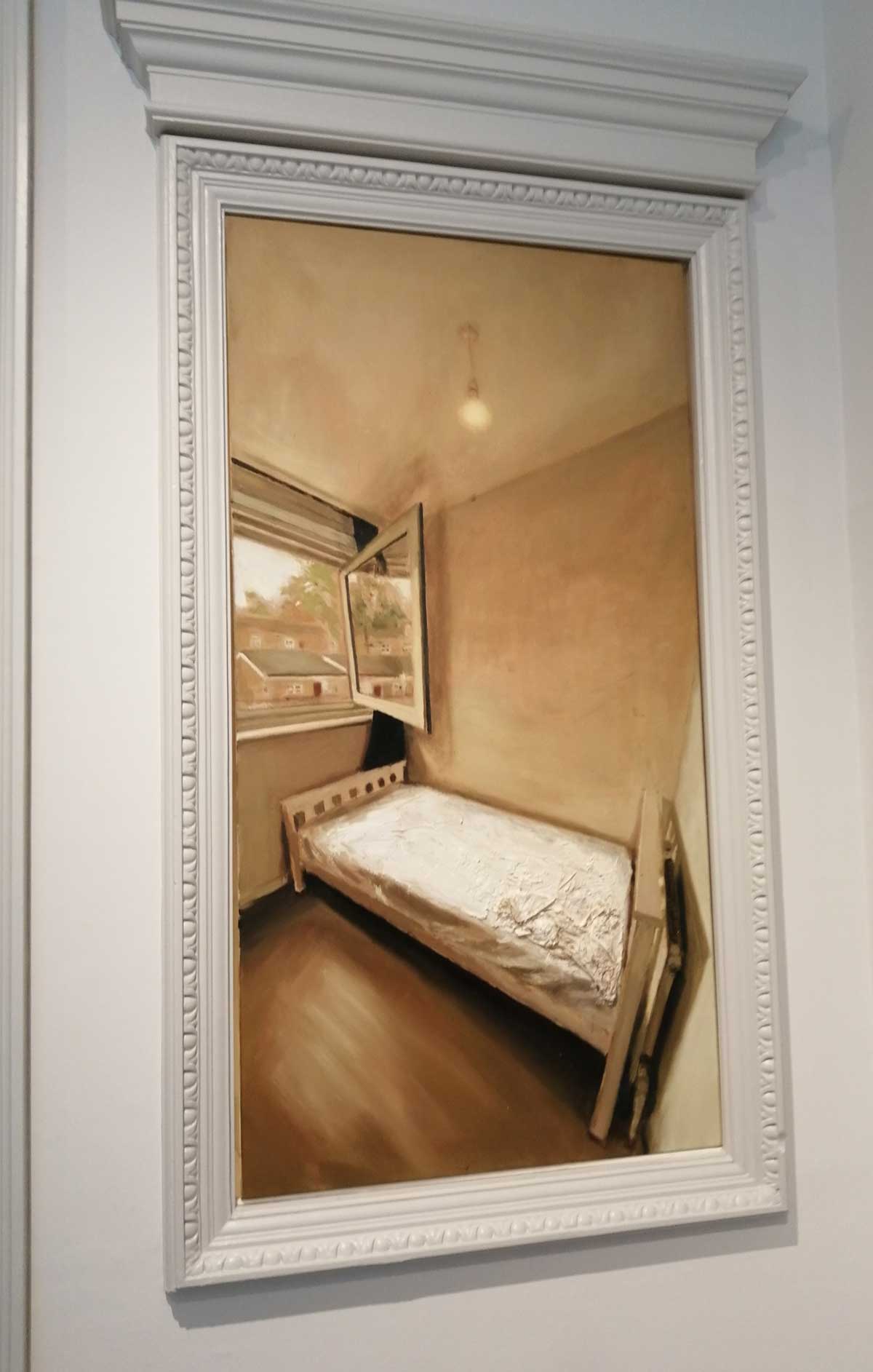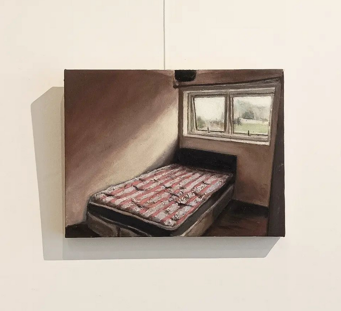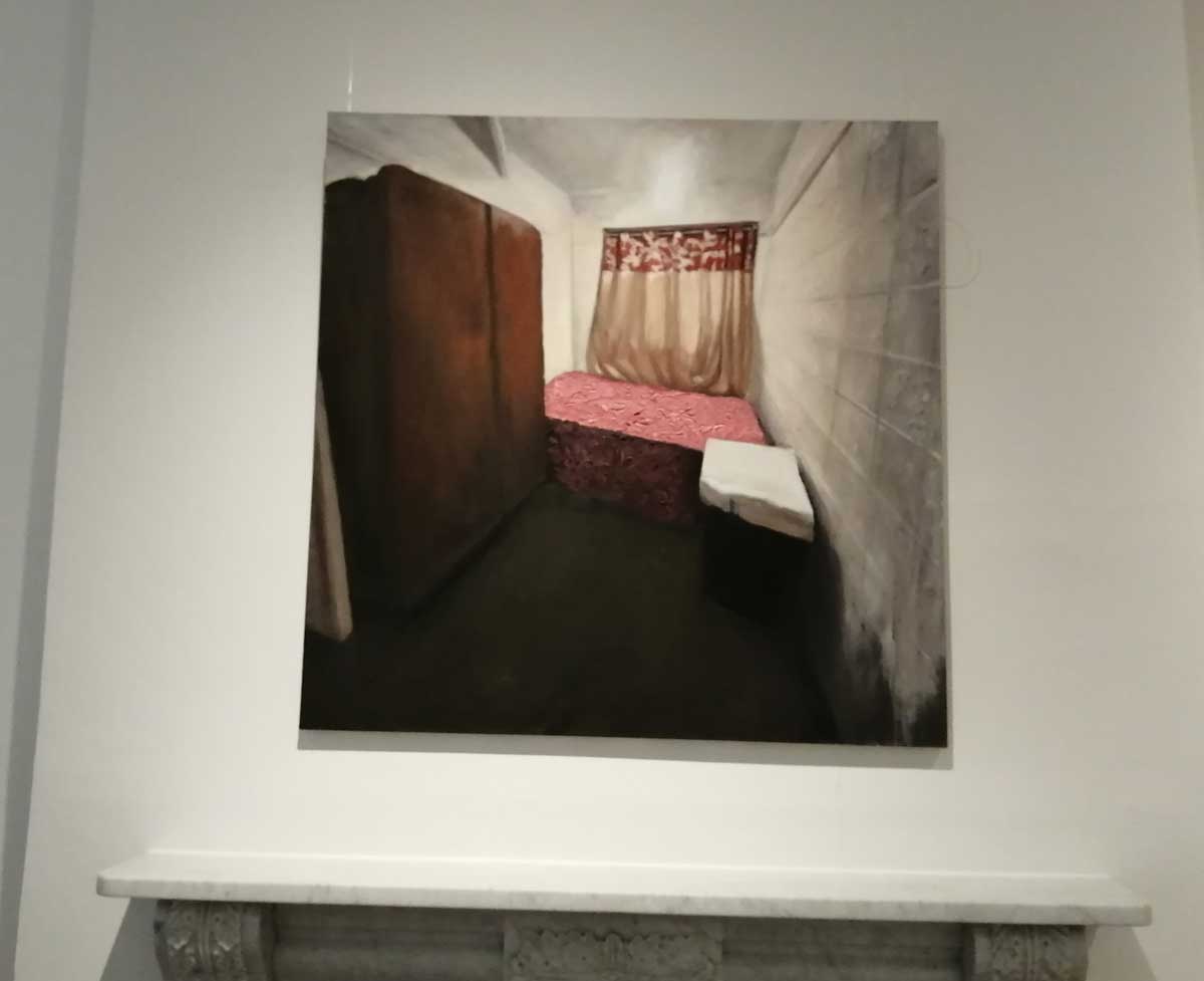 D Contemporary say the gallery is delighted to present Lost Sleep, a solo show by Lee Maelzer, here’s the aforementioned statement – Lee Maelzer is a painter, known for her cinematic depictions of abandoned places, unheimlich interiors and dystopian landscapes. An urban explorer, they are normally based on her own photographs. This body of work, however, stems from images found on Facebook Marketplace for rooms to let in London. Appalled by the prices and quality of what is on offer, she was spurred to begin making what has become an ongoing series that explores the pressing subject of poor housing and the threat of homelessness that hangs over the heads of so many. The bed, in so many historical artworks a place of repose, sensuality and succour, instead becomes uninviting, lumpen, repellent.