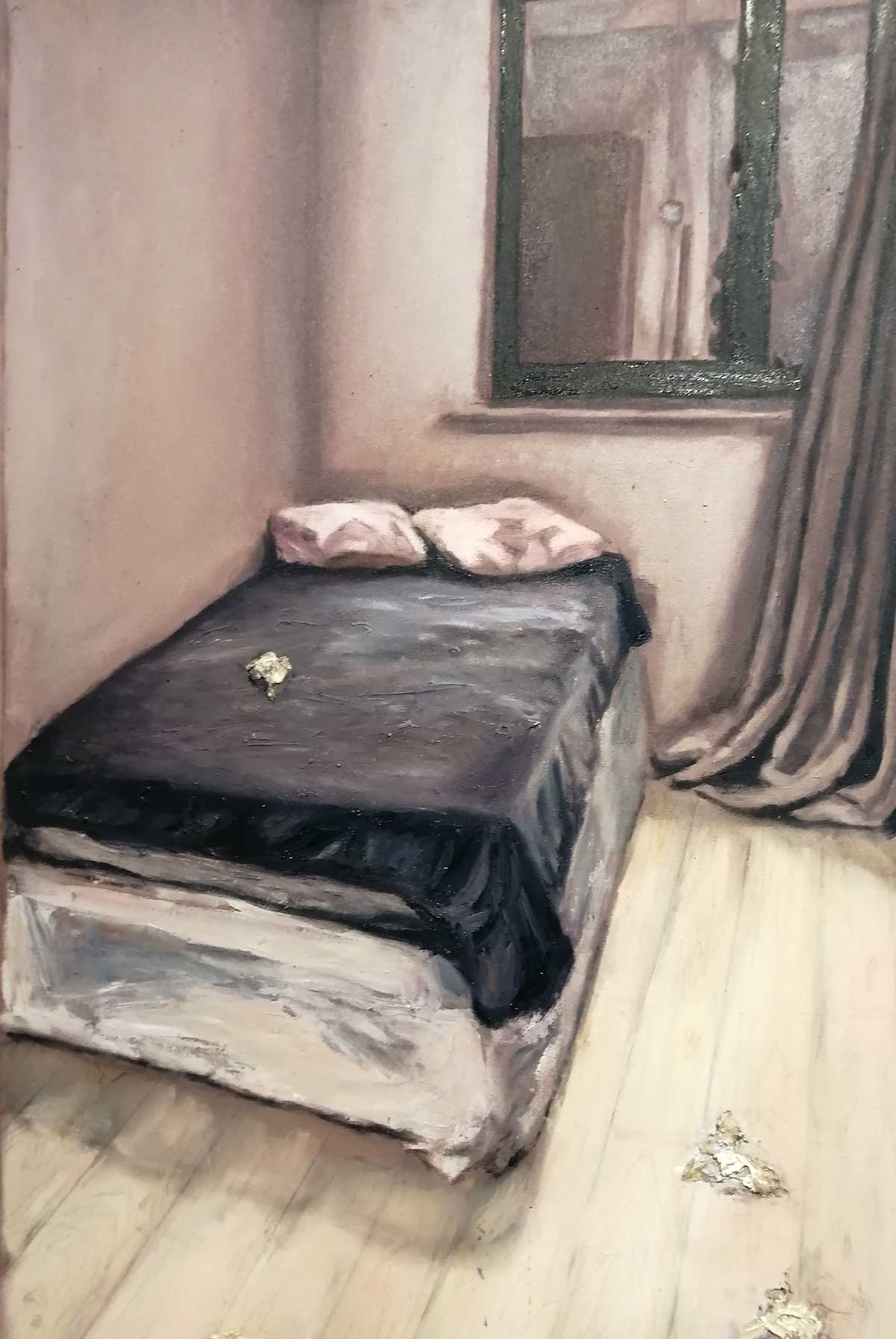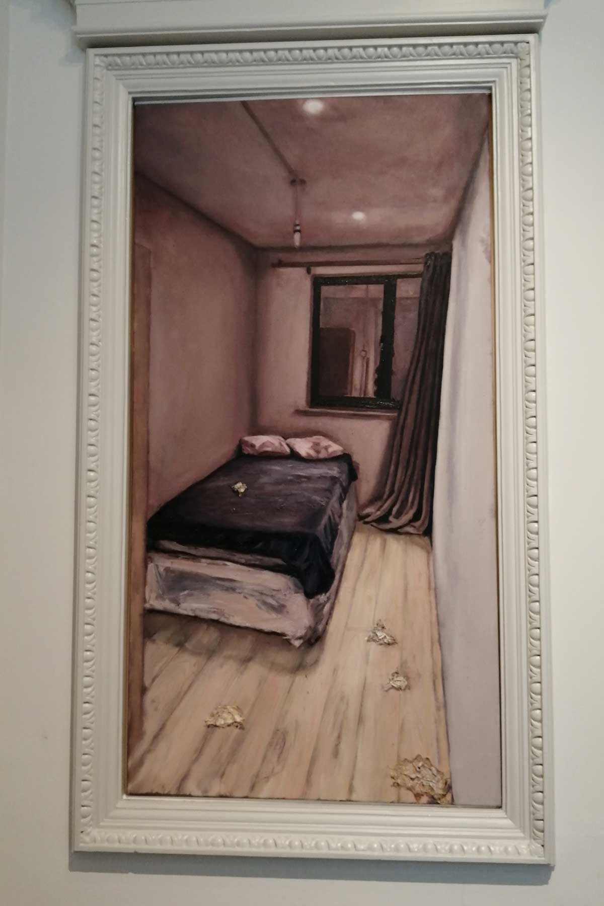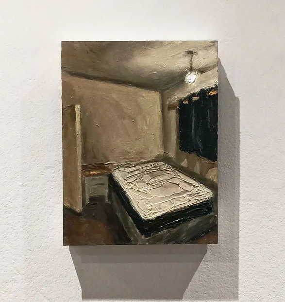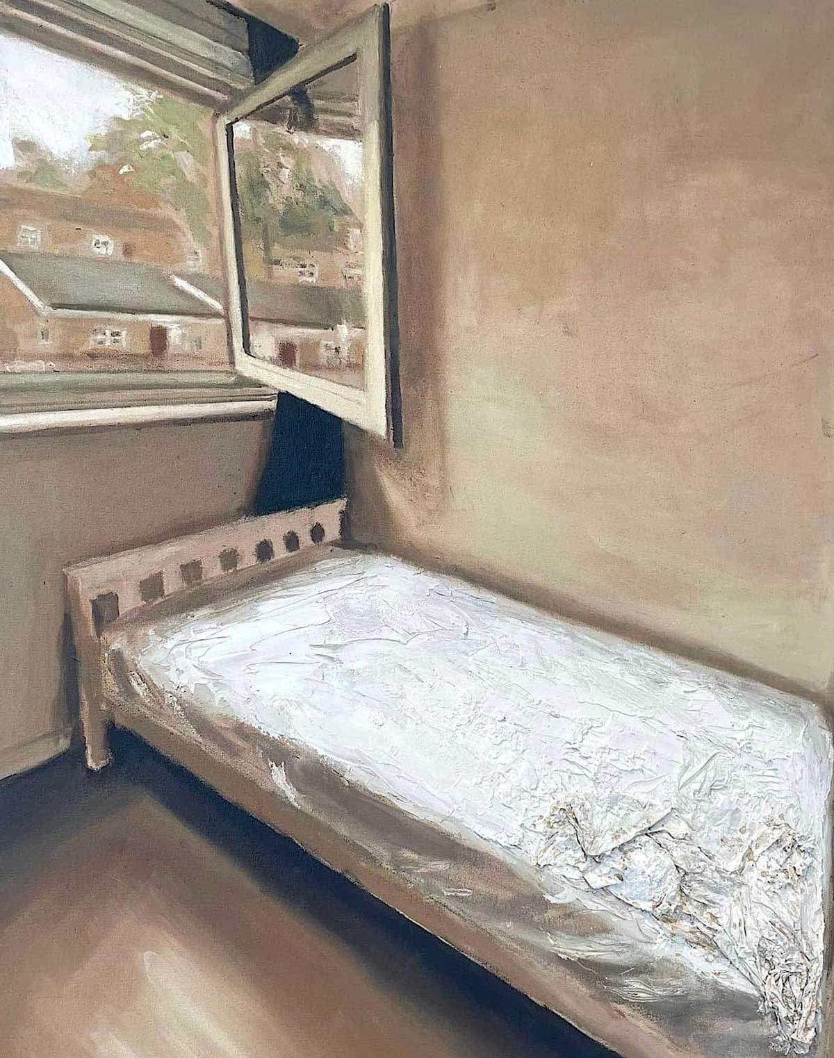D Contemporary say the gallery is delighted to present Lost Sleep, a solo show by Lee Maelzer, here’s the aforementioned statement – Lee Maelzer is a painter, known for her cinematic depictions of abandoned places, unheimlich interiors and dystopian landscapes. An urban explorer, they are normally based on her own photographs. This body of work, however, stems from images found on Facebook Marketplace for rooms to let in London. Appalled by the prices and quality of what is on offer, she was spurred to begin making what has become an ongoing series that explores the pressing subject of poor housing and the threat of homelessness that hangs over the heads of so many. The bed, in so many historical artworks a place of repose, sensuality and succour, instead becomes uninviting, lumpen, repellent.