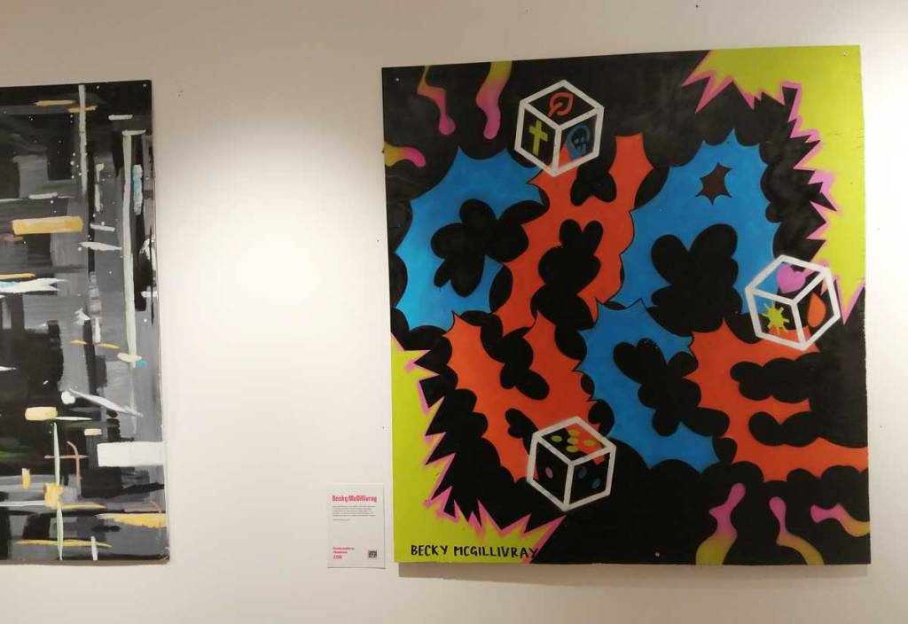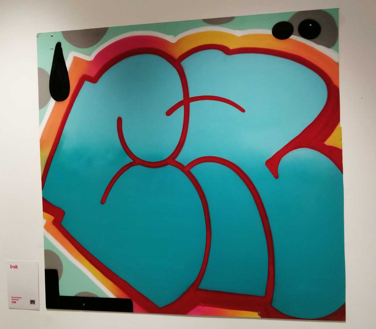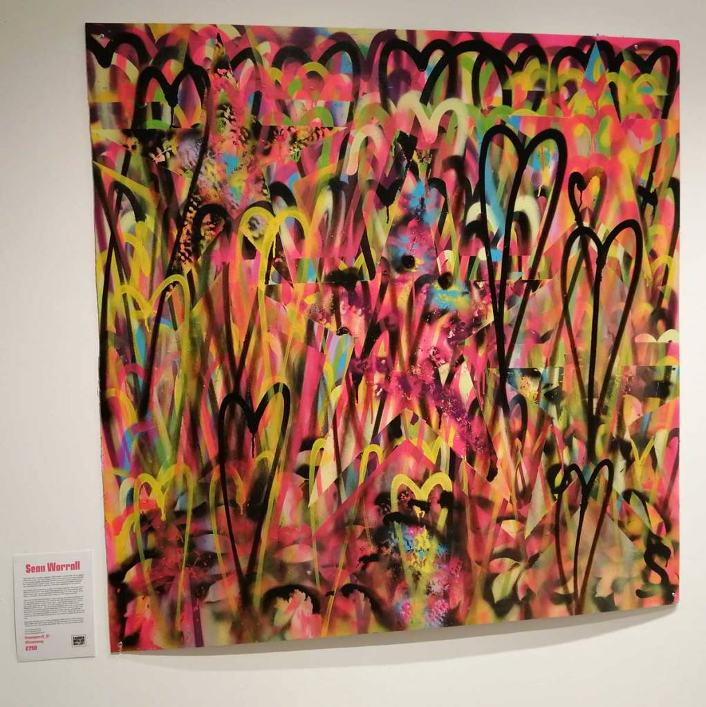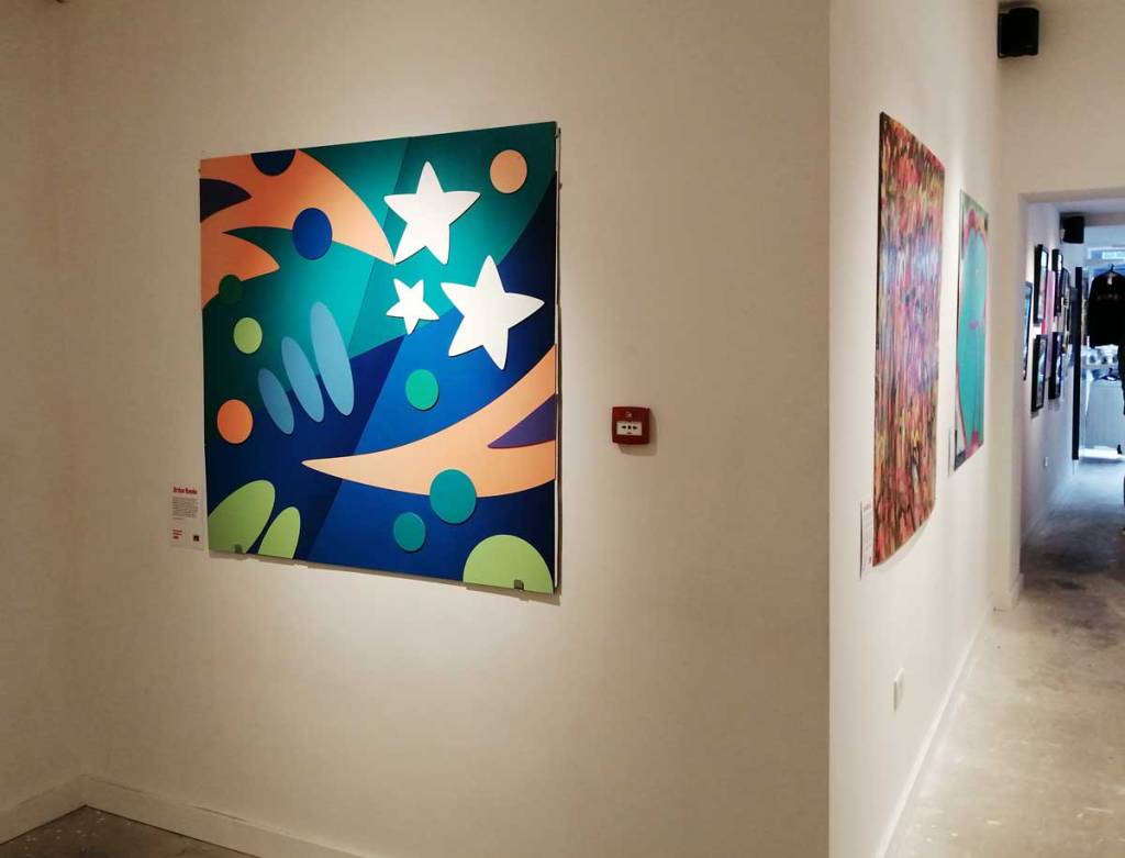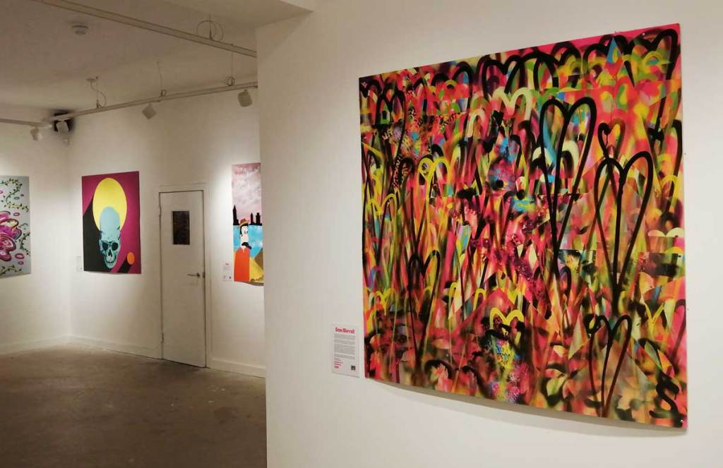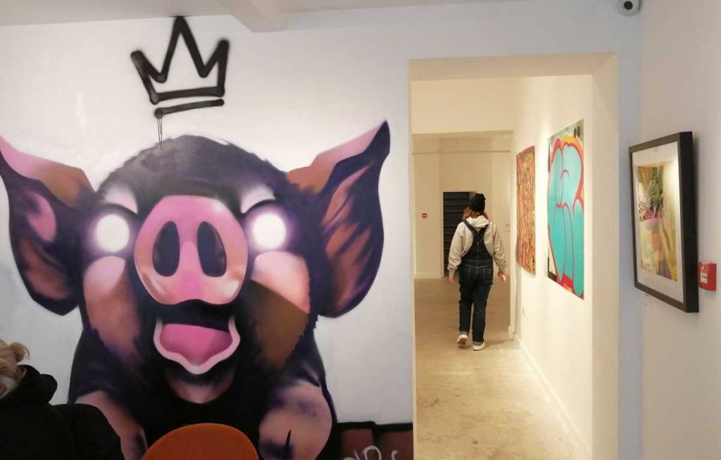 There something like 14 or 15 of the paintings up on the gallery wall (and up for sale), they don’t look quite so exciting up on the cold off-white walls as they did out on the street with all the graff, not so feral, tamed you might say, but there they are, still looking good, some more than others, you be the judge, I couldn’t possibly say. Here’s some photos, I like the one they didn’t have an artist’s name for – apparently someone turned up on the first day of the festival and there was a spare board, she borrowed some paint and painted a great abstract piece and no one got her name, and well, there’s her piece on the wall in the gallery and standing out (stop press, we jsut heard from her, she goes by the name of C). There’s some photos on this page, there’s a whole load down at the foot, the paintings are up on the walls, I think the gallery said they were going to be up on their website with the price details and such in a day or so, the paintings themselves are up there to go see until November 6th, there in the back room behind the big Tom Blackford pig, not the one Cameron, no let’s not go there, he was still better than Truss and maybe she didn’t have time to be as bad as Boris, she probably was a little more corrupt and a little less entitled and thinking she was born for it than Johnston and the next one will probably be even worse and the general public will just let it all happen and say stupid things like “you never gave her a chance, and bring back Boris, I liked him, he’s a character isn’t he!” while they kill off what’s left of the NHS and line their pockets some more and well, that was my day and there’s the (photos of the) paintings and this really isn’t a review, and I really was just wanting to tell you that the paintings from the festival are now up on the gallery wall in Camden. (sw)