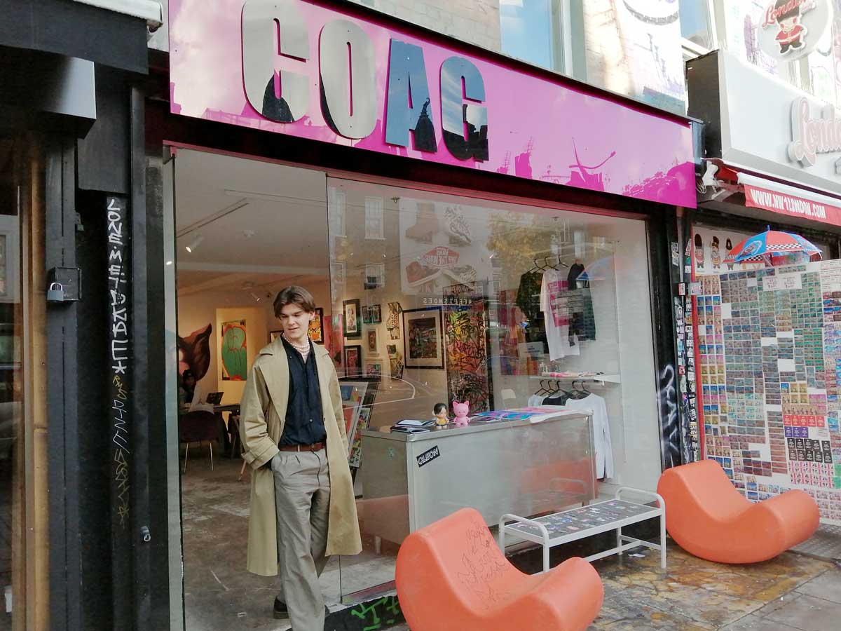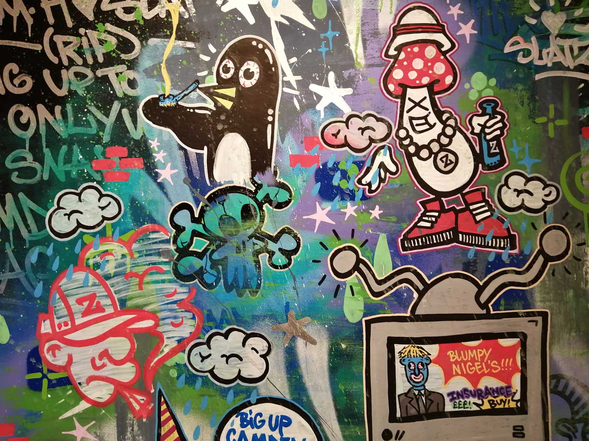 So anyway, this morning, while Liz was still clinging on, something like halfway through the morning, somewhere around Hackney on the edge of Dalston and heading for Camden with the red bats behind us, riding a red shark of a train and heading to Camden because we’d got a message to say that some of the paintings from that festival that seemed like something that had happened several lifetimes ago (when it really was only last month), were now up in that indoor gallery in Camden (not far from where we had once chased Mint 400), a gallery that goes by the slightly odd name of Camden Open Air Gallery (actually the name makes perfectly good sense when you see what they’re doing in there). By the time we got to the North London borough the Prime Minister had gone and the headline on the first edition of the Evening Standard was well out of date, and oh dear Camden, t-shirts with the Queen wearing Bowie’s Ziggy make up? Really? Who thought that was a good idea? Camden may have been tarted up a bit but it is still very much bad taste Camden and there’s the gallery, on the main strip waiting for us.