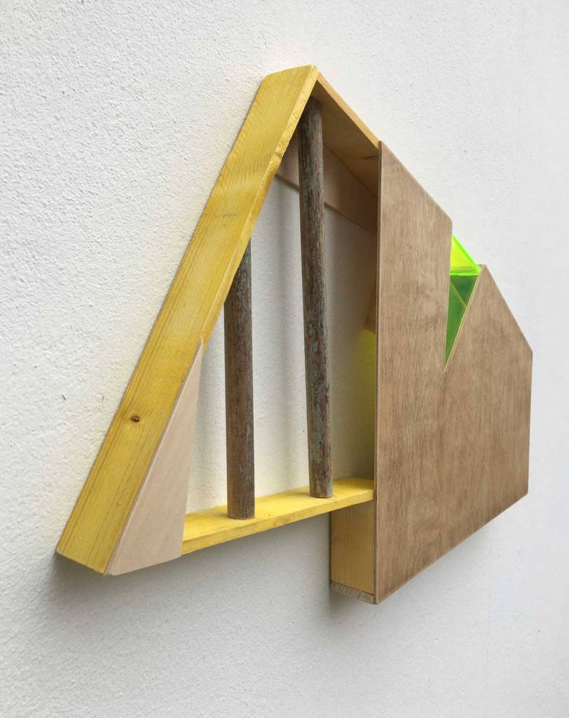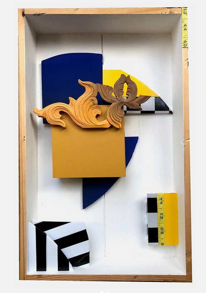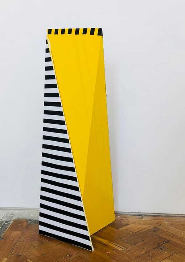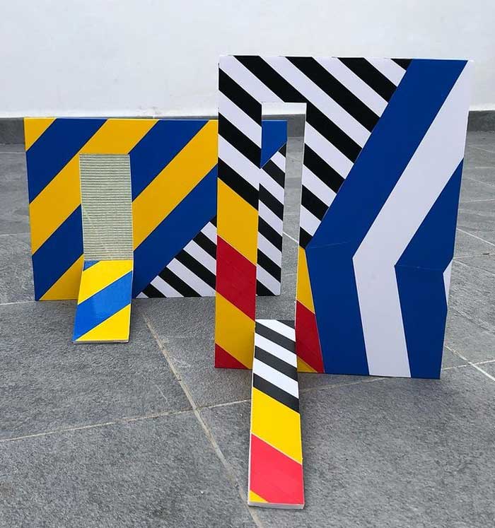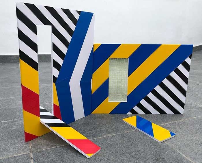 “My work is at times paradoxical, utilising maximalist/minimalist aesthetics. I find various objects and defamiliarize their original state and in some cases reference abstract cubism and pop art. The focus and my usages of colour functionality in a fractured confinement, more recently boxed assemblages creating abstract pictorial dialogues. My investigations of found colour and abstract signs explores the effects of light and atmosphere on colour. There is a productive tension in the works sitting between abstraction suggesting formalism and a more sign-like abstraction that is found in this world which provides the means to defamiliarize objects (or the conventional supports). It becomes necessary to source alternative art materials and install work in non-traditional settings, bright colours of electrical tape in Andalucía reflect a bold crispness, or the south-east English coast where shorelines and changing sky tones affect the brilliance and depth of colour. I question my surroundings and by doing so discover new ways of creating and exploring how visual signs and symbols produce meaning”.