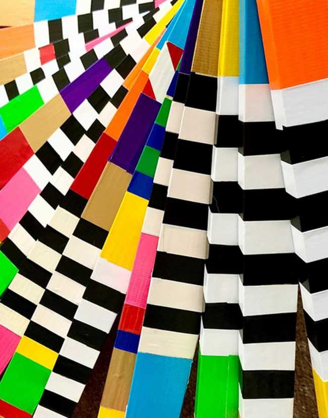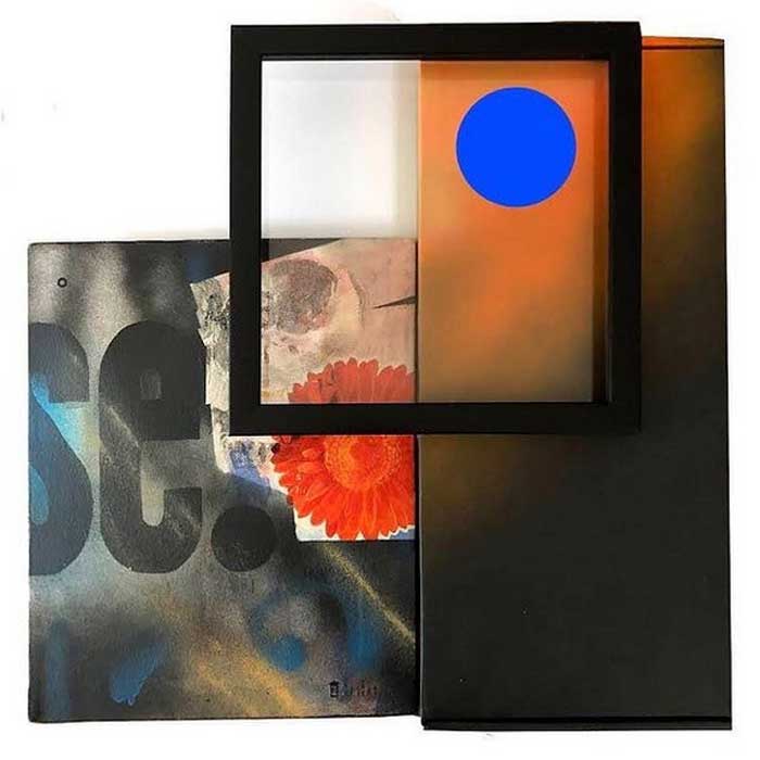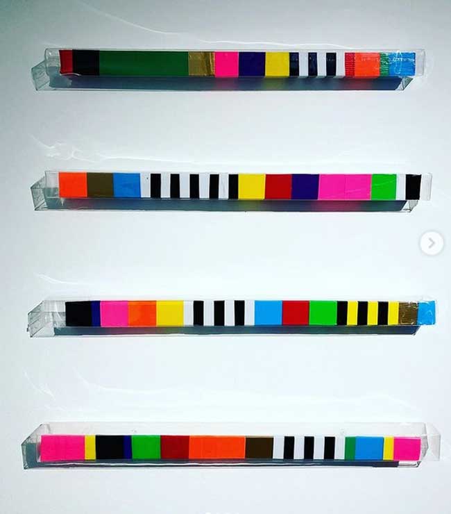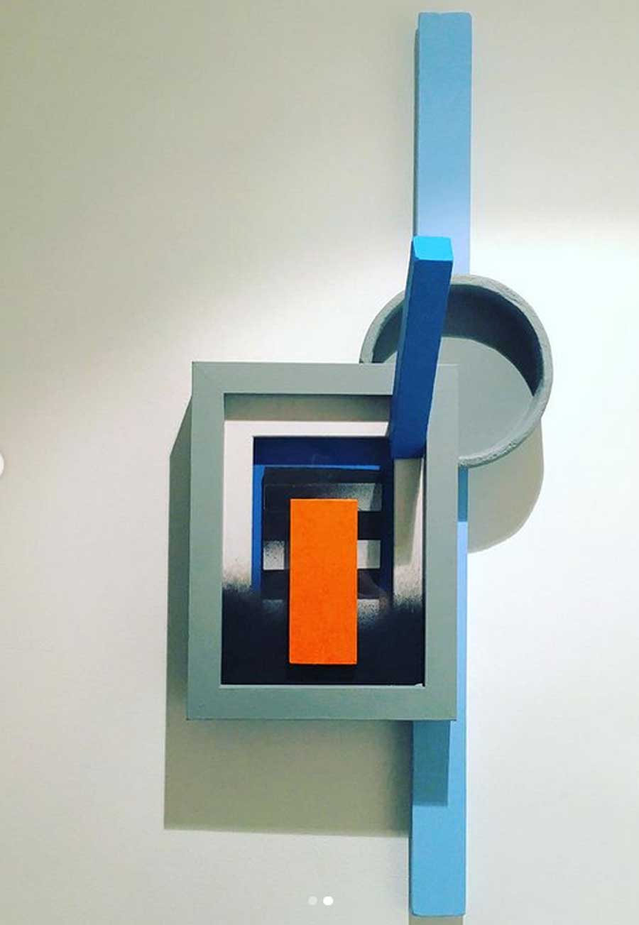 “My work is at times paradoxical, utilising maximalist/minimalist aesthetics. I find various objects and defamiliarize their original state and in some cases reference abstract cubism and pop art. The focus and my usages of colour functionality in a fractured confinement, more recently boxed assemblages creating abstract pictorial dialogues. My investigations of found colour and abstract signs explores the effects of light and atmosphere on colour. There is a productive tension in the works sitting between abstraction suggesting formalism and a more sign-like abstraction that is found in this world which provides the means to defamiliarize objects (or the conventional supports). It becomes necessary to source alternative art materials and install work in non-traditional settings, bright colours of electrical tape in Andalucía reflect a bold crispness, or the south-east English coast where shorelines and changing sky tones affect the brilliance and depth of colour. I question my surroundings and by doing so discover new ways of creating and exploring how visual signs and symbols produce meaning”.