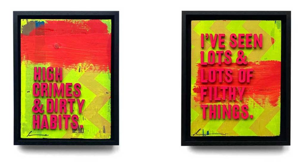 “In my print work I love working with found ephemera and objects like maps and love letters and deactivated hand grenades and it’s the same with my street art work, using phrases and words that I have remembered and overheard from the past and brought them to life in 3D. Coming from the world of advertising where everything I did had to make sense, I now love to create pieces that don’t make sense but create a level of intrigue and I find that really interesting and powerful. The concept behind High Crimes & Dirty Habits was to explore the levels of ‘crimes and misdemeanours’ that we all experience on a daily basis, from procrastination to attempted murder, and create a reaction, I want people to see the pieces and be inspired or challenged, to feel guilty or slightly uncomfortable but most importantly to have a laugh.”- Dave Buonaguidi