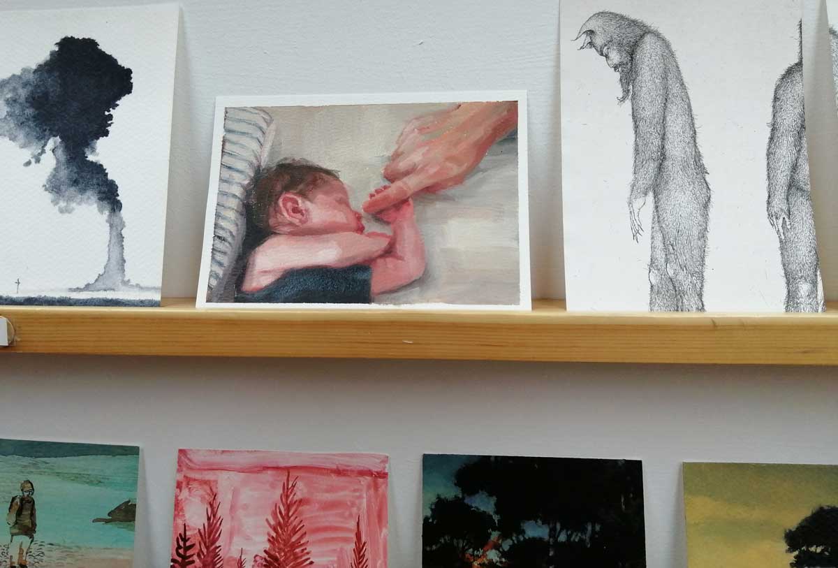 We also spied some delightful Susie Hamilton dogs, a Heath Kane queen or two, some pink and blue skylines from some bloke called Sean Worrall,there’s someof those Russell Herron faces. There are couple of beautiful Greg Becker paintings, loved the Sarah Arsenault pieces and those Ella Friere luggage labels are delicious, but it really is hard to pick favourites or highlights and there are quieter pieces that we’re only just seeing as we look back at our (not very good) photos or explore the catalogue a little more (there is a lot to take in). I don’t want to pick out highlights right now, I make no secret on these pages of my admiration of the work of Norman Ackroyd, did like those Banana leaves of Aiden Myers, Jason Gibilaro‘s four Utopia paintings and those gorgeous Tushar Sabale twilight pieces and Bidisha Mamata and those two Shem pieces and no no no, can’t be picking out favourites today, not yet, I need to go back and look again armed with the experience of last night and the cold light of day that is catalogue. No, i;m not sitting on the fence here, well yes I am, but really last night’s viewing (and it is a shame that the pieces are only on view for a couple of hours for just one evening), the viewing was about the whole thing, the one big whole, the event as one thing. The one big thing really was exciting last night (and yes, exciting to be one of the invited participating artists), the real strength of the event and this viewing is the one big whole and really was there anything on the wall last night that didn’t work? I might be a participating artist so yes, it is a little uncomfortable to say so, but the stardard last night really was rather high. So no, really not fair to pick out individual pieces, not right now (I will get off the fence in a day or so, watch these pages). The Art On A Postcard team really are good at finding exciting art and artists, their events are always worth keeping a keen eye on, spied a number of pieces by artists I had never heard of before last night, certainly a few to follow, to watch out for.