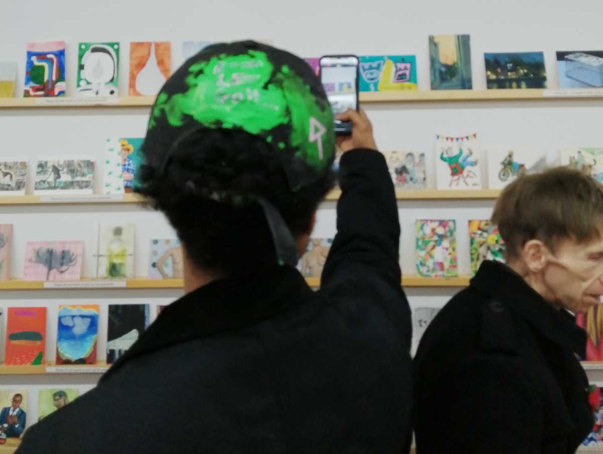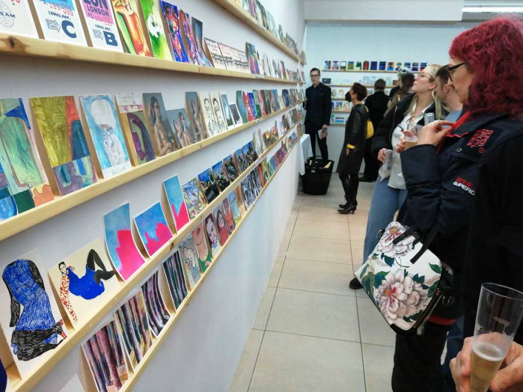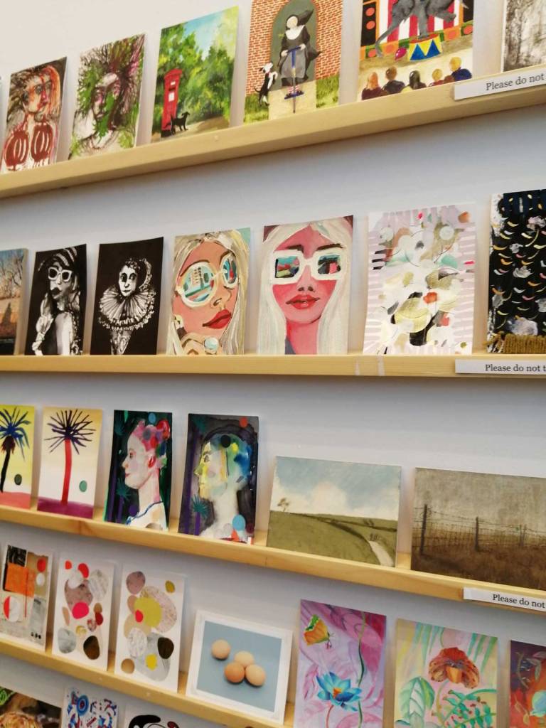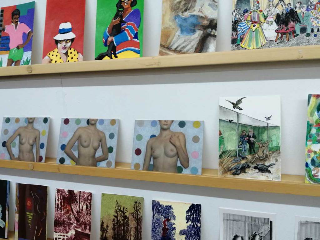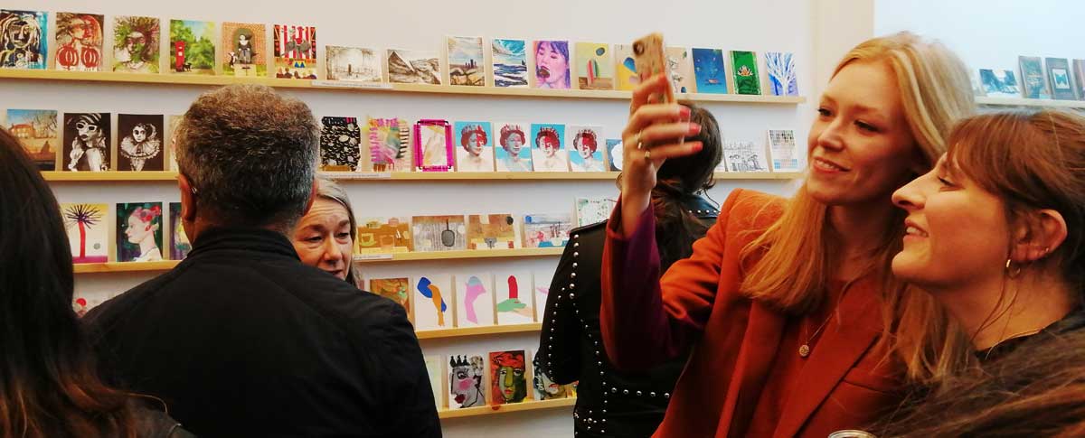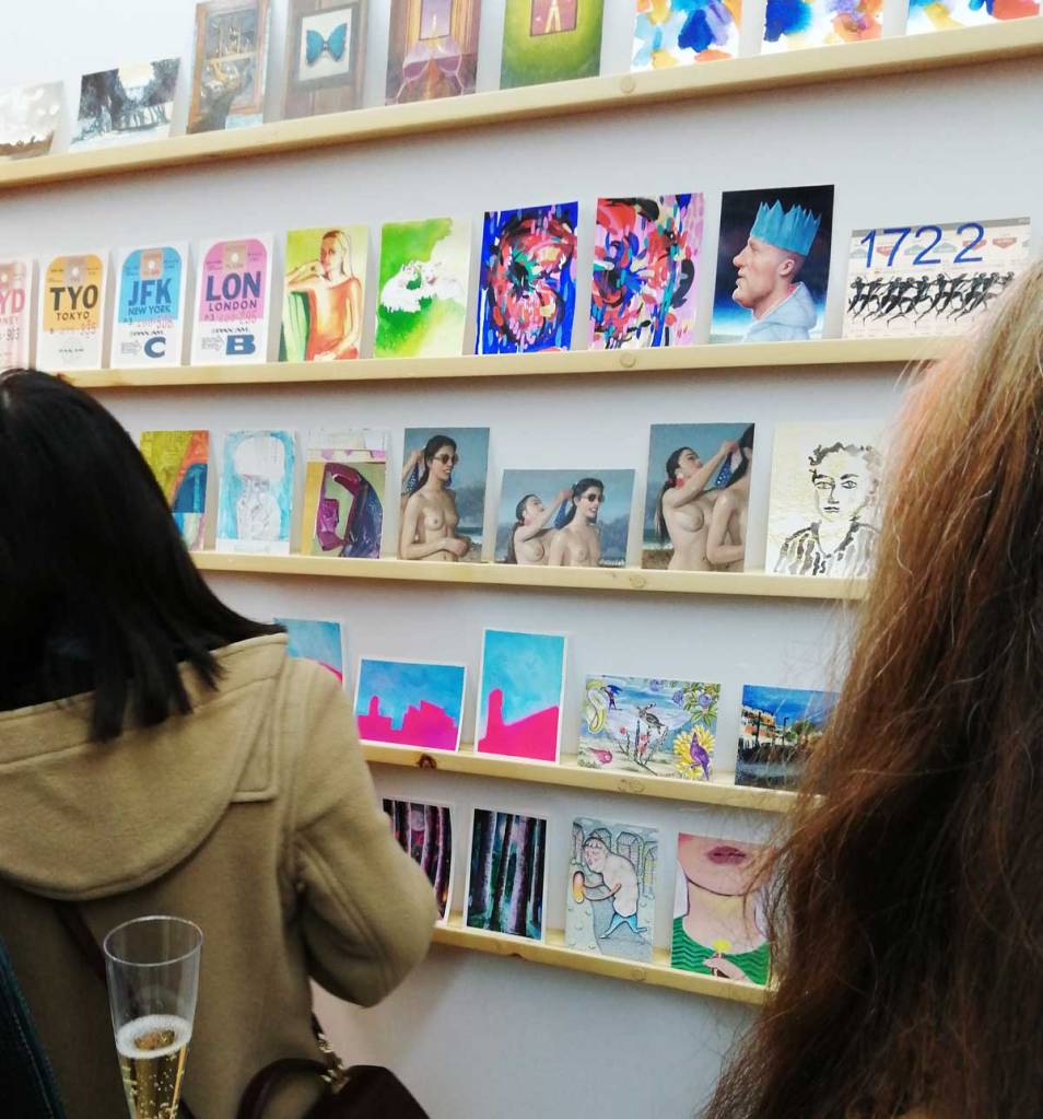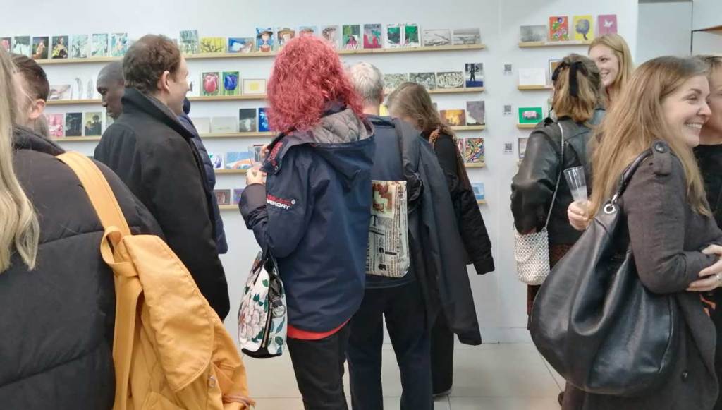 The Art On A Postcard Winter Auction private view at The Bomb Factory, Covent Garden, London, November 8th 2022 – The first thing that strikes as you walk into the very busy Covent Garden gallery is just that how much more alive the paintings and pieces are in here than they are when you view it all on line or indeed in the catalogue, just how bright it all is. An obvious statement you might think but it really does feel exciting in here. Where to look first? There’s quite a (friendly) battle for attention being waged by the five hundred plus paintings up in lines on the shelves on the Bomb Factory walls for this one night only.
