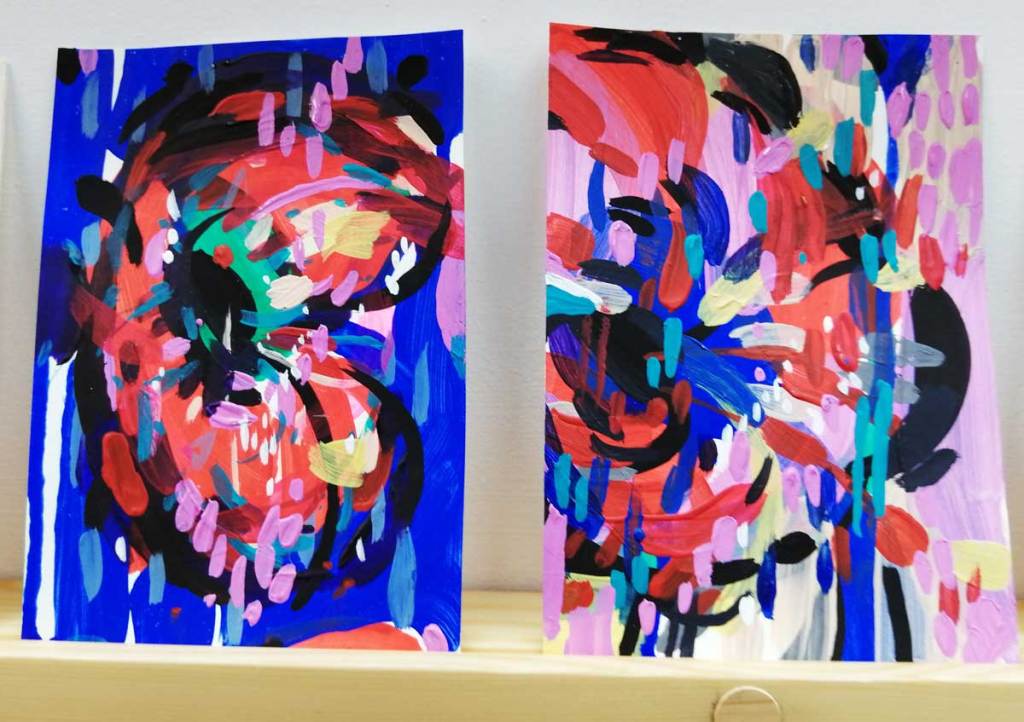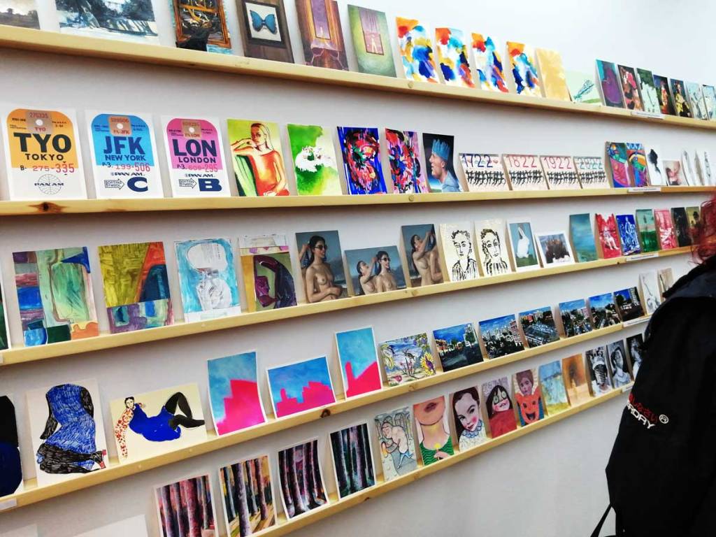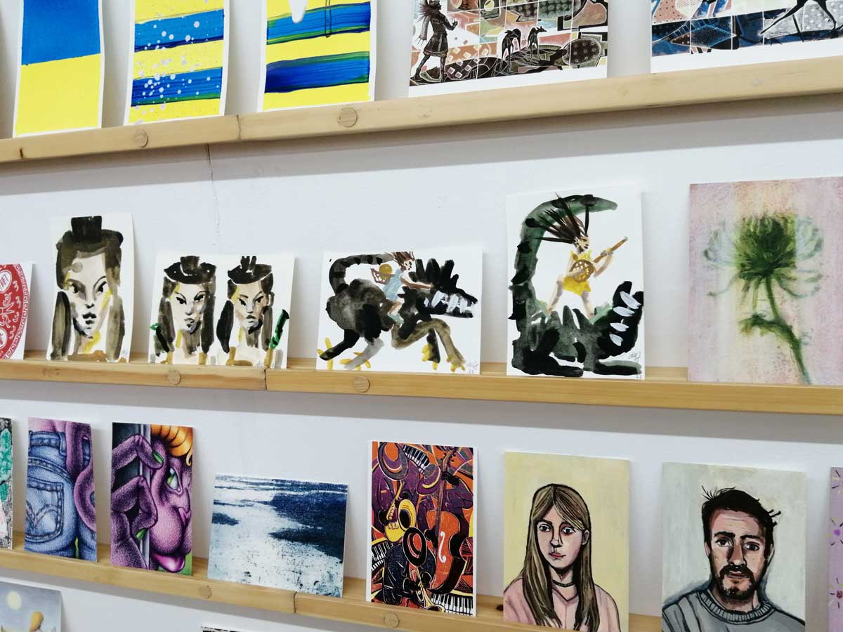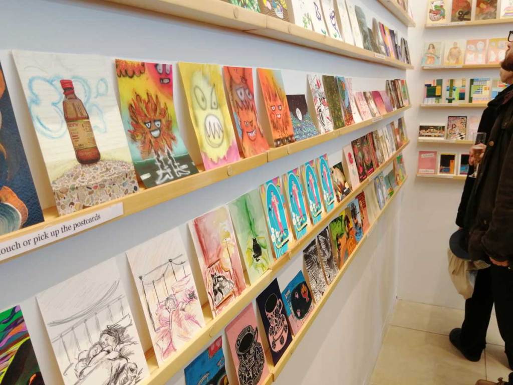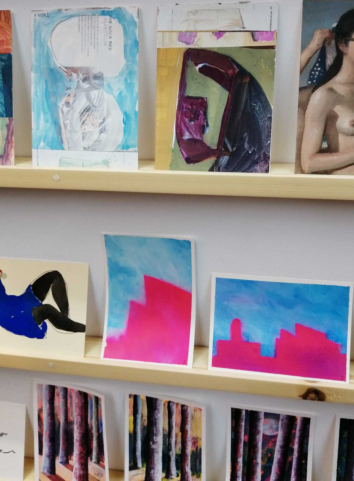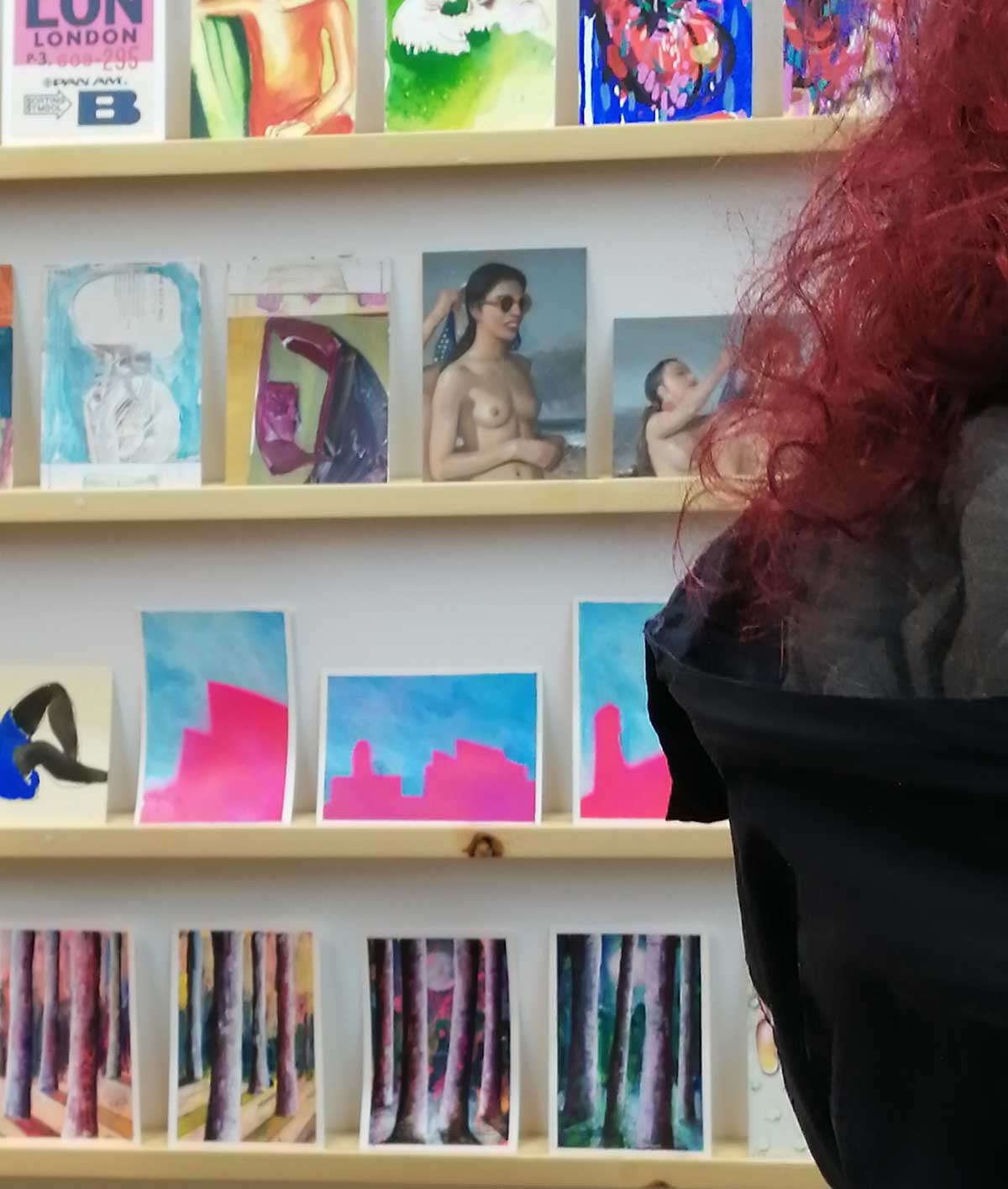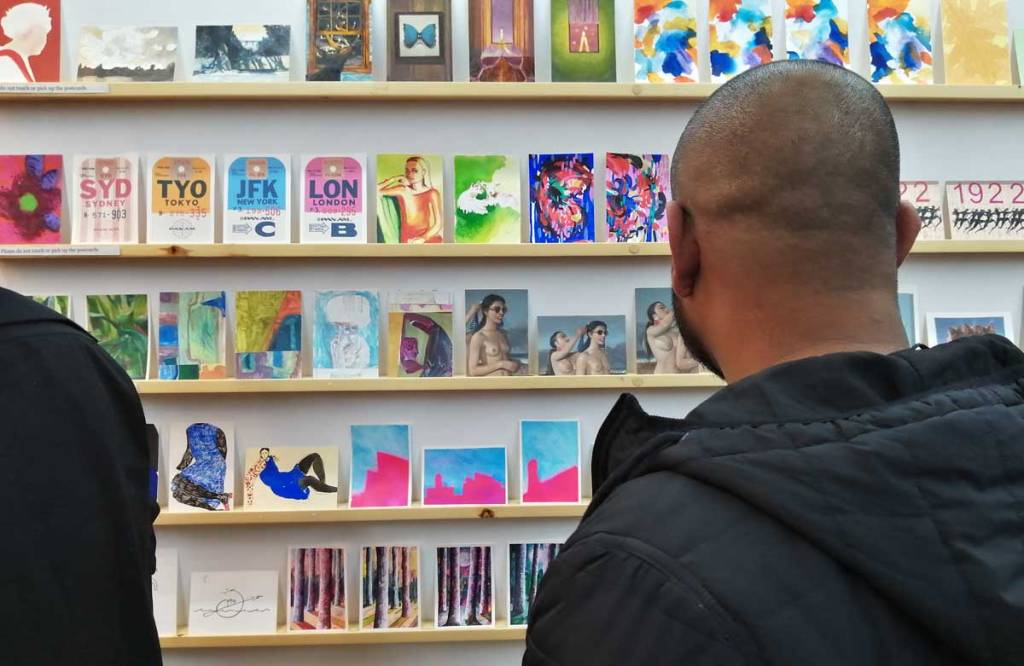 The Art On A Postcard Winter Auction private view at The Bomb Factory, Covent Garden, London, November 8th 2022 – The first thing that strikes as you walk into the very busy Covent Garden gallery is just that how much more alive the paintings and pieces are in here than they are when you view it all on line or indeed in the catalogue, just how bright it all is. An obvious statement you might think but it really does feel exciting in here. Where to look first? There’s quite a (friendly) battle for attention being waged by the five hundred plus paintings up in lines on the shelves on the Bomb Factory walls for this one night only.