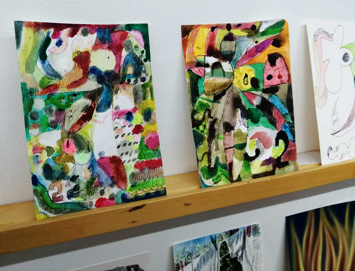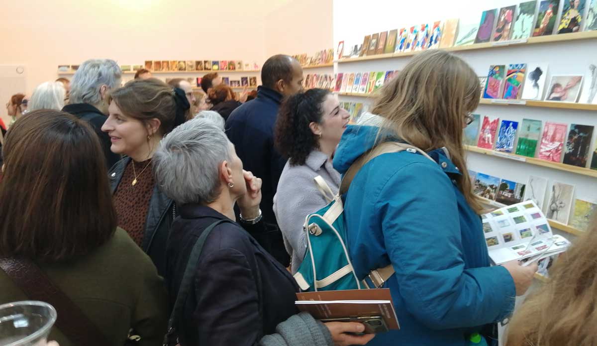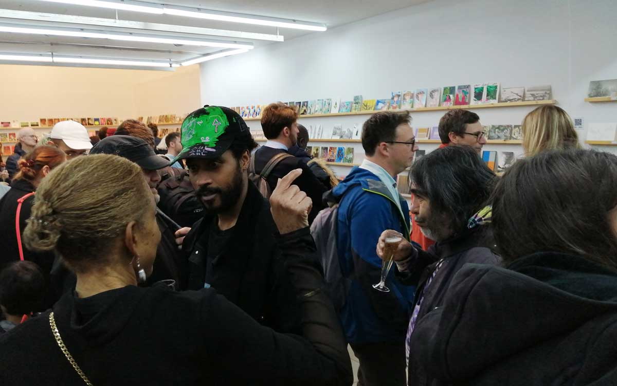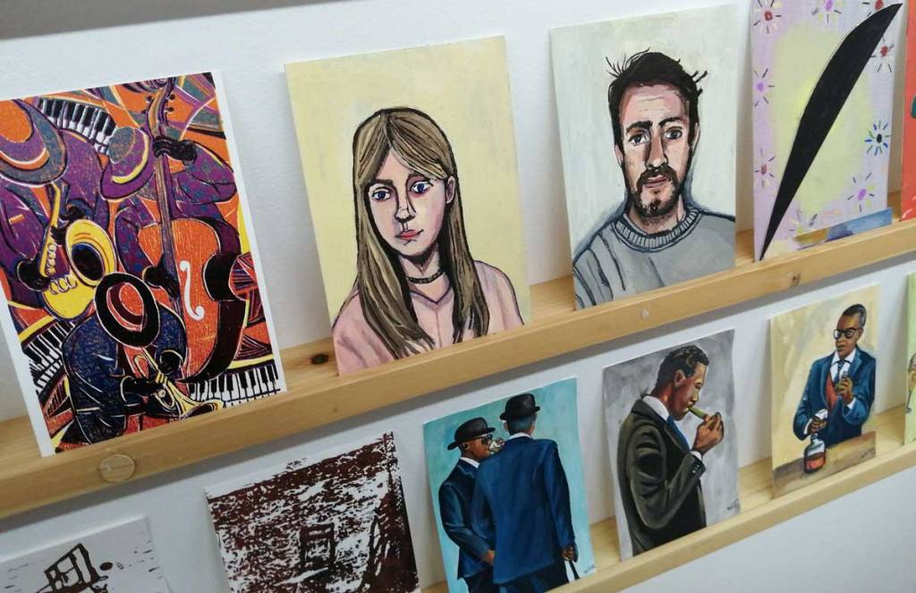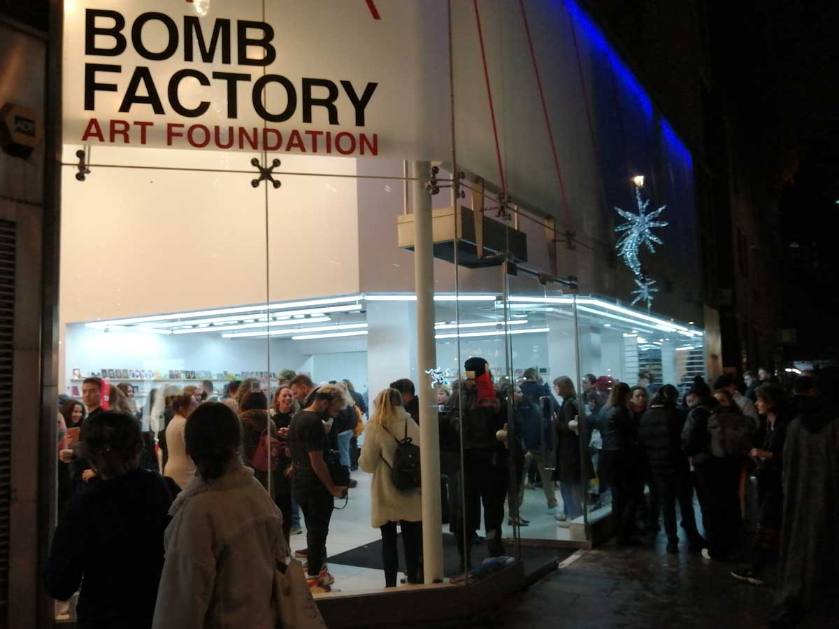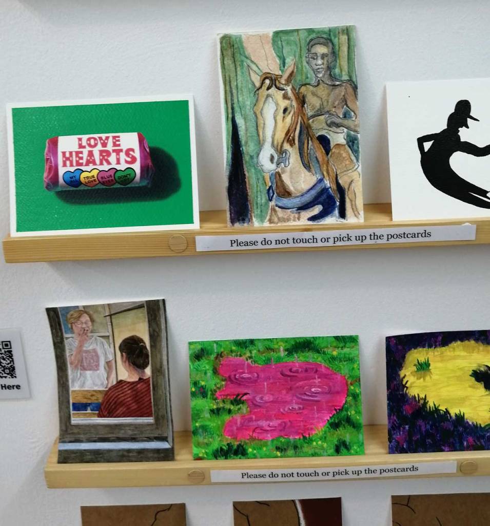 The Art On A Postcard Winter Auction private view at The Bomb Factory, Covent Garden, London, November 8th 2022 – The first thing that strikes as you walk into the very busy Covent Garden gallery is just that how much more alive the paintings and pieces are in here than they are when you view it all on line or indeed in the catalogue, just how bright it all is. An obvious statement you might think but it really does feel exciting in here. Where to look first? There’s quite a (friendly) battle for attention being waged by the five hundred plus paintings up in lines on the shelves on the Bomb Factory walls for this one night only.