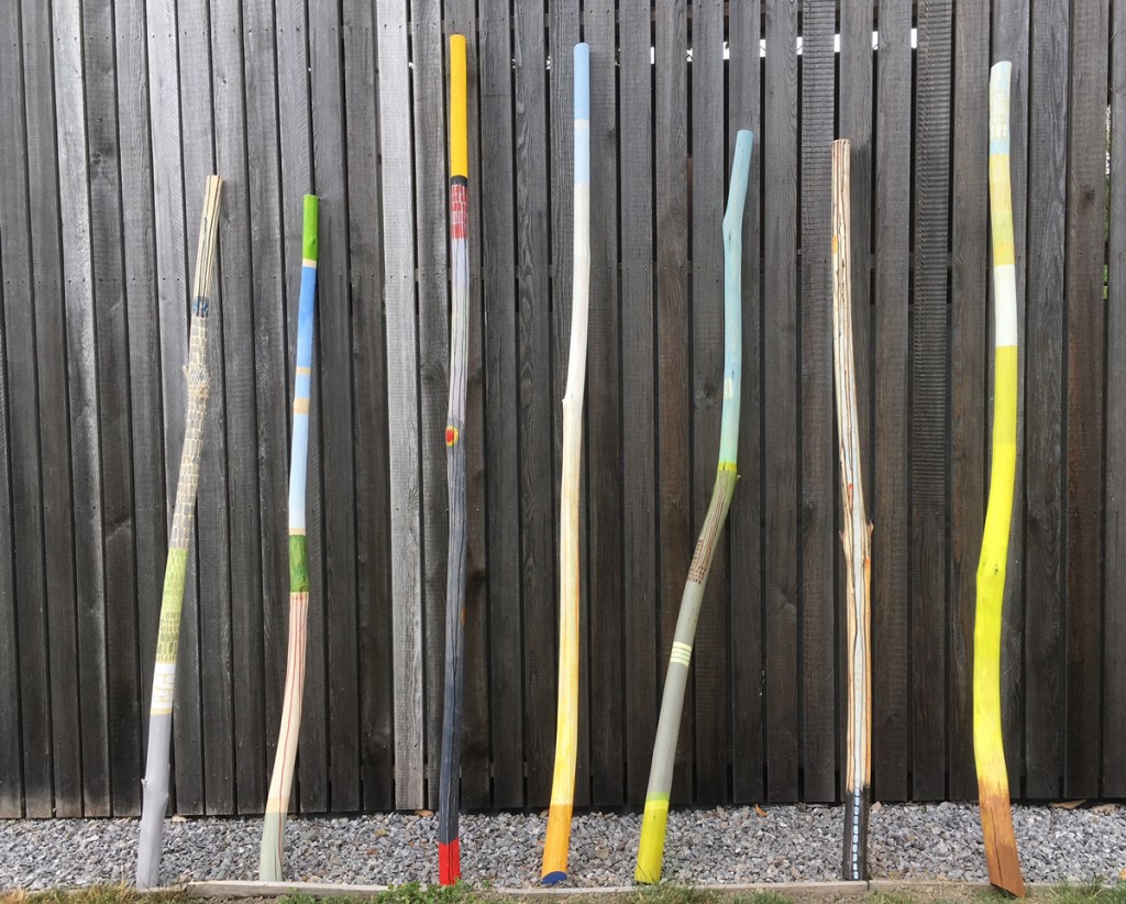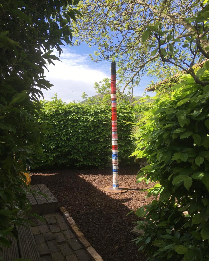 Post Installation planned for 2023 at Adhisthana Buddhist Centre, Coddington, Herefordshire – a series of posts based on the concept of reflecting impermanence. A central striped post will support a series of colours that reflect the changing colours of the seasons. Slices of post will have a ceremonial re-painting at intervals over a one year period, reflecting the surrounding colour palette. http://www.adhisthana.org/