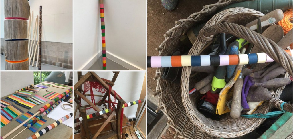 The post exploration was ignited when I discovered the artist Andre Cadere who trained as an abstract painter in Bucharest and moved over to his coloured bars – Barre de bois round “round bar of wood” while being ignored by the art world in Paris in the 1970’s. As an act of defiance he created these coloured wooden bars that he carried over his shoulder wherever he went, to the park, to the cafe and often left leaning at the exit of other artists exhibitions. He then sold them with a certificate of all the places they had been. I made a series of pieces based on Cadere’s bars using colours taken from colour palettes of artists I was inspired by (see Strip Tease) paintings and this in time led to my post homages.
