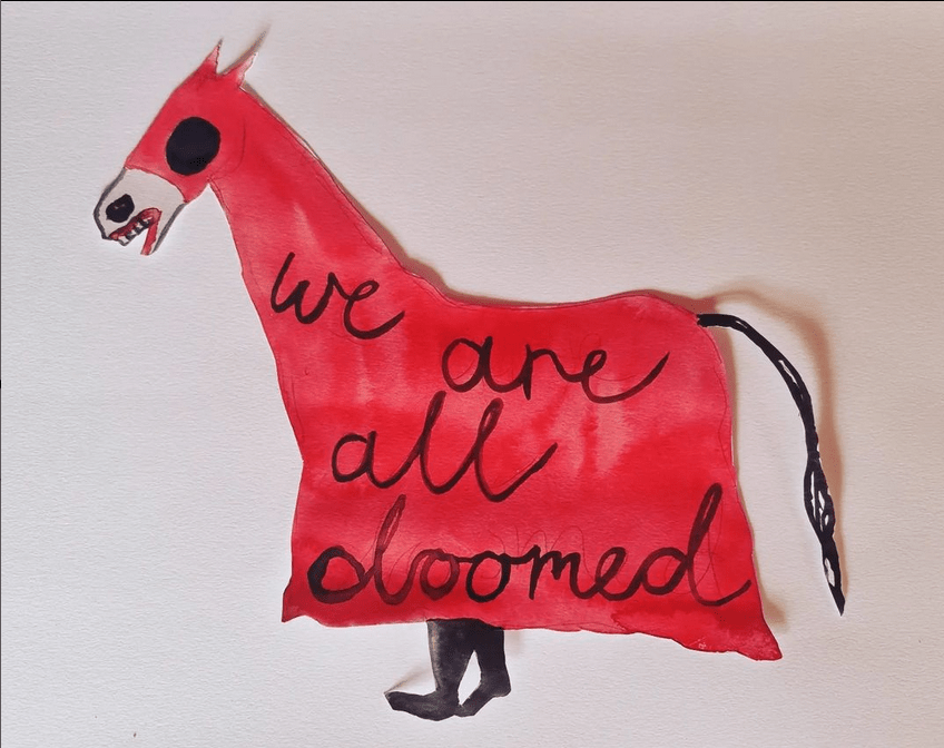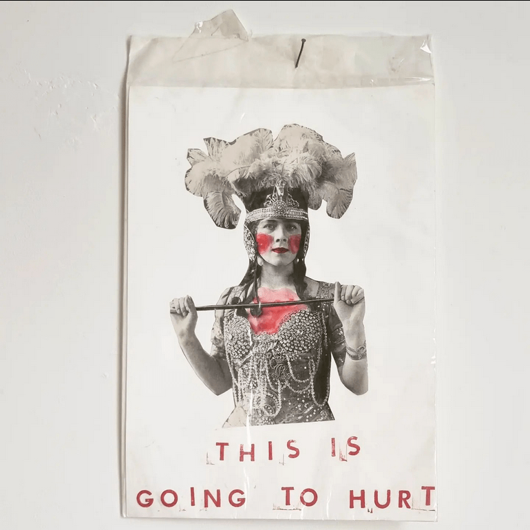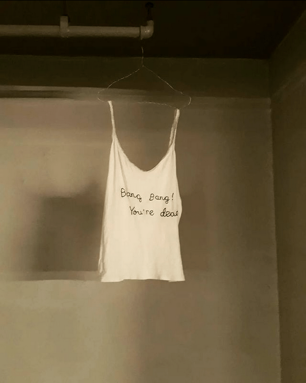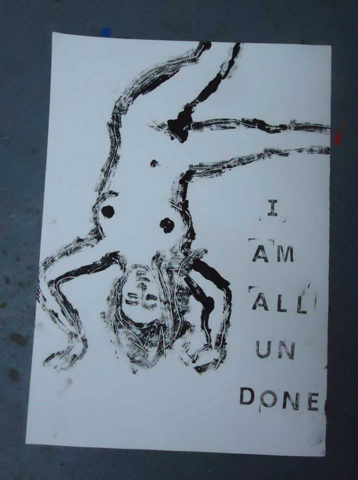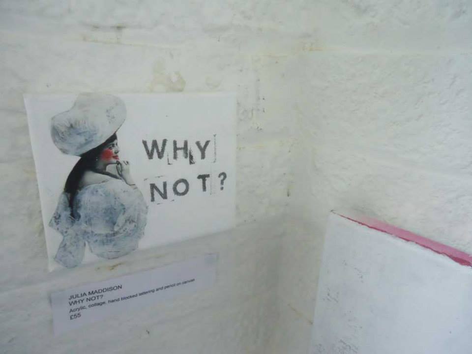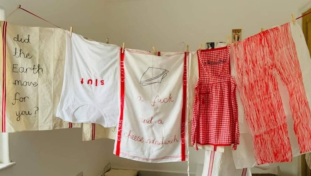 The Thirteen Questions thing again. This time the twelve generic questions, as well as that special thirteenth one, have been fired at an artist who’s ever evolving work and attitude towards her work we have been enjoying for a good few years now. I think Julia Maddison first started showing with us at Cultivate somewhere around 2013, her work hasn’t stopped exciting us or provoking us or questioning us since that first encounter. Amongst other things, Julia recently co-curated that excellent Mother’s Ruin Exhibition at Three Mills in East London and the last time we saw her (via her various social media feeds) she seemed to be running around the isle of Orkney with a crown on her head, surely a rather strange place to choose to be as the Winter starts to attack us? You never quite know what you’re going to get from Julia, there is a definite thread that runs through all her work, a strong and instantly recognisable personality, that oh so vital finger print of almost defiant identity that runs through her installations, her hangings, her hand-embroidered tea towels that say so much in such a pinpoint less-is-more kind of way. A creative defiance that runs through the commentary of her mono prints, through her words stitched onto underwear, painted on canvas, sprawled on gallery walls, on crowns that float away in the sea. For the last ten or so years Julia Maddison has been one of the more consistently exciting contributors to the artist-led London art scene. She, like so many others, has left the capital now, probably chased out, priced out, as so many have been. When she’s not in Orkney, she is mostly based in Hastings these days. Julia has just appeared in both editions of Cultivate’s Mixtape online art show, (Cultivate and Organ are closely related of course), Mixtape No.2 opened a couple of days ago and to tie in with the second Mixtape group show, we fired thirteen questions at Julia Maddison, here is how she answered, do like the sound of that film….