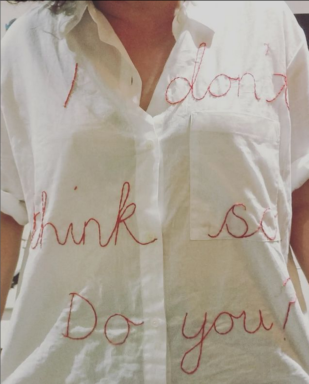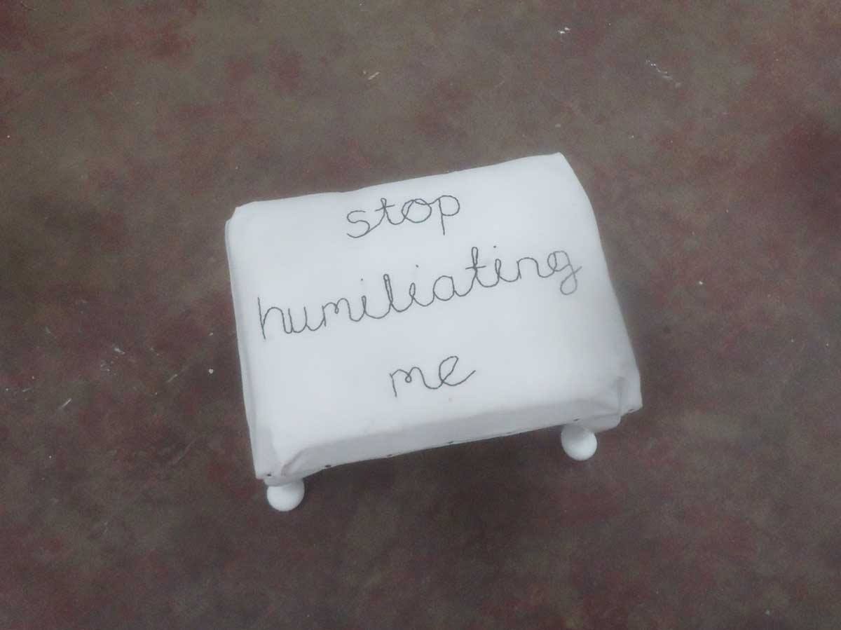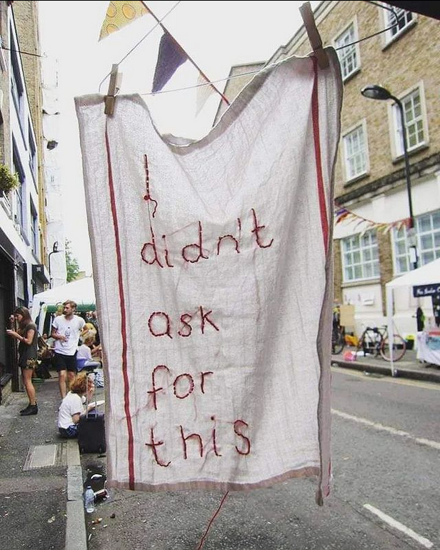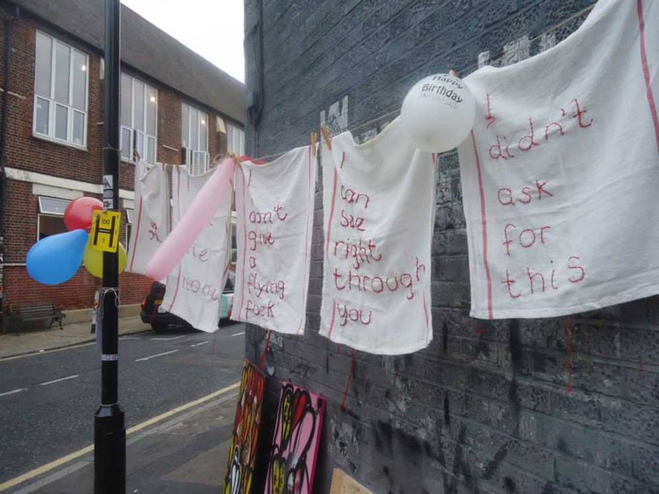 The Thirteen Questions thing again. This time the twelve generic questions, as well as that special thirteenth one, have been fired at an artist who’s ever evolving work and attitude towards her work we have been enjoying for a good few years now. I think Julia Maddison first started showing with us at Cultivate somewhere around 2013, her work hasn’t stopped exciting us or provoking us or questioning us since that first encounter. Amongst other things, Julia recently co-curated that excellent Mother’s Ruin Exhibition at Three Mills in East London and the last time we saw her (via her various social media feeds) she seemed to be running around the isle of Orkney with a crown on her head, surely a rather strange place to choose to be as the Winter starts to attack us? You never quite know what you’re going to get from Julia, there is a definite thread that runs through all her work, a strong and instantly recognisable personality, that oh so vital finger print of almost defiant identity that runs through her installations, her hangings, her hand-embroidered tea towels that say so much in such a pinpoint less-is-more kind of way. A creative defiance that runs through the commentary of her mono prints, through her words stitched onto underwear, painted on canvas, sprawled on gallery walls, on crowns that float away in the sea. For the last ten or so years Julia Maddison has been one of the more consistently exciting contributors to the artist-led London art scene. She, like so many others, has left the capital now, probably chased out, priced out, as so many have been. When she’s not in Orkney, she is mostly based in Hastings these days. Julia has just appeared in both editions of Cultivate’s Mixtape online art show, (Cultivate and Organ are closely related of course), Mixtape No.2 opened a couple of days ago and to tie in with the second Mixtape group show, we fired thirteen questions at Julia Maddison, here is how she answered, do like the sound of that film….