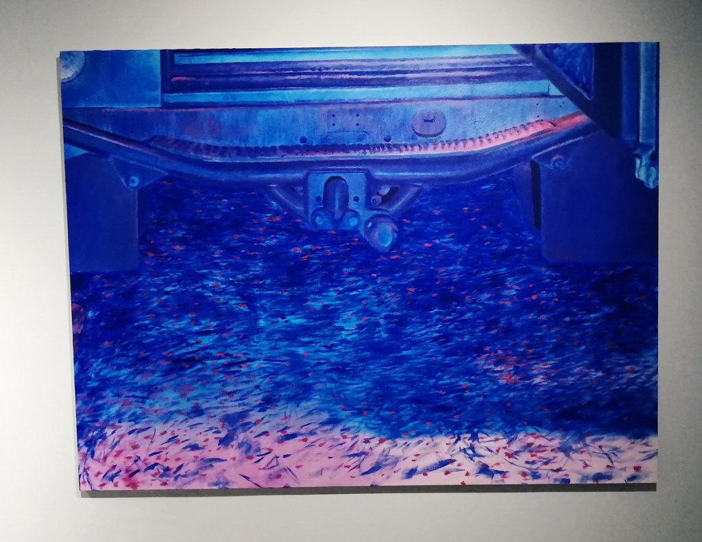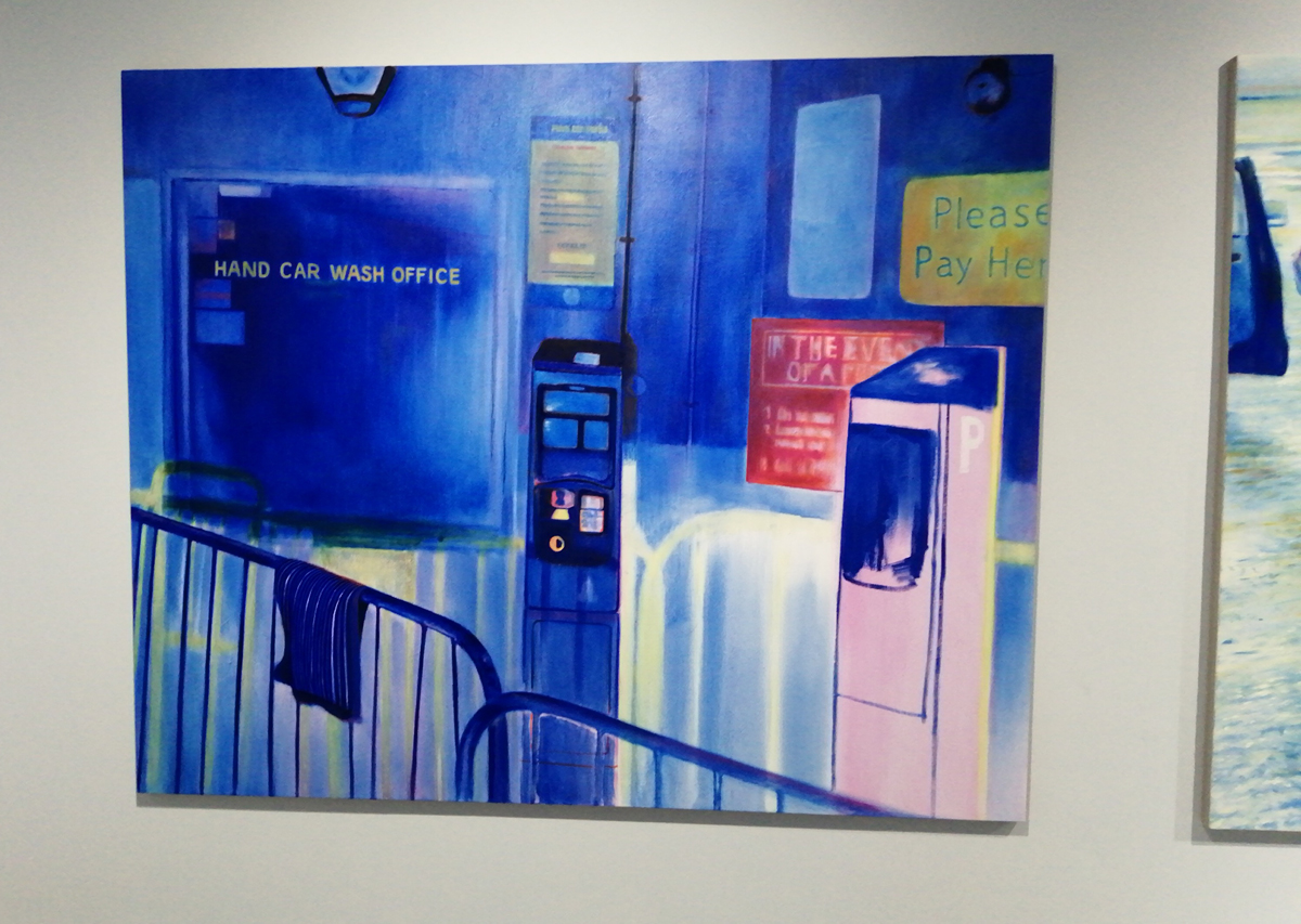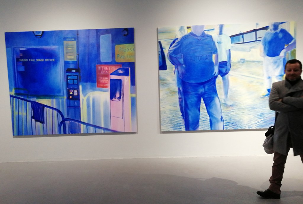 Oh the stories that could be told about times under the Westway, of people, gigs, junk stalls, riots. Yes, a transient place, transient spaces, people, ever evolving, moving on and there is that feeling instantly in Wolke’s paintings, in her big bold works, in her stylisation, in that blue, that ultramarine blue with the occasional flash of lemon yellow, a set of painted red nails. It doesn’t really say Westway, it could be anywhere in London where those old caves (those railway arches) are, where those cafes and taxi repair shops are, where people live and work in the reality of it all, and yes it is voyeuristic, these paintings are voyeuristic. Those red finger nails, the overweight men in what look like football shirts, certainly not players, waiting for something to kick off though? Rangers maybe? Old Chelsea heads? London calling to the imitation zone, Forget it, brother, you can go it alone. I like these pieces, this collection, I suspect thy really need to be seen as one body of work, one strong statement all together, the entire experience, all that blue, all that ultramarine (except for that one with the yellowy eye), I like this technique, I like how this all works, I like these film stills. I like this…