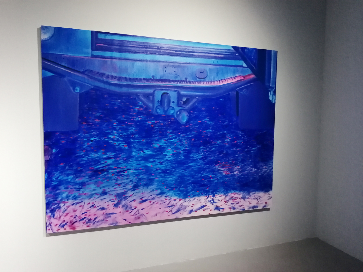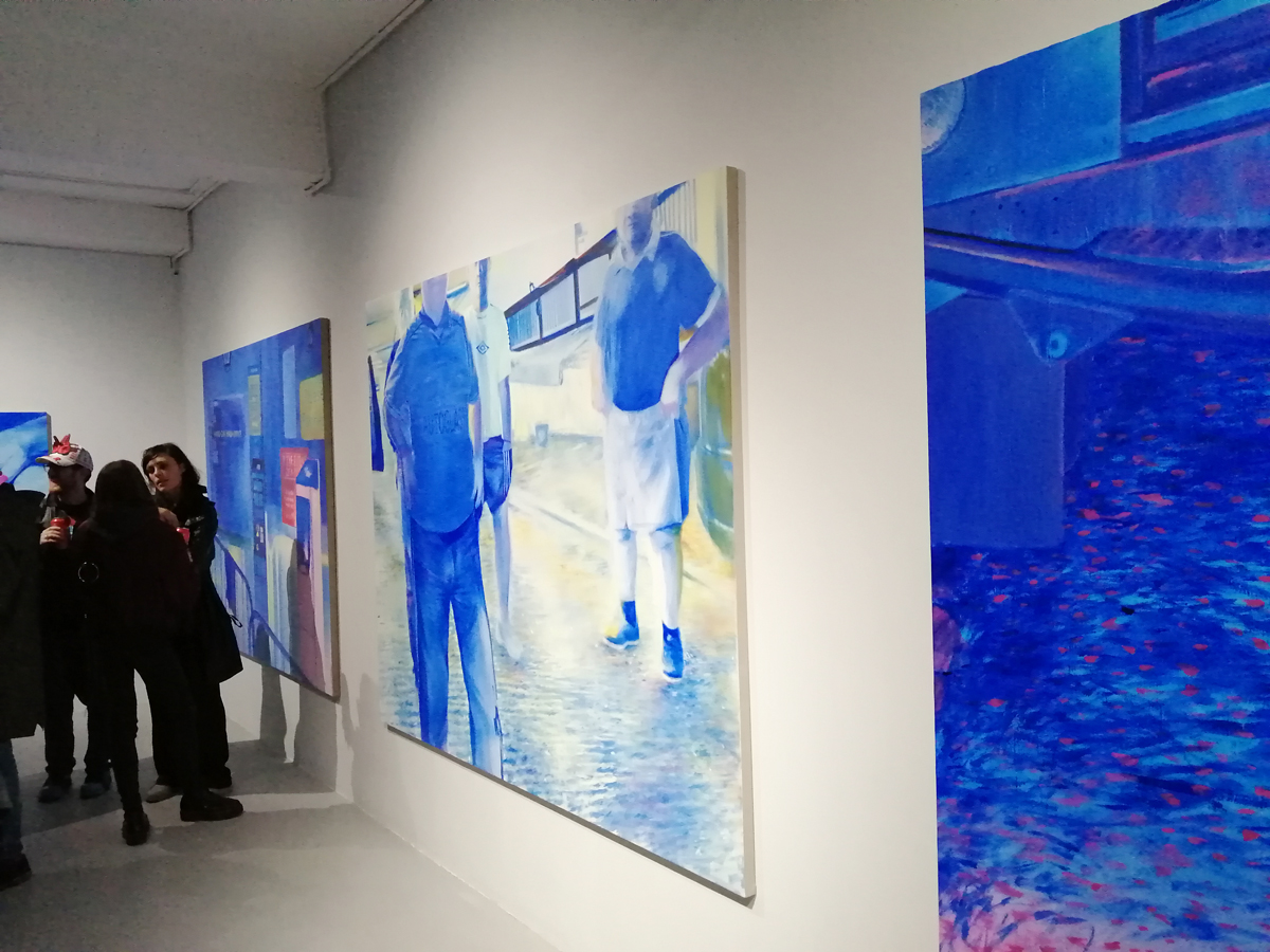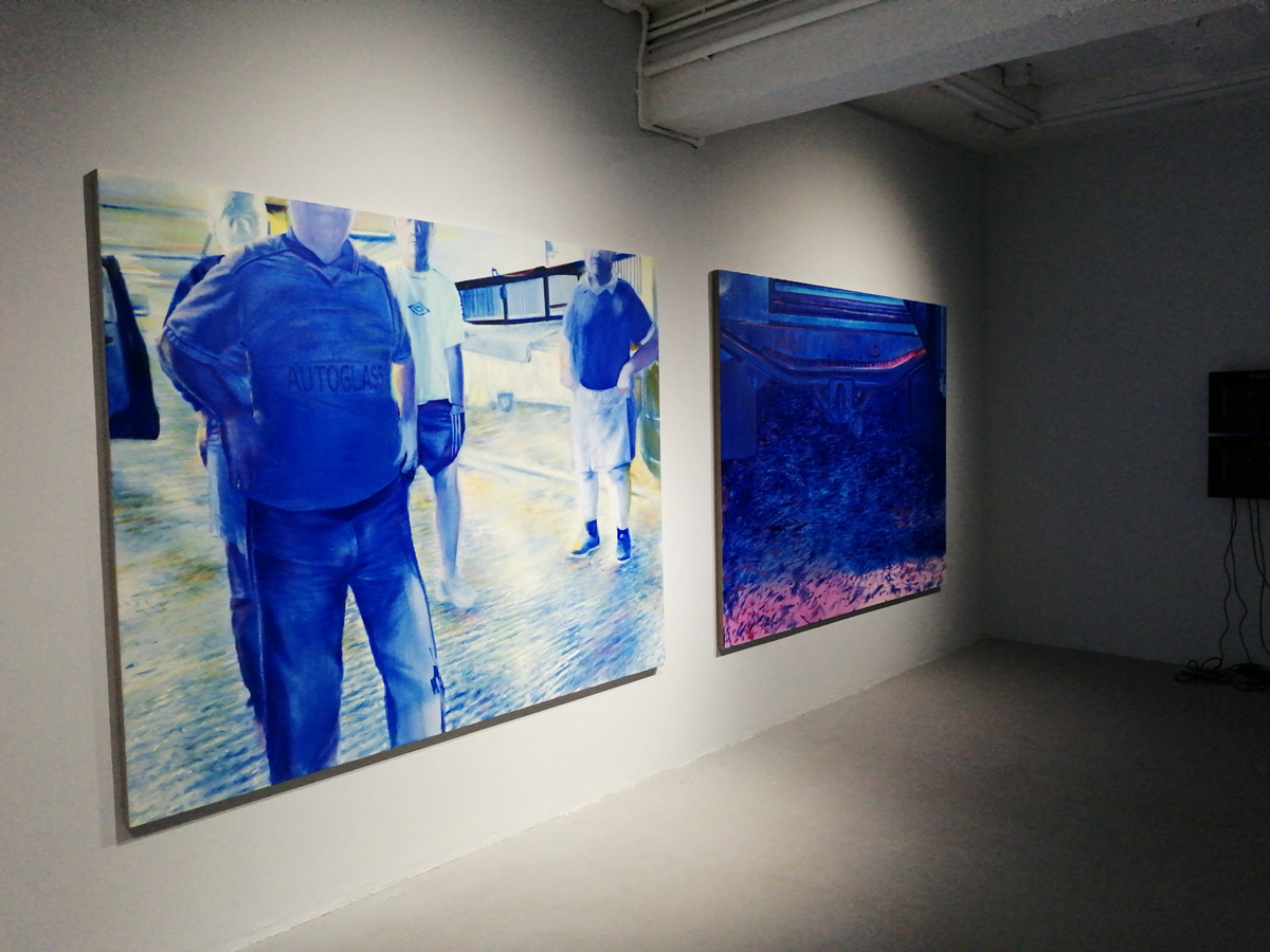 The paintings are big, they’re bold, they’re blue, petrol blue? A cold blue? Ultramarine observations, film stills? “Working from footage and photographs taken during the aforementioned happenings, Wolke primed her new paintings with a mix of gesso and construction sand to create a granular surface that evokes the aspect of low-quality images taken with high ISO, which on photographs generates an impression of grain, also known as noise. The artist then worked through thin layers of oil paint, only using a limited number of hues, including ultramarine blue, yellow, magenta and Cadmium orange. Applied ‘straight out of the tube’, the intensity of these colours recalls the artificiality of digital imagery, as well as the saturated lighting of film sets”.