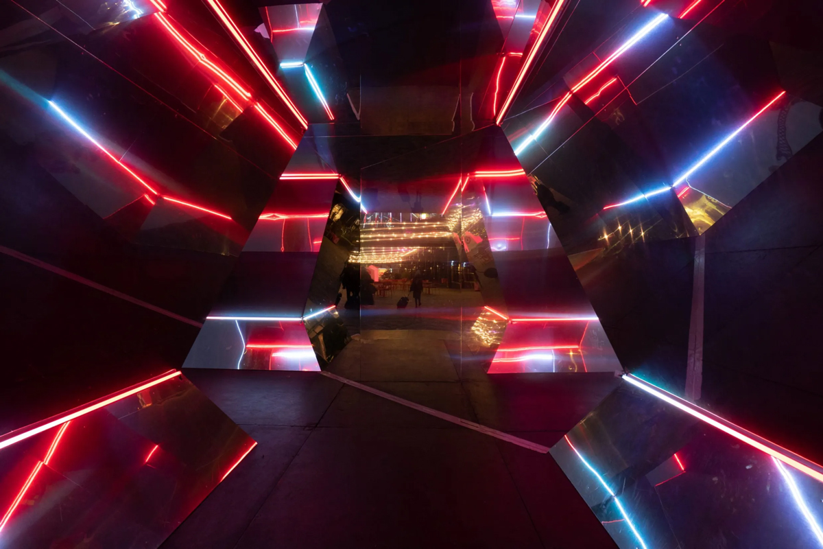 This meditative installation of light and sound will be at Canary Wharf, immersing the audience in a moment of escape from the bustling reality around them. Lumby and Hayes have incorporated ideas around the positive effects of light on well being, and the combined mood-altering power of light and sound, to provide an open, inclusive and contemplative experience for audiences this winter. The sculpture is a three by ten metre pavilion, open to the sky and punctuated with entrances so audiences can explore inside. Emergence is made up of mirrored, tunnel trapezoids stacked together, like bricks in a wall, to create a stunning visual effect with over 10,000 LED lights woven throughout. In the daylight, the visual effect of Emergence will mirror the sky, buildings and audience, creating a multifaceted reflection of its surrounding environment. Once darkness falls, the sculpture will be animated with a choreographed light show playing across the many-sided mirror to the captivating soundscape.