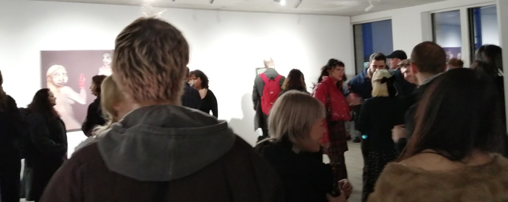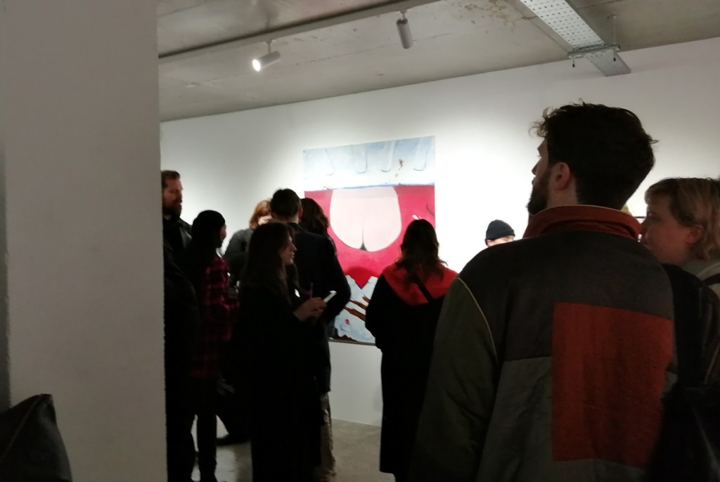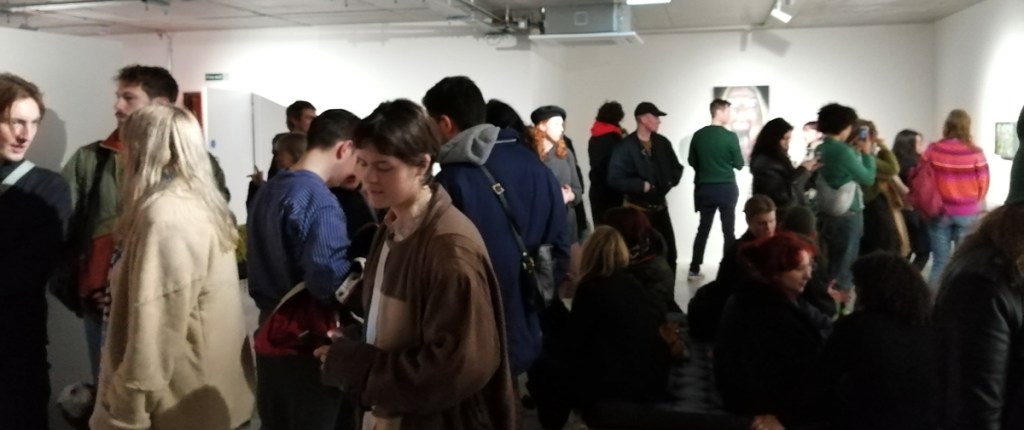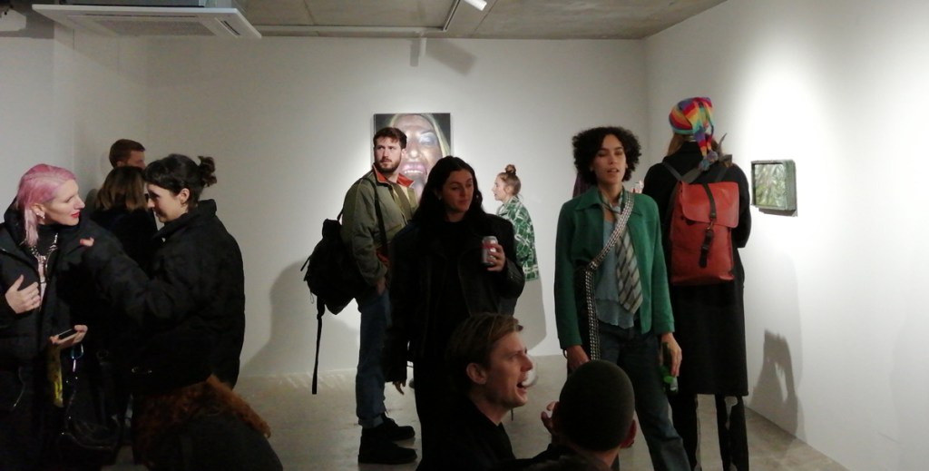 (It’s My Party) I Can Cry If I Want To at Guts Gallery, Hackney, East London , January 2023 – Where were we? Freezing on a JanuaryFriday night in a Hackney backstreet down by the last of the railway arches that are still alive with the old school industry of car mechanics. Guts gallery first came into being just as Covid hit us all, they, like the rest of us involved in art and galleries, have no doubt had a tough time of it over the last couple of years, so yes, it feels good to be heading to a show that looks like it has quite a buzz about it at the start of a new art year. It might be a cold wet night, and Friday is never the greatest of nights for an opening night of an art exhibition but there’s a more healthy crowd heading along the cobbled street – do love this living breathing street – it feels like an event at Guts tonight, an adventure. a party, a proper art show. The gallery is semi hidden up a couple of flights in a new build tower block and tonight is the first night of a new group show, the place is packed, the place is alive.