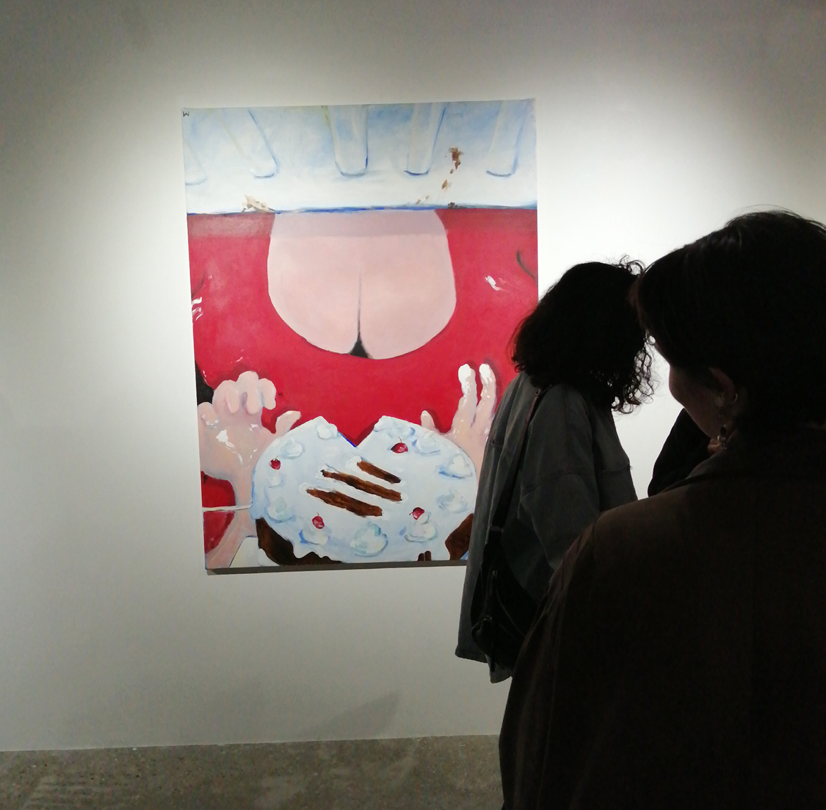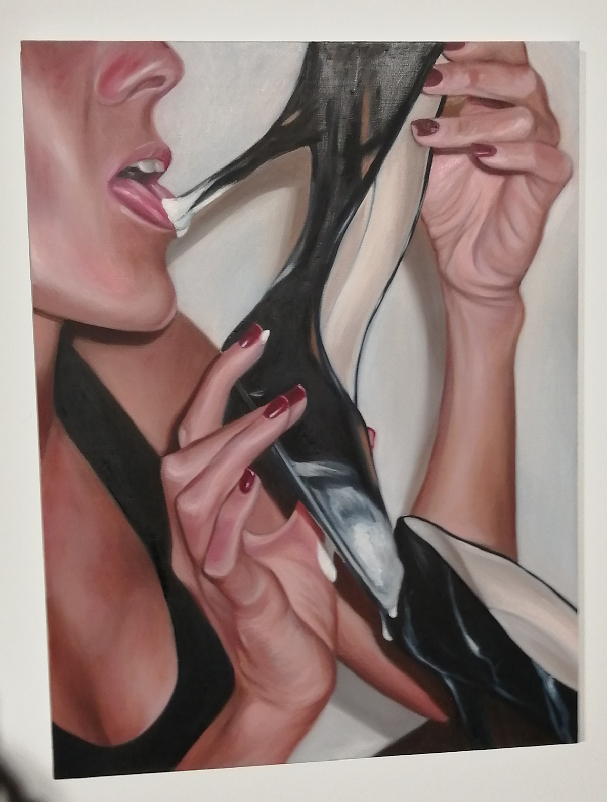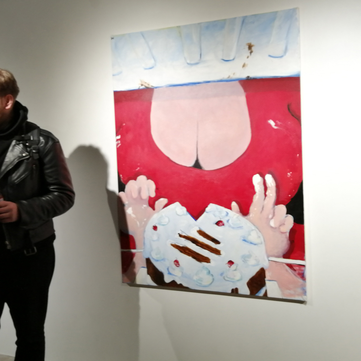 Yes, it is a slightly uncomfortable show in the best of ways, you are challenged as a viewer,(voyeur?). Each piece is given the luxury of space, of white wall, space to breathe, not that it feels like the paintings and pieces would impose on each other in a smaller space, once again the conversations between the works in here are good. No one piece is shouting above the others, there is no battle for attention, it is rather difficult (once again in the best possible way) to pick out a favourite, nothing in here is weak. Are these erotic pieces? they could be? Is it disgust? Does is depend on who ‘s looking or who’s being looked at? It feels very publicly intimate, it feels provoking, it pushes at buttons, at the preconceived notions. The pieces ask questions, Ideas around gender, around behaviour. There certainly a strong collective statement here, something to be devoured, a guilty pleasure? Is it pleasure? is it guilt? is it disgust? Are they wanting to disgust us? Is it disgustingly delicious? There is a collective strength here, each piece demands something, you can’t just politely look, the work demands more of us than just that.
