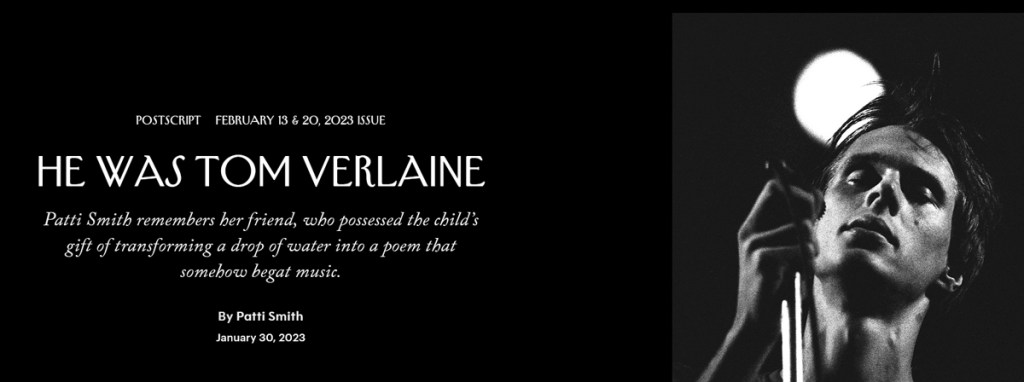 As Steve Albini said on his Twitter feed, “Live your life like Patti Smith will be writing your obit”. for thais what Patti Smith has done, these words by way of a Tome Verlaine obituary have just appeared in the New Yorker…